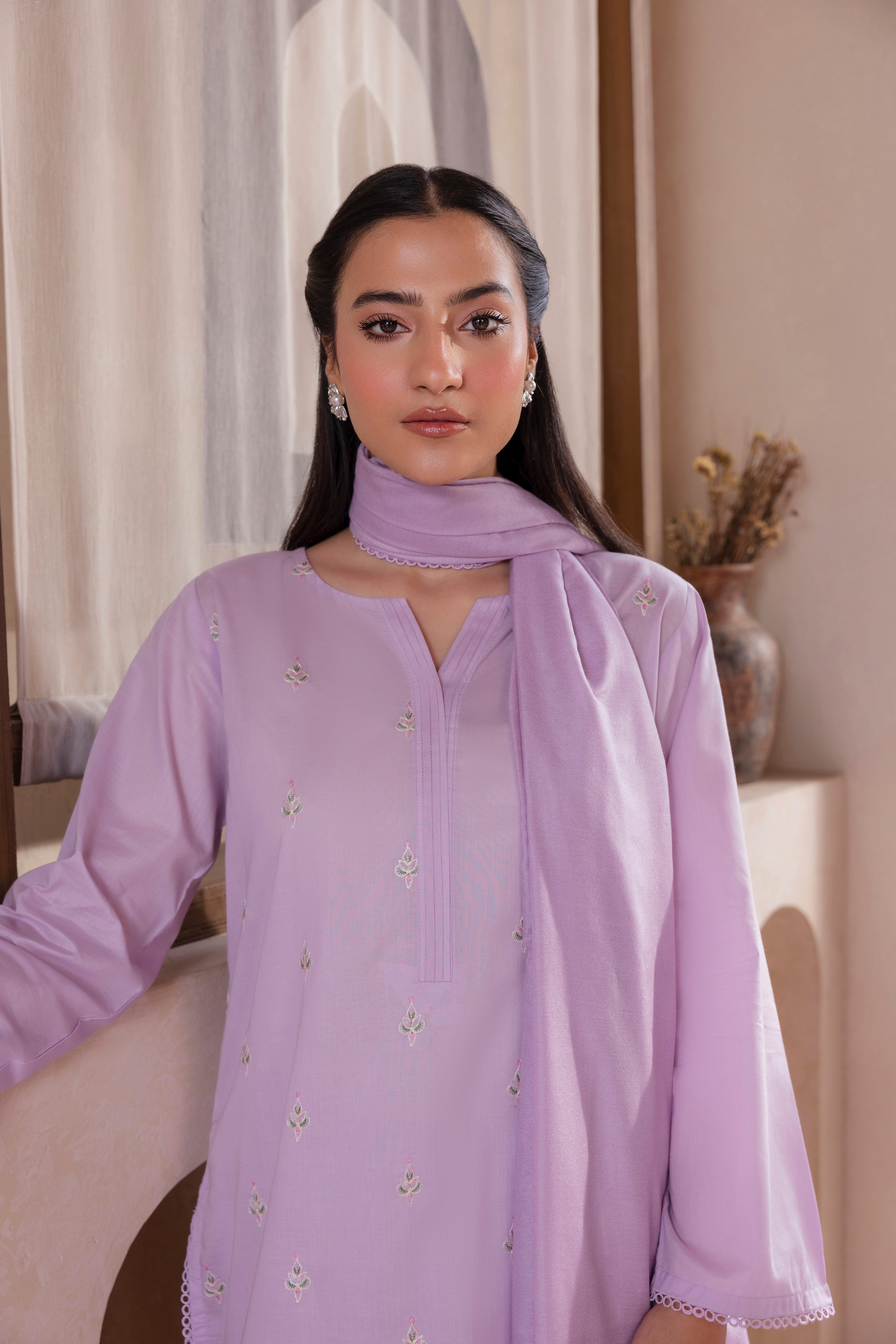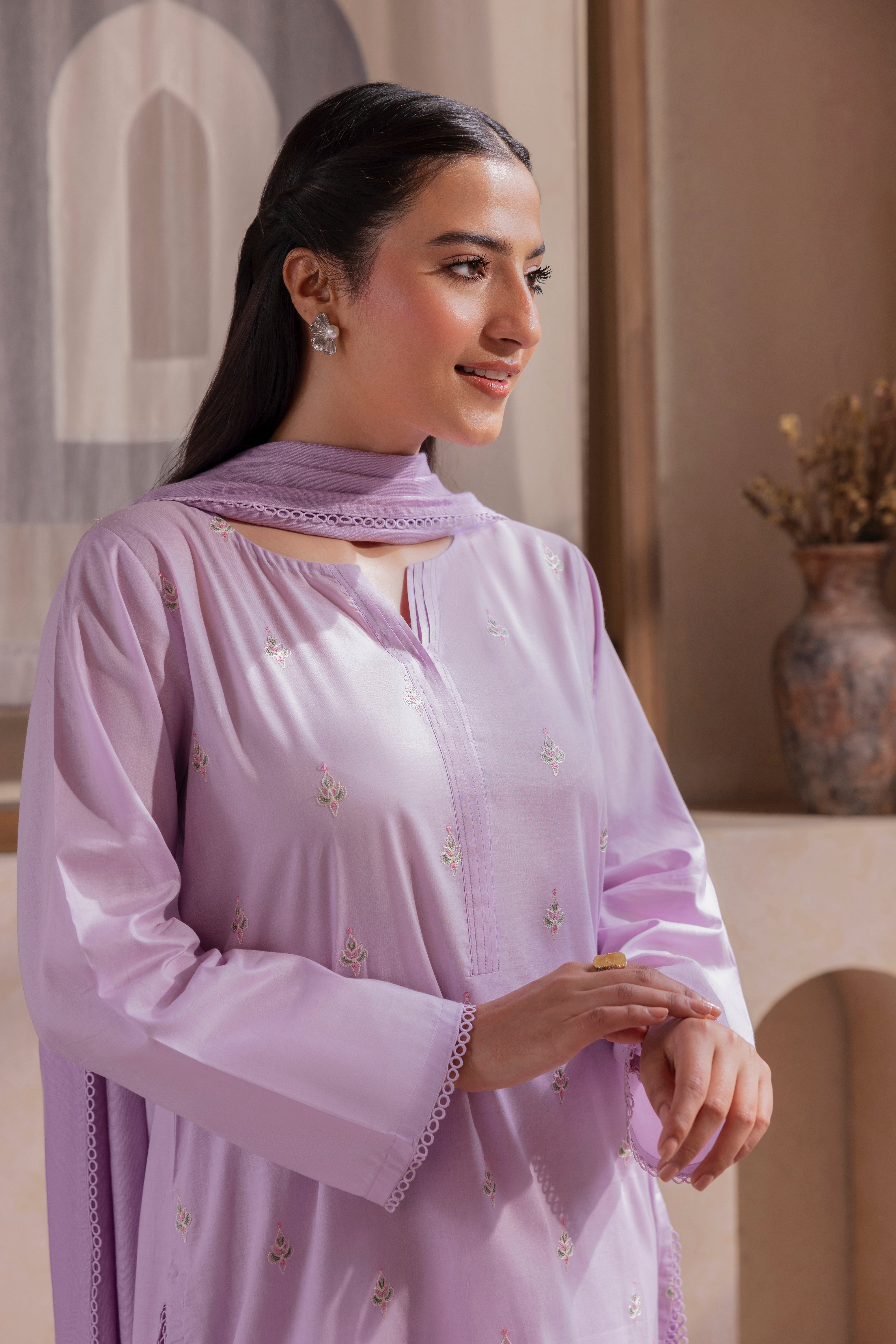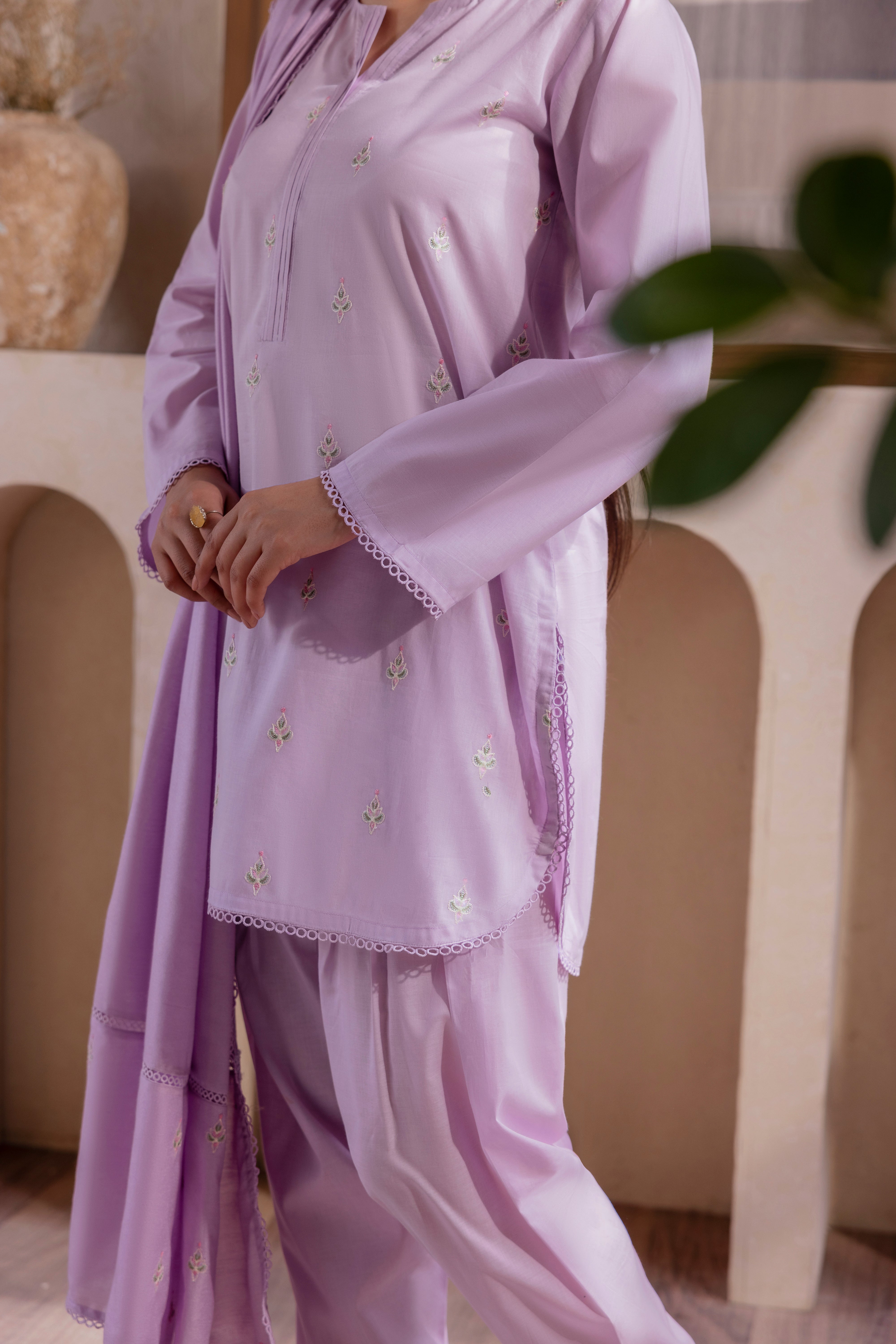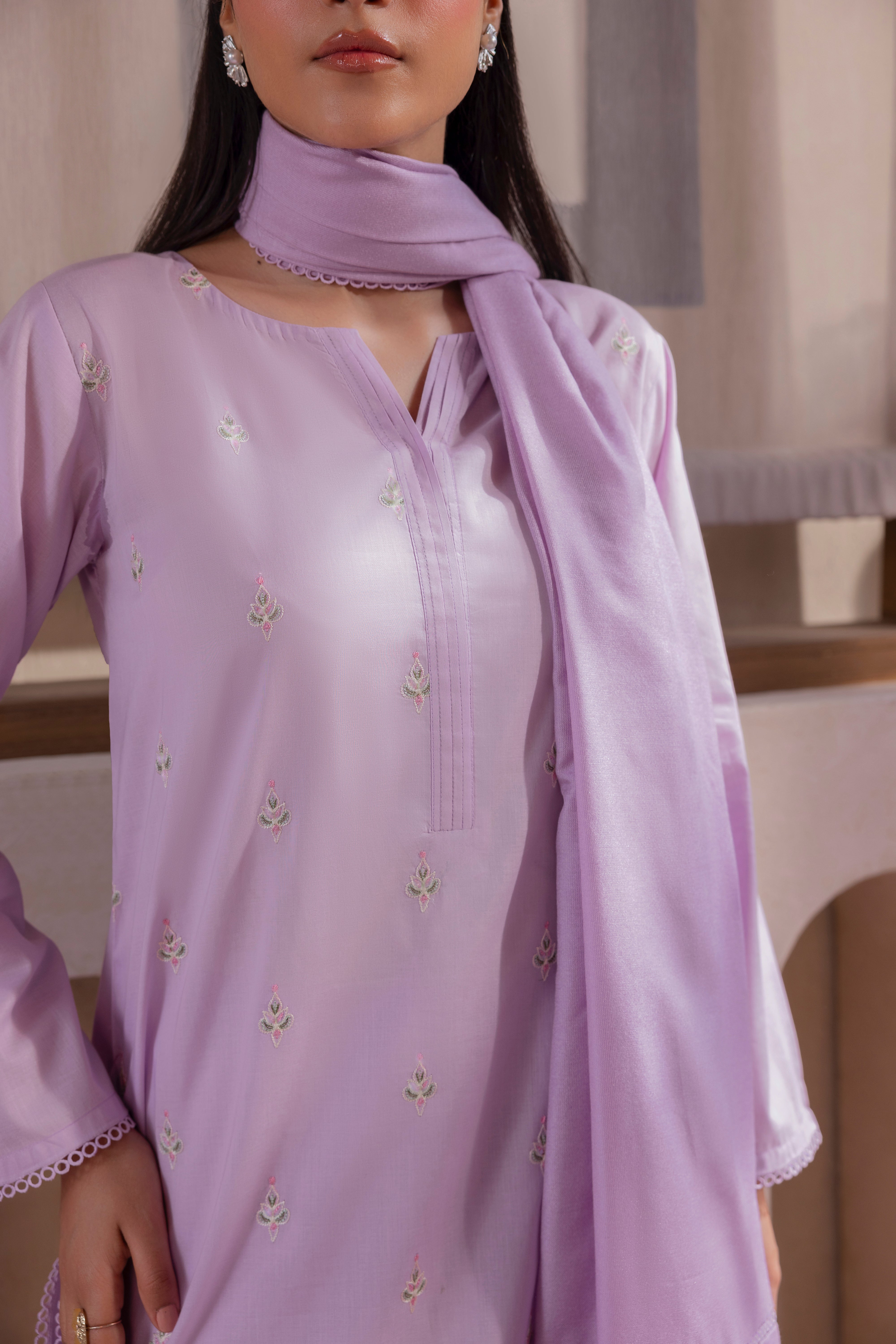 Elevate your summer wardrobe with our lawn Lilac 3-piece suit, featuring delicate embroidery on the shirt and a cotton net dupatta with embroidery on both ends, paired elegantly with a matching lace shalwar. Perfect for infusing charm and vibrancy into your summer looks.