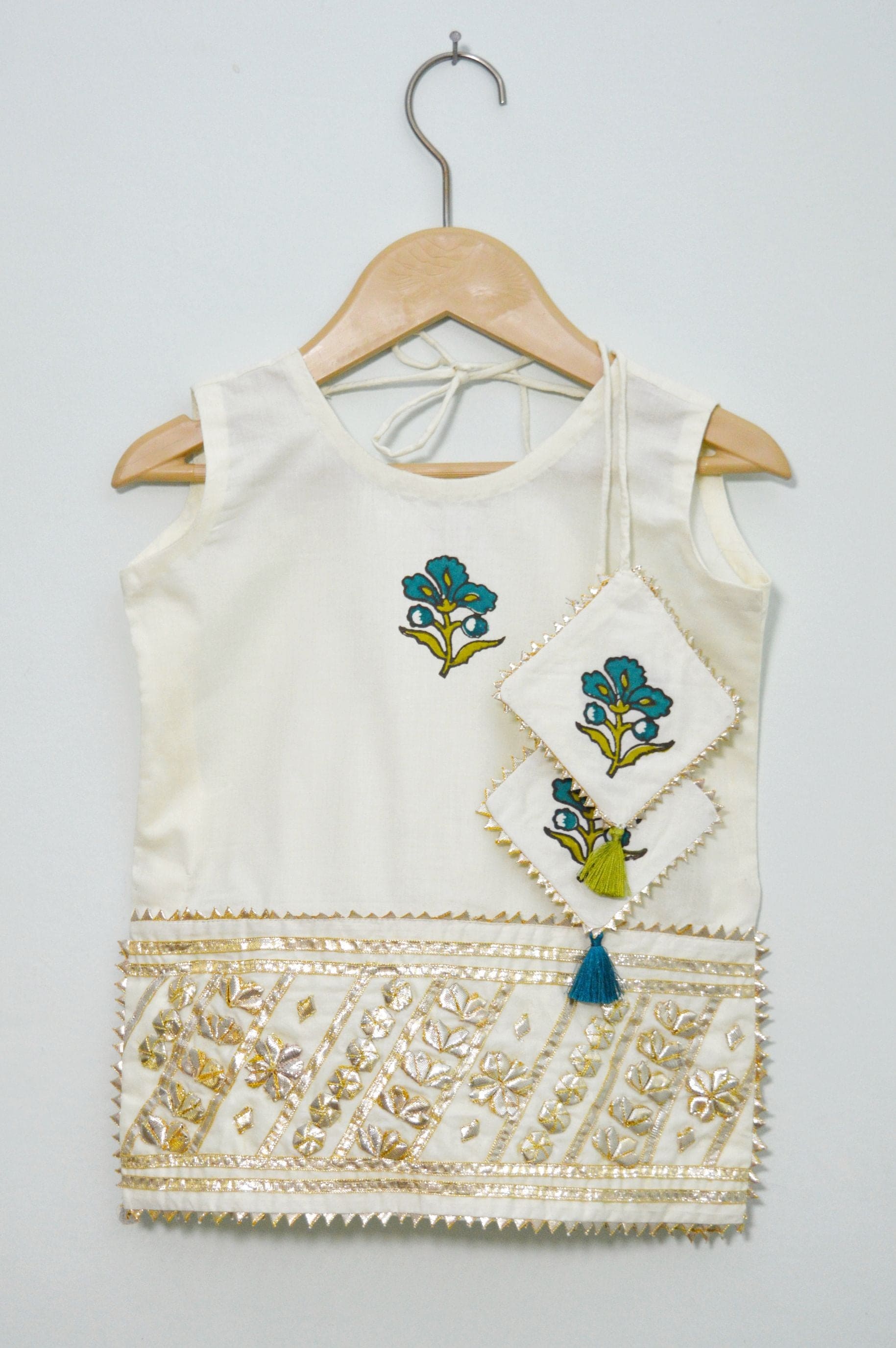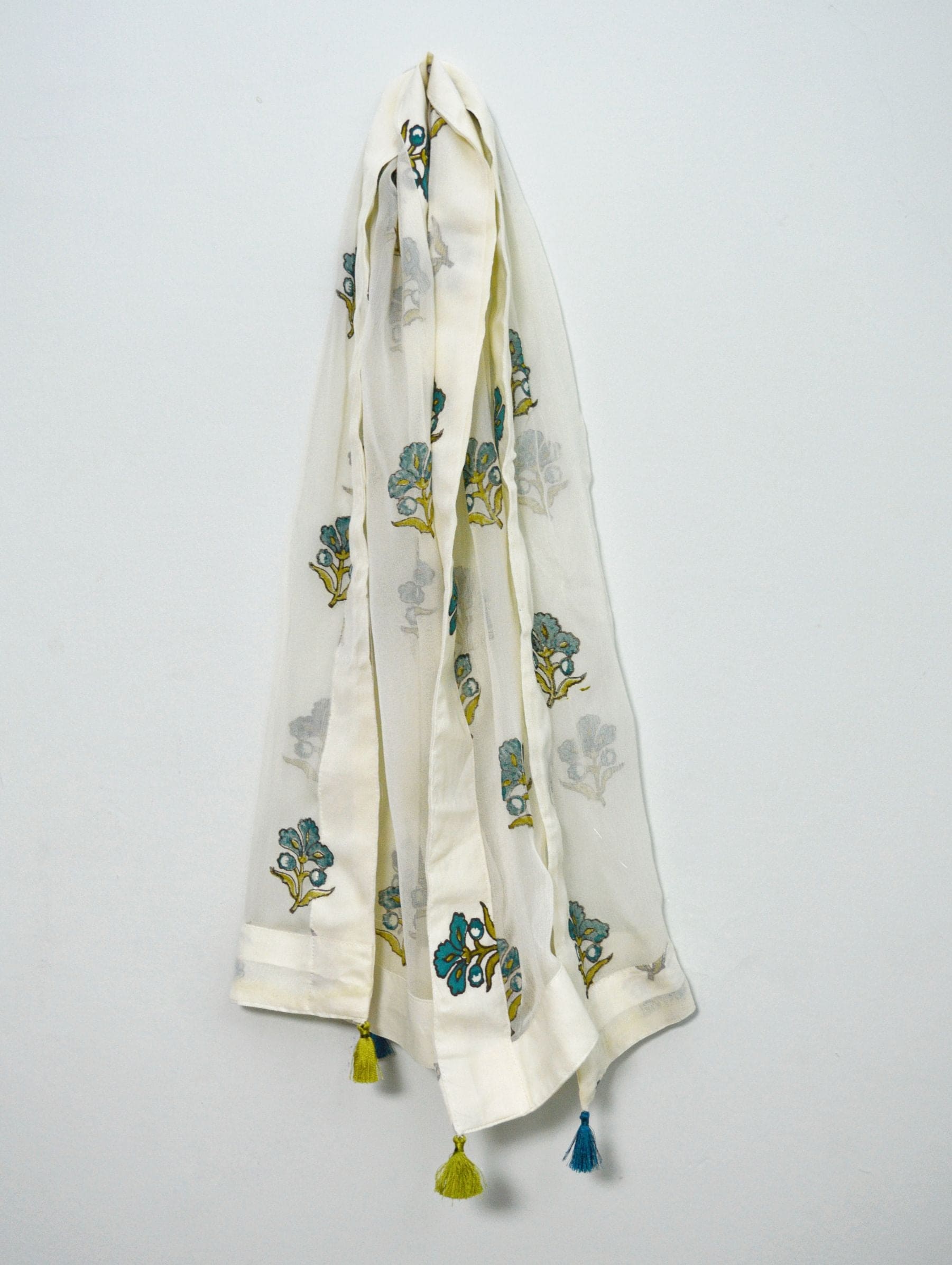 A mesmerizing combination of teal blue and mehndi blockprint on an offwhite milky base, perfect for day festive occasions.
