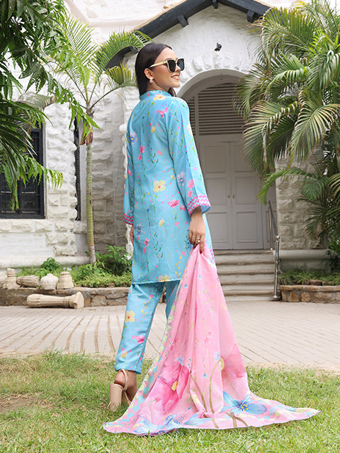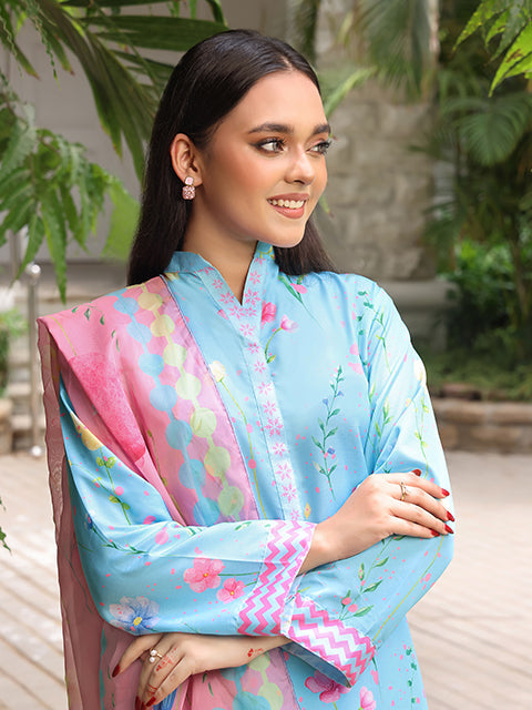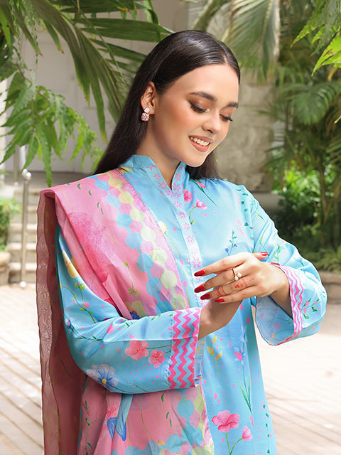 Discover Loquacious: Swiss Lawn with a light blue base, overall pink and yellow floral print, printed pink shirt border, and a soft silk dupatta with a pink base and floral prints. Ideal for a charming and delightful outfit!
