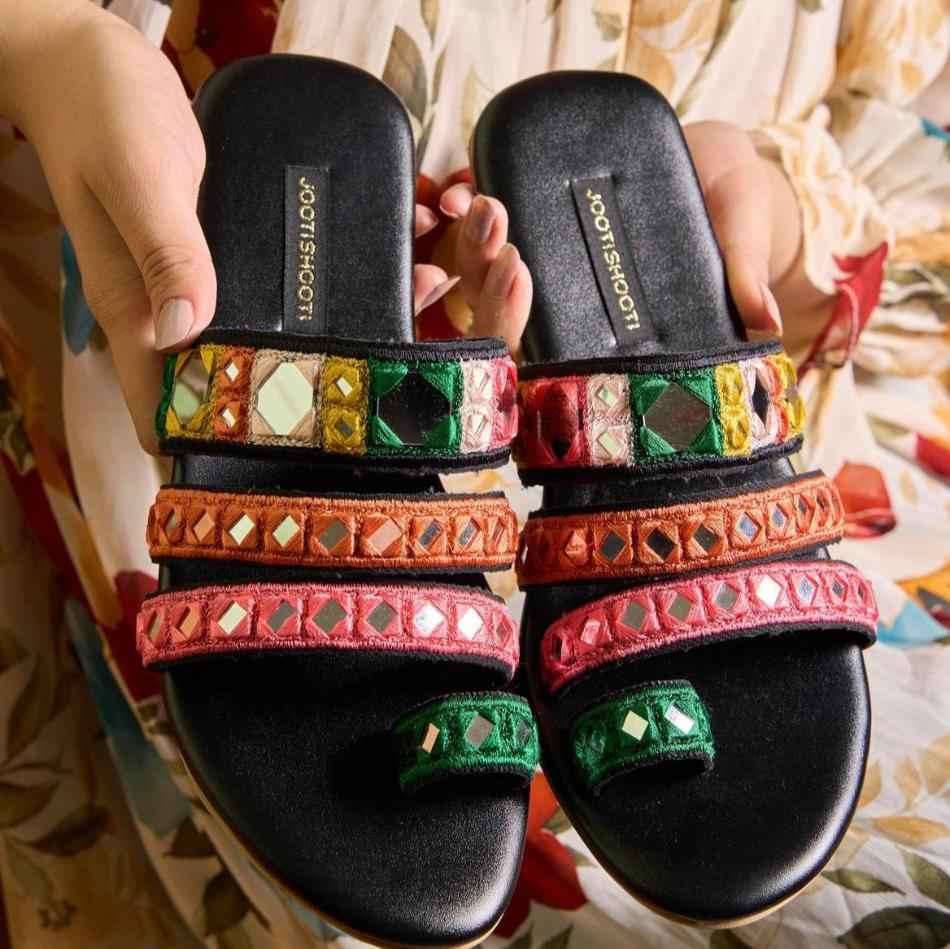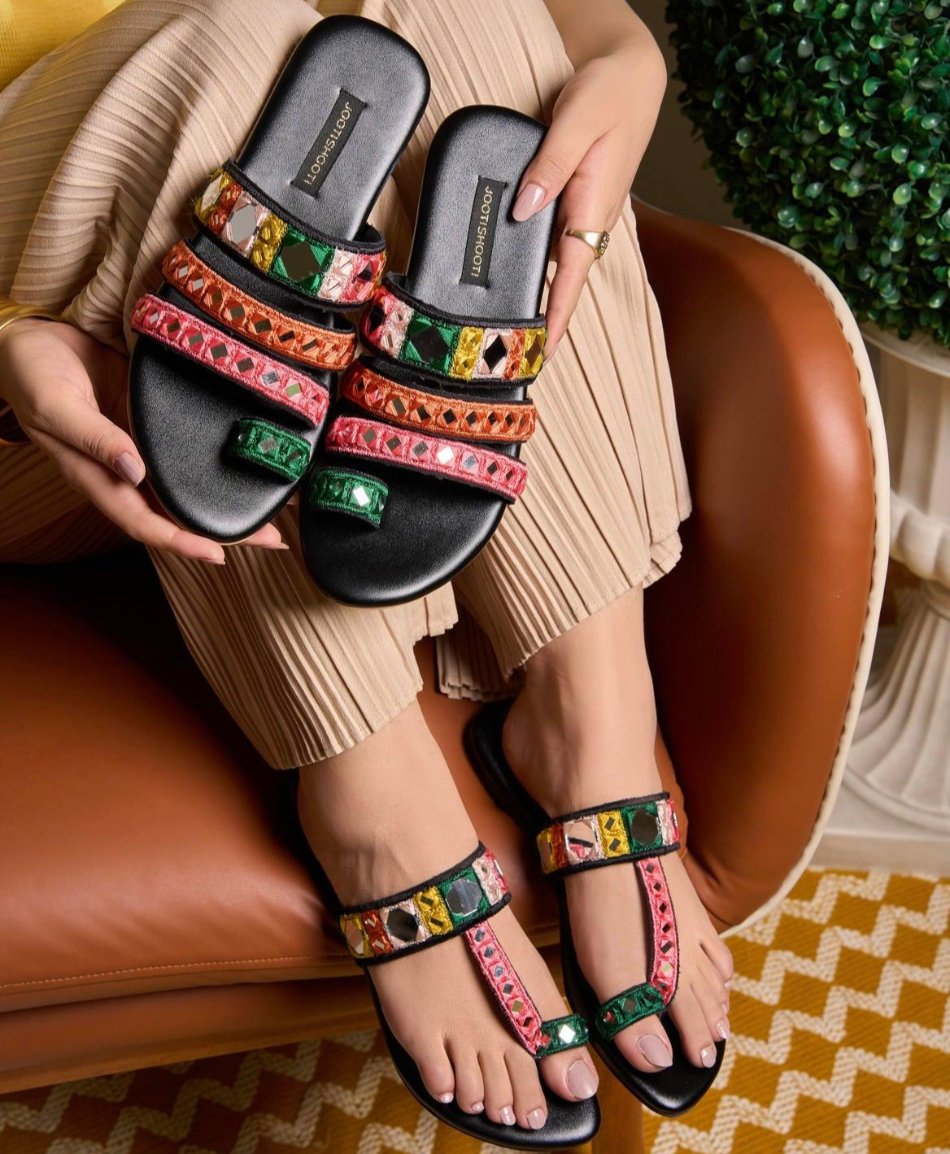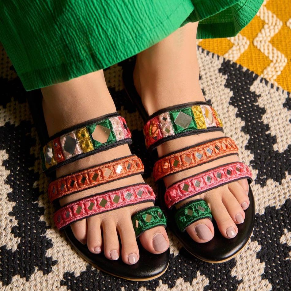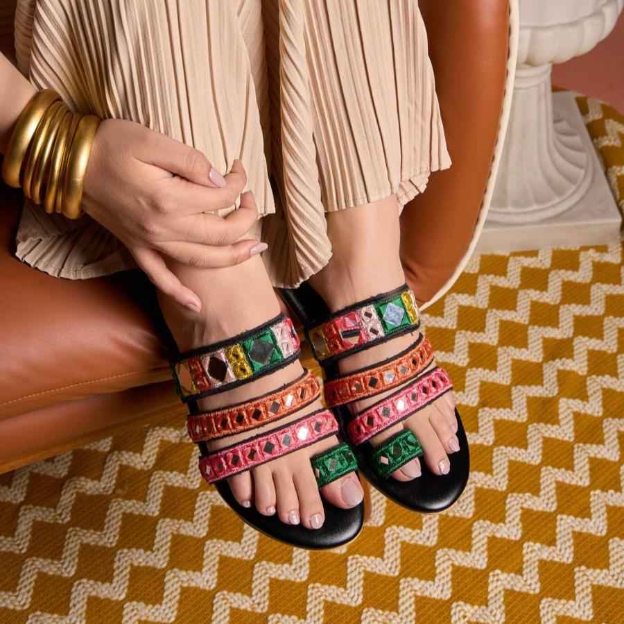 Add a touch of exotic glamour to your loungewear routine with our Tribal Oasis Slipper, featuring a sleek black background, vibrant tribal embroidery, and shimmering mirrors. These slippers are designed to make a statement while keeping your feet cozy and comfortable.