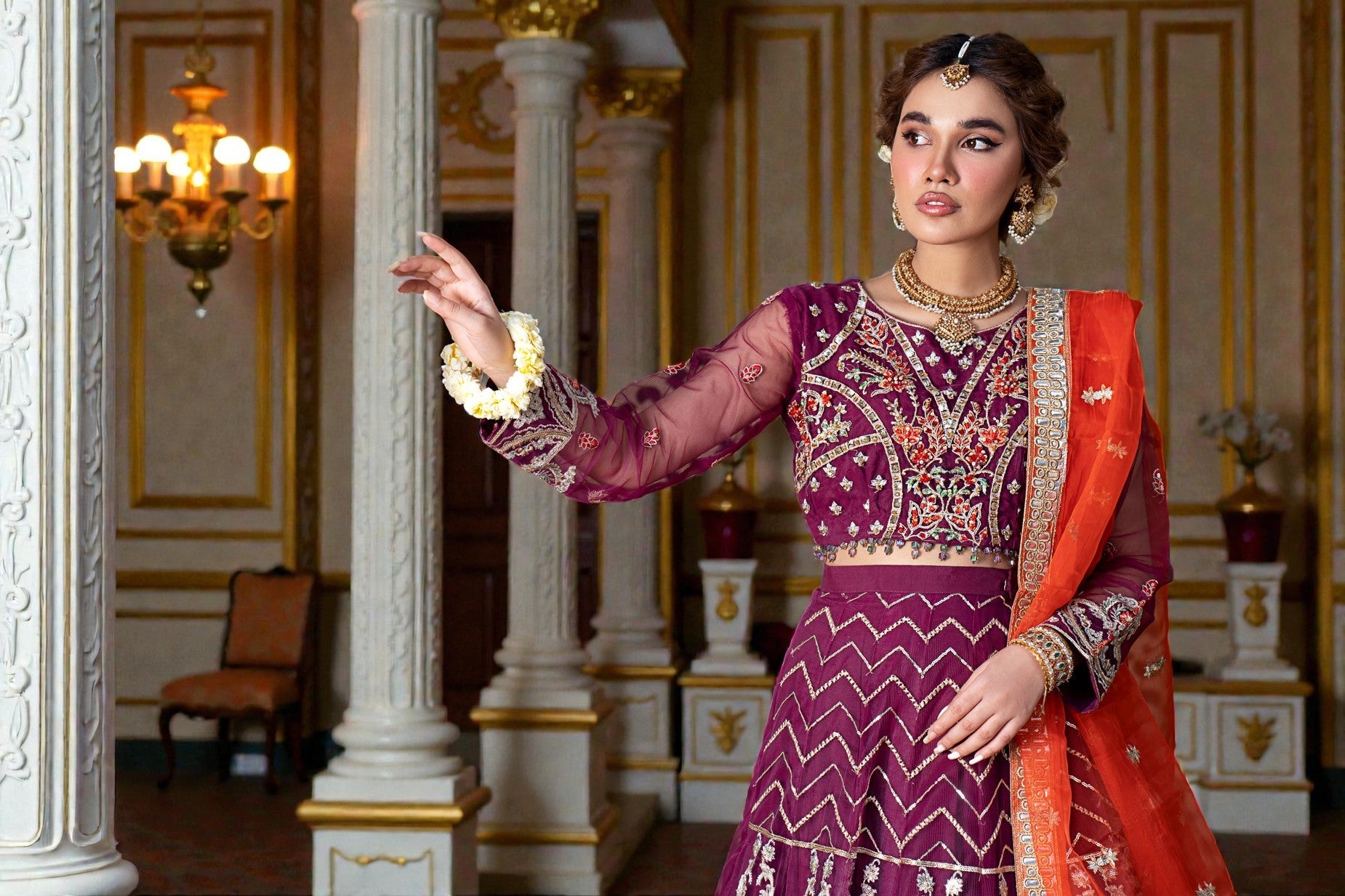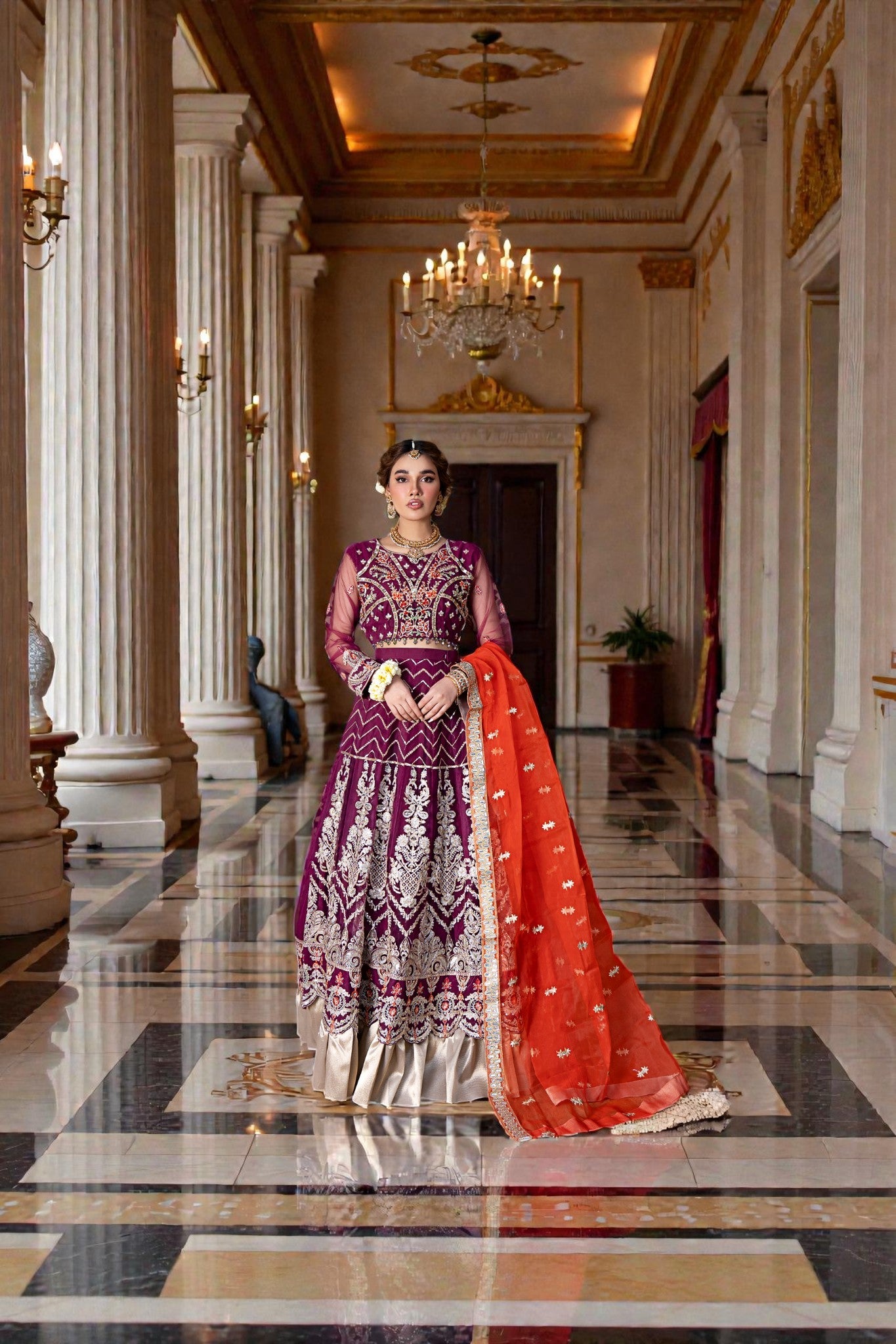 Embroidered Lehenga Front Kaliya (Net) 8pcs Embroidered Lehenga Back Kaliya (Net) 1pcs Embroidered Front,Back Motif (Net) 16pcs Dyed Lehanga Inner (Grip) 5Yrds