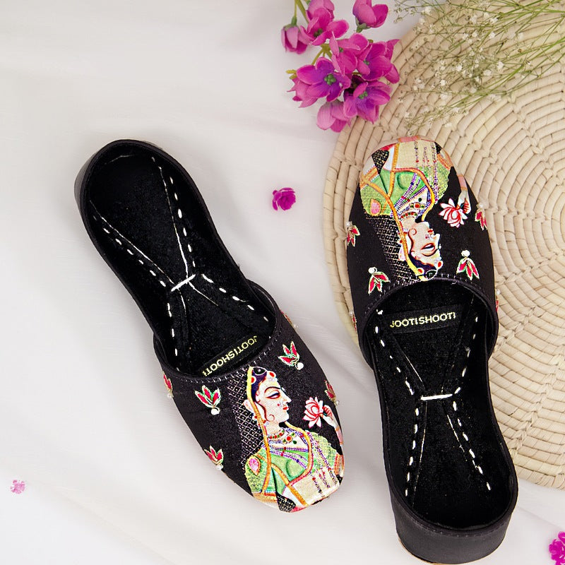 Experience the elegance of traditional artistry with our "Maharani" Nawabi Khussas. This handcrafted pair features intricate embroidery depicting Maharani figure, adding a touch of cultural richness and sophistication to your footwear. The deep black interior ensures comfort and complements the detailed artwork. Perfect for those who appreciate unique, handcrafted pieces that tell a story.