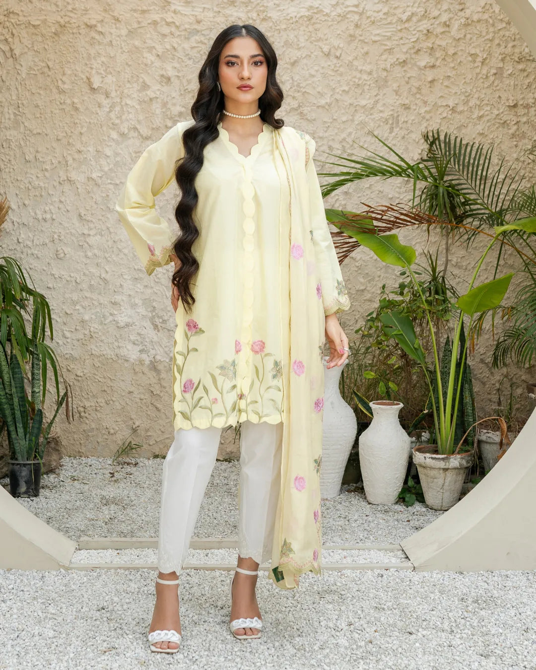Elevate your wardrobe with this exquisite premium Swiss lawn ensemble, adorned with delicate embroidery, shimmering sequin work, and intricate scallop detailing. The finely embroidered Swiss lawn shirt offers a perfect blend of elegance and sophistication, enhanced by glistening sequins that add a subtle sparkle. A luxurious silk dupatta drapes beautifully, complementing the outfit with its soft sheen, while the coordinated lawn trouser ensures a polished and graceful silhouette. This ensemble is an embodiment of timeless charm, ideal for festive gatherings, formal events, and sophisticated daytime wear.