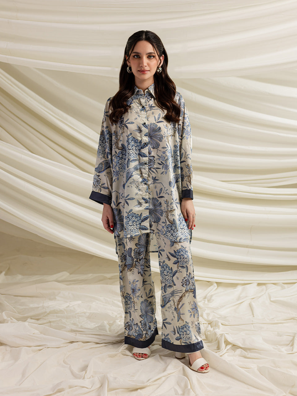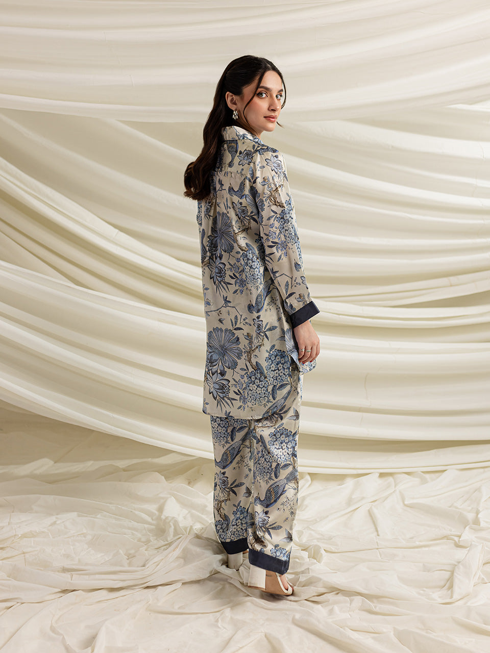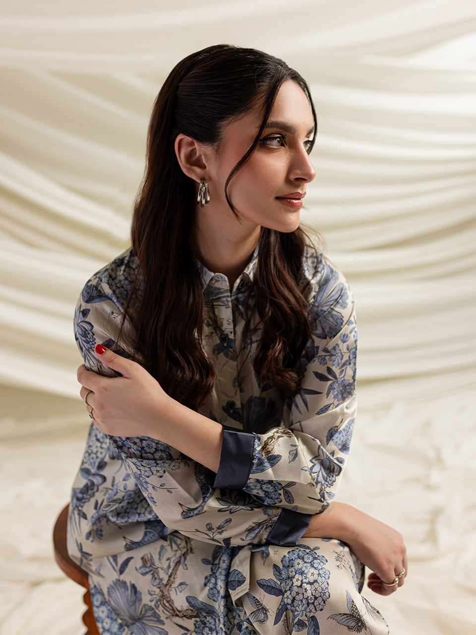 Description: This silk outfit features a serene blue floral pattern on a creamy background with a relaxed-fit tunic and wide-legged pants. The mandarin collar and contrasting cuffs add a sophisticated touch, making it ideal for both daytime and evening events with timeless elegance.