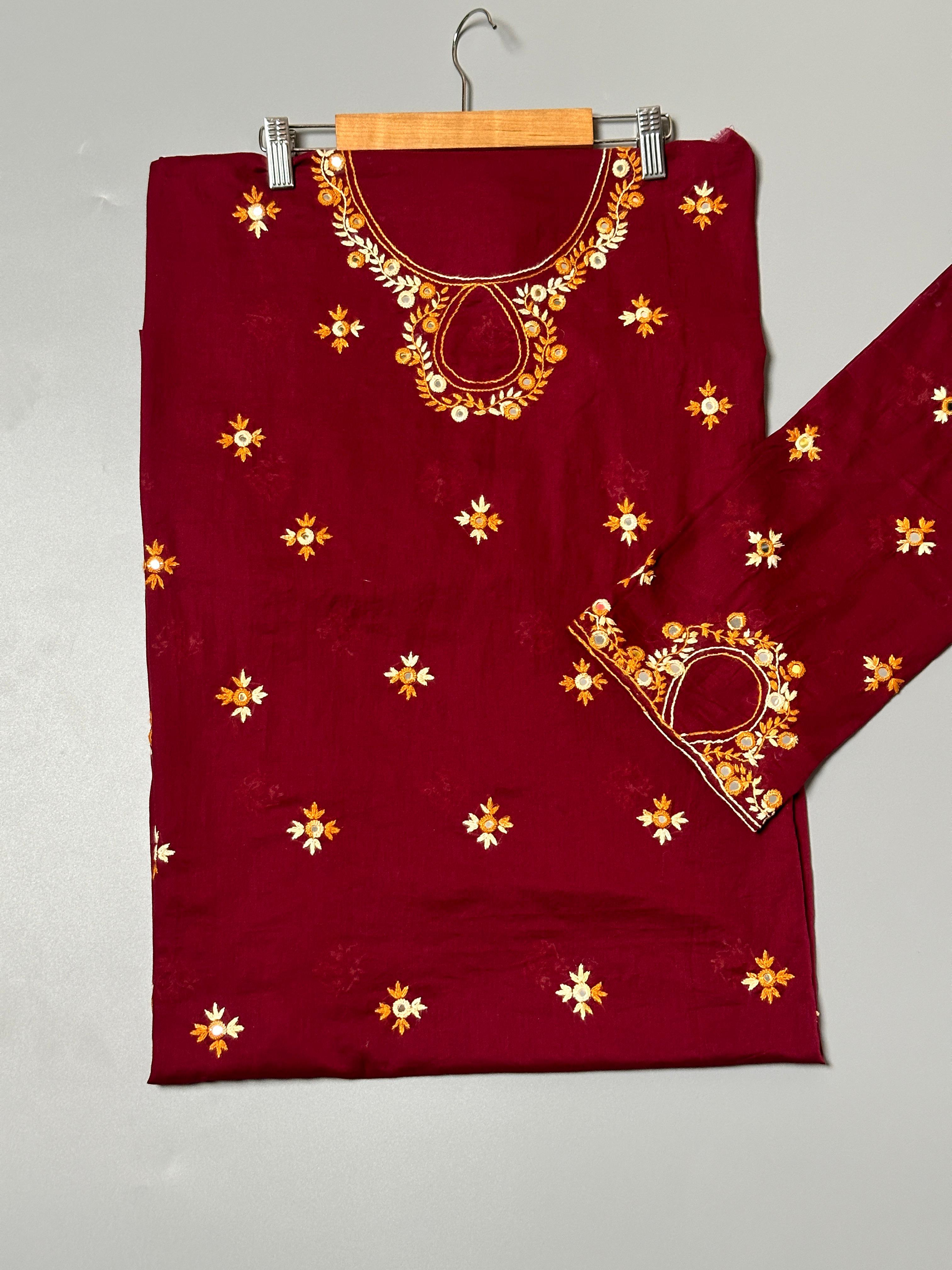 This hand embroidered shirt features a vibrant lemon Maroon color and intricate chikankari shadow work. The dyed lawn fabric is adorned with real mirrors, adding a touch of elegance. Perfect for any occasion, this shirt showcases expert craftsmanship and unique design.