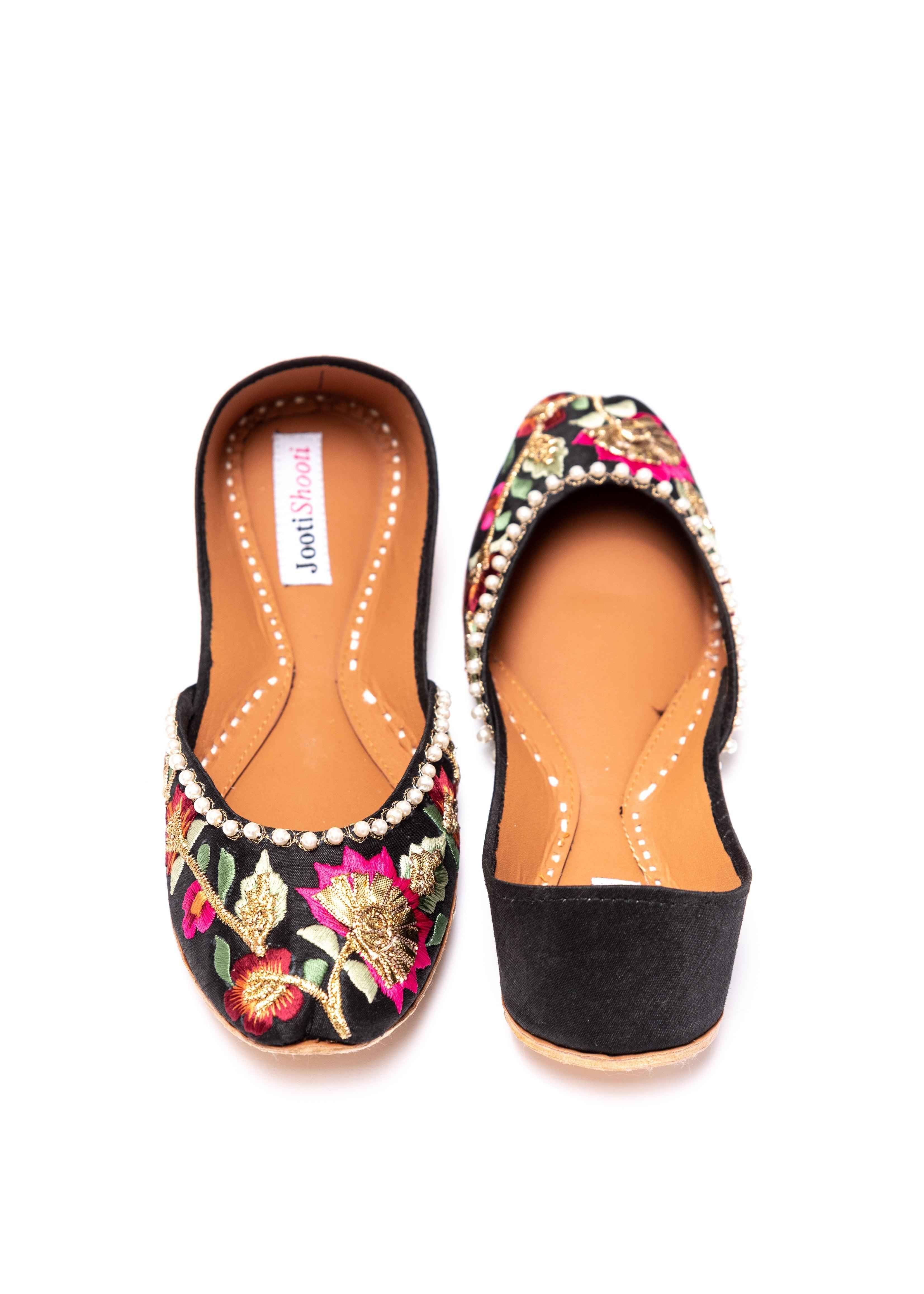 Introducing Mastani Black- Indulge in luxury with our exquisite black silk Khussa adorned with lush, pink, green, maroon and orange-colored embroidery and delicate gotta work. Each pair is meticulously crafted with love and care, ensuring every detail is perfect. To add a touch of elegance, pearls delicately line the edges, making these Khussas a true statement piece. Step into sophistication and tradition with our handcrafted Silk Khussas - the epitome of timeless beauty.