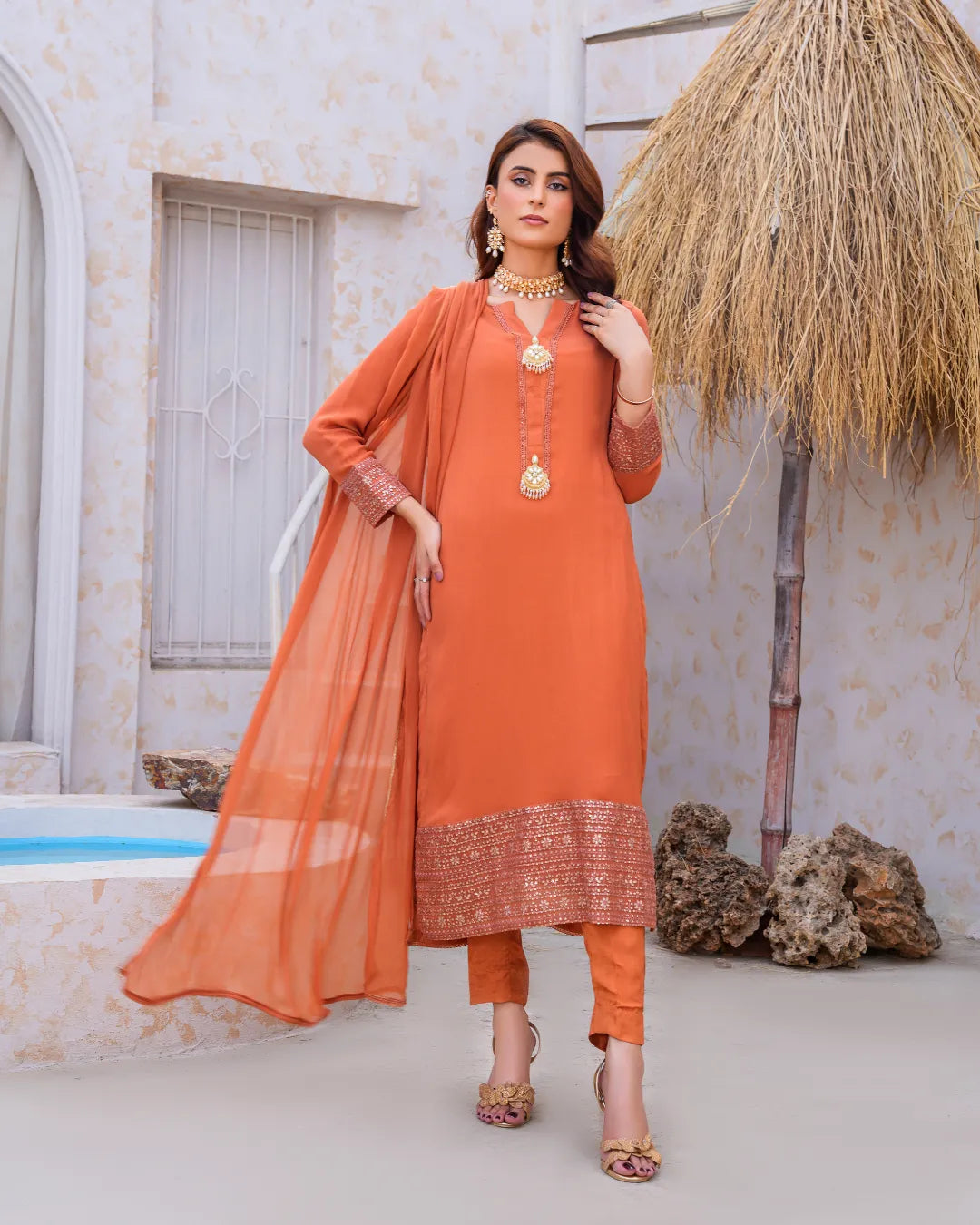 Experience the timeless charm of traditional style with our Rust three-piece embroidered dress featuring a crinkle chiffon shirt embellished with dabka, pearls and stone Motif and dupatta, paired with viscose raw silk trousers.