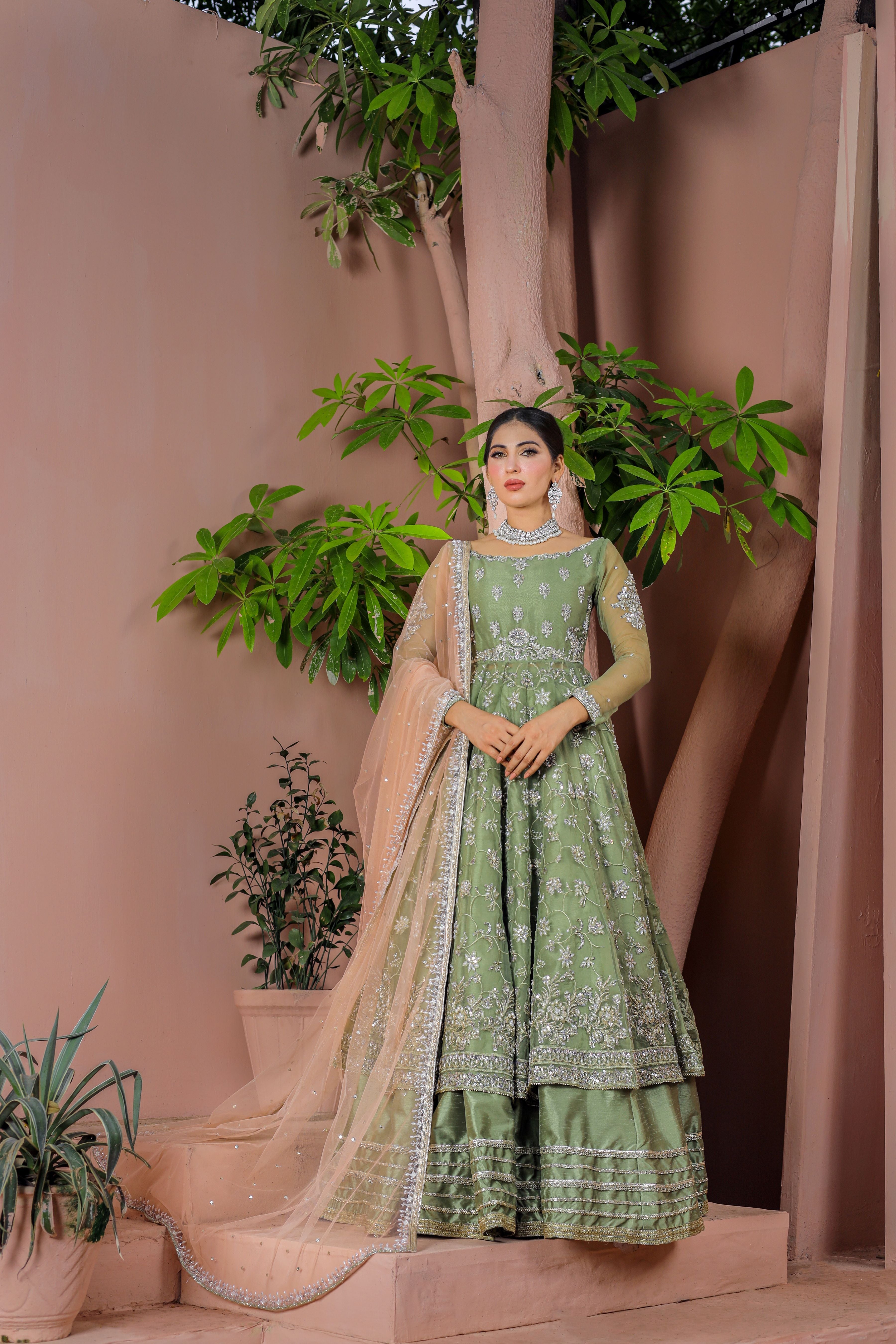Description: Zardozi work on Pishwas. Embroidery on Pishwas . Net dupatta with 4 sides embellished boarder. katan lehenga with finished at hem.