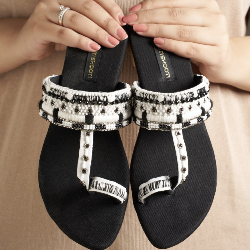 Step into elegance with our Midnight Glamour Kolhapuris. The perfect blend of comfort and sophistication. Featuring intricately beaded straps adorned with pearls and crystals, these kolhapuris add a touch of glamour to any outfit.