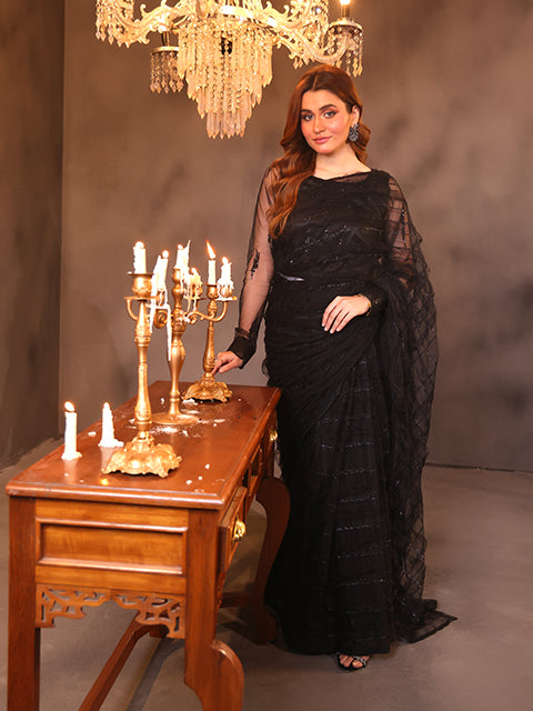 This captivating black net saree, made from the softest, gossamer-like fabric, drapes effortlessly with an airy, weightless charm. Its sheer elegance enhances its timeless allure, making every movement feel poetic. Paired with a matching net blouse, it creates a mesmerizing ensemble of grace and sophistication.