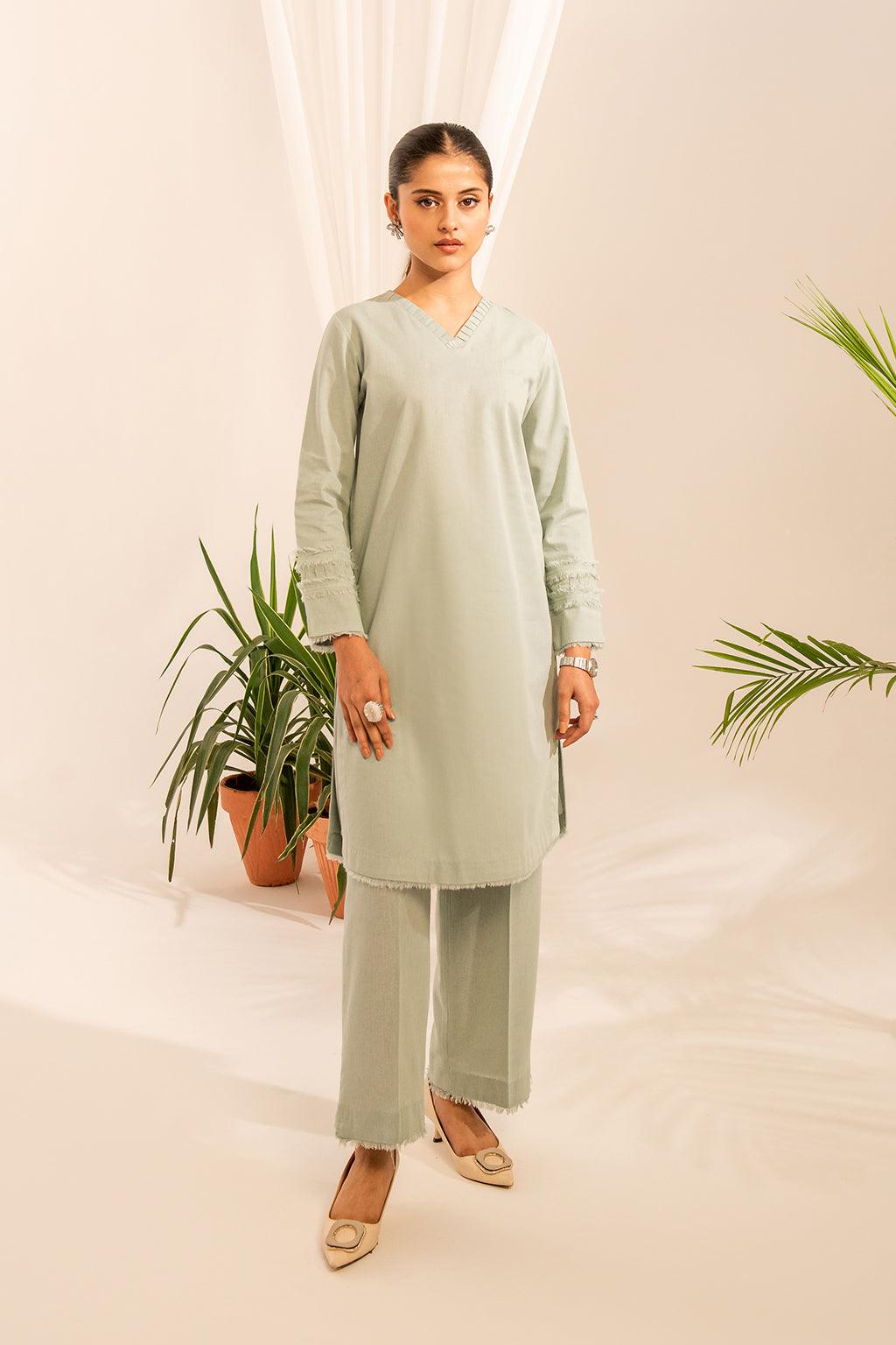 Ice green two-piece slub khaddar suit, featuring intricate details on the sleeves (bazu) and neckline (gala). The soothing hue of ice green meets exquisite craftsmanship, making this ensemble a perfect choice for a touch of sophistication. Embrace the subtle charm of this suit for a timeless and elegant look.