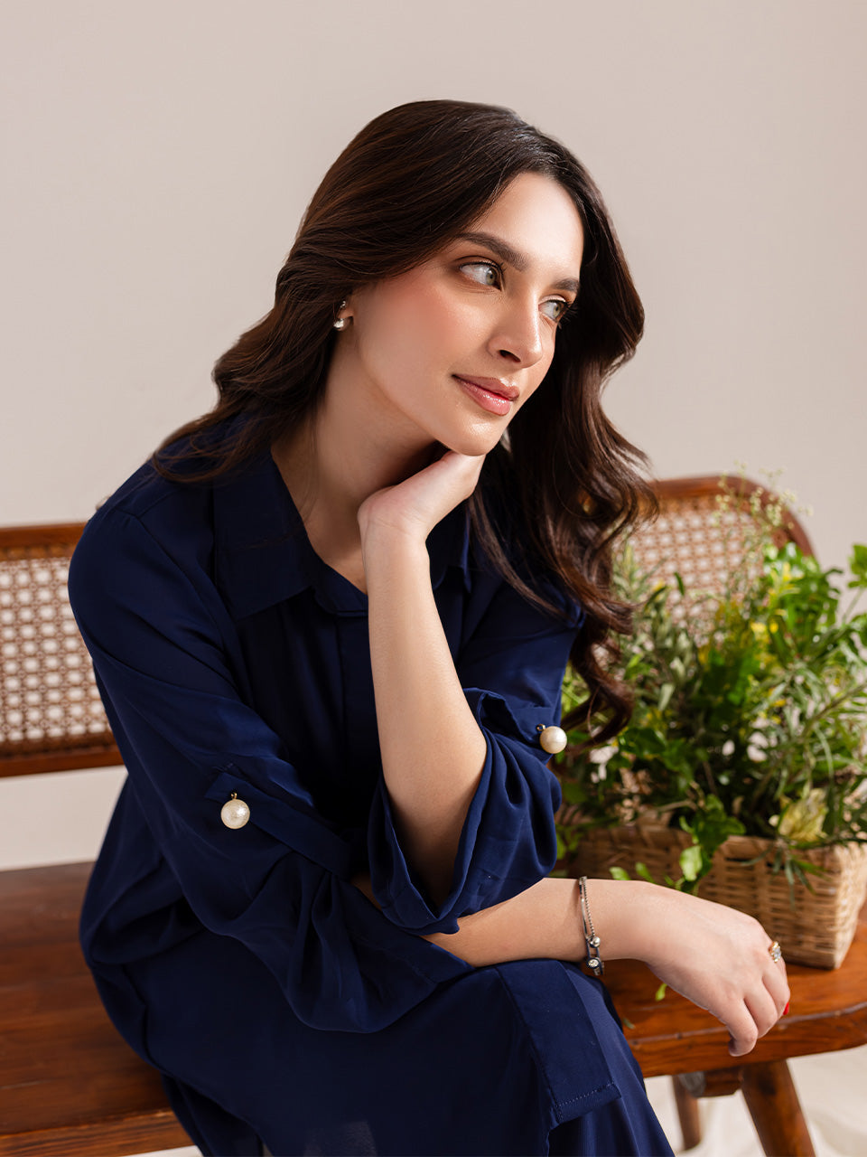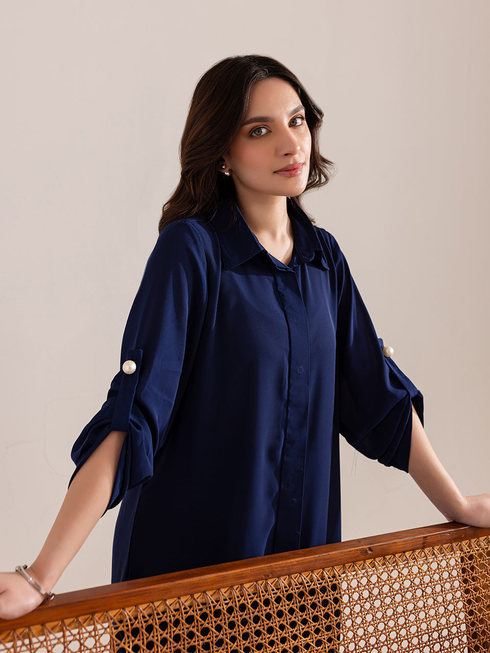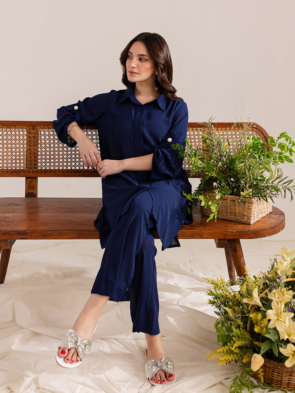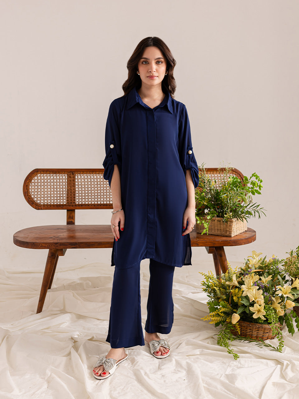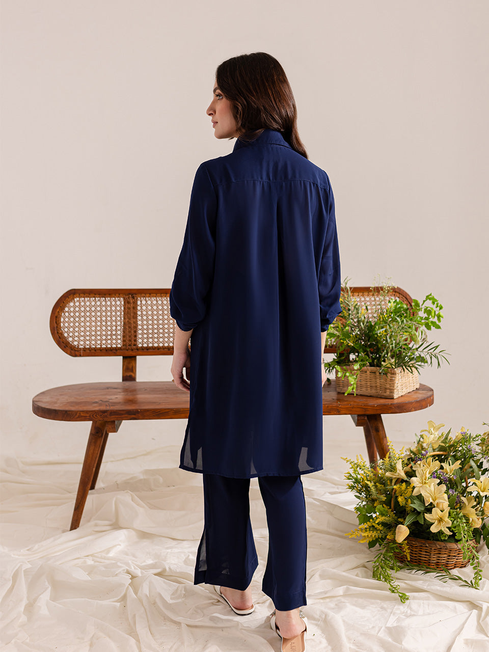 Description: This deep navy blue crepe outfit combines classic and contemporary styles with a relaxed top featuring a shirt collar and rolled-up sleeves, paired with comfortable matching pants.