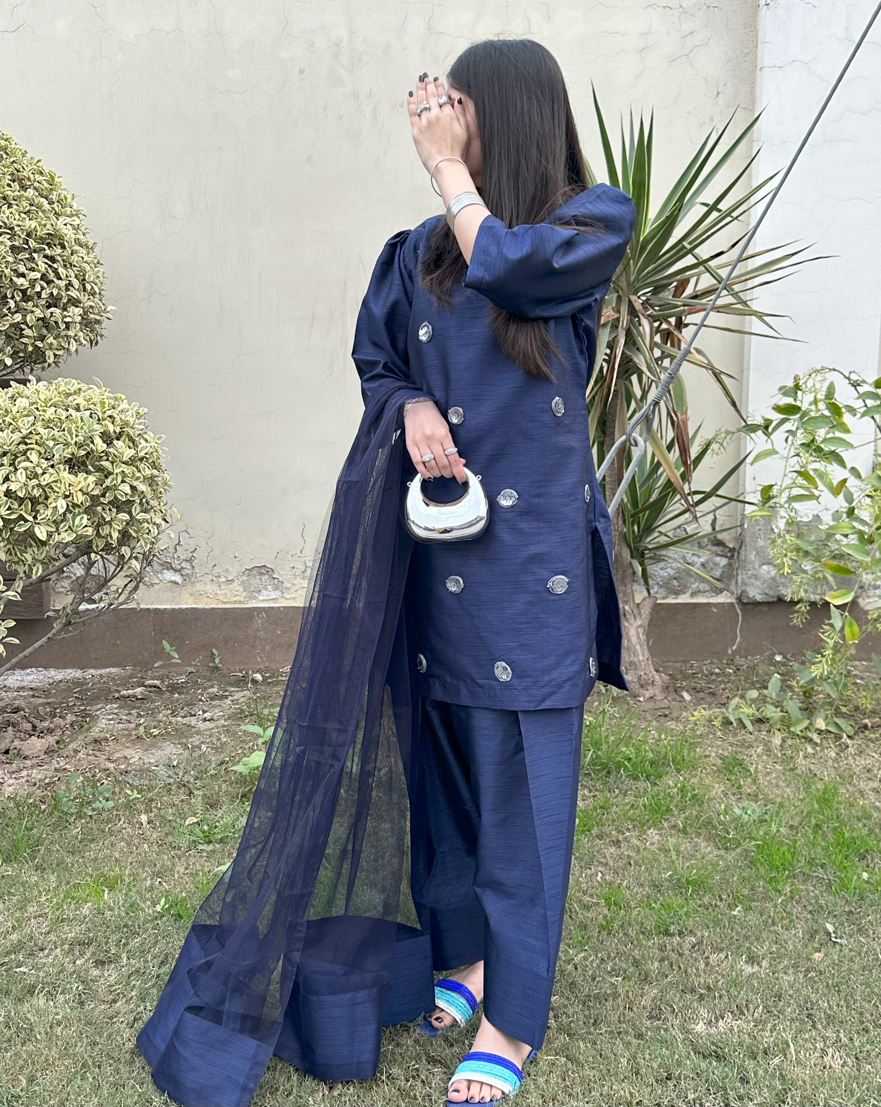 Take your outfit game to the next level with our exquisite raw silk co-ord, featuring a beautiful floral pattern and statement puffy sleeves. Paired with a farshi shalwar and net Dupatta, this outfit is a must-have for your wardrobe. Embrace your unique style with this stunning ensemble.