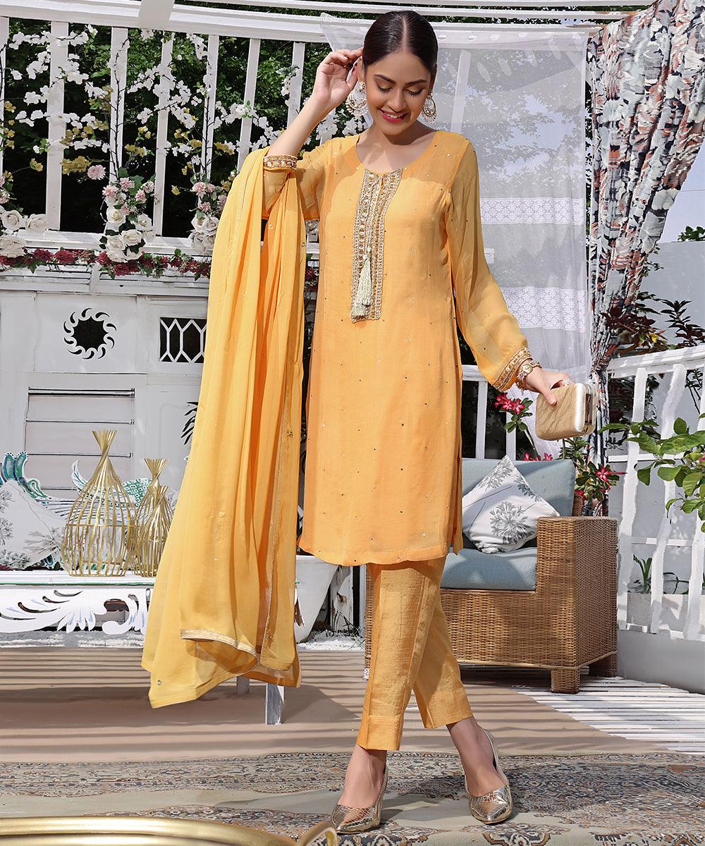 This luxurious shirt boasts intricate hand embellishments at the round neck and chest, as well as on the sleeves. The Sitara work adds a touch of elegance to the front, which is made of delicate cotton chiffon, while the inner lining provides a soft, comfortable feel at both the front and the back.