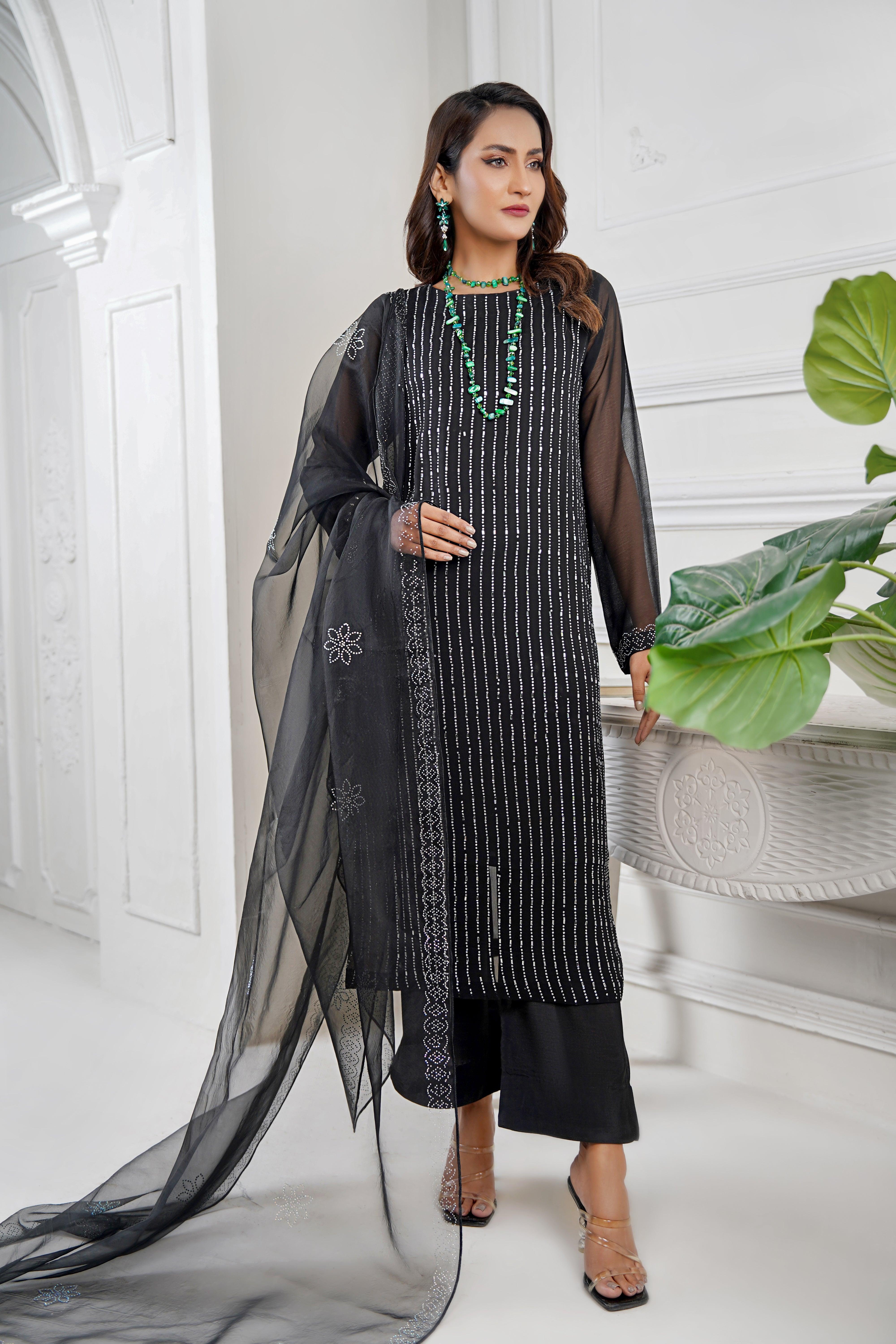 NORA dazzles with crystal stones on the front and a stone-studded back panel. Sleeves feature elegant stone strips. The dupatta is bordered with stones on all sides, while inside, floral motifs add a sophisticated touch.
