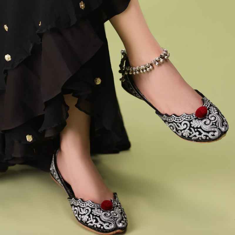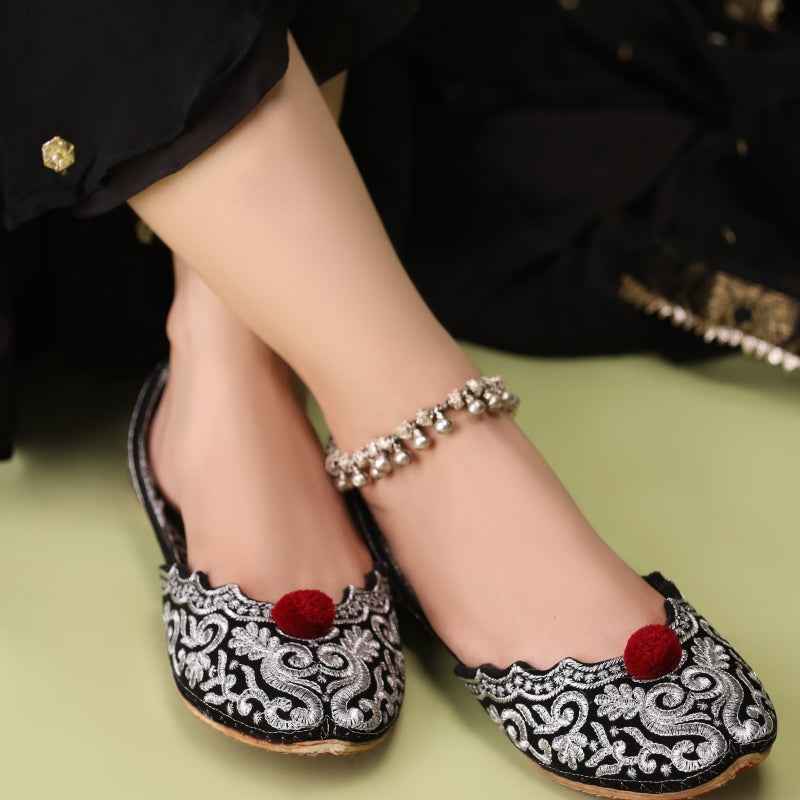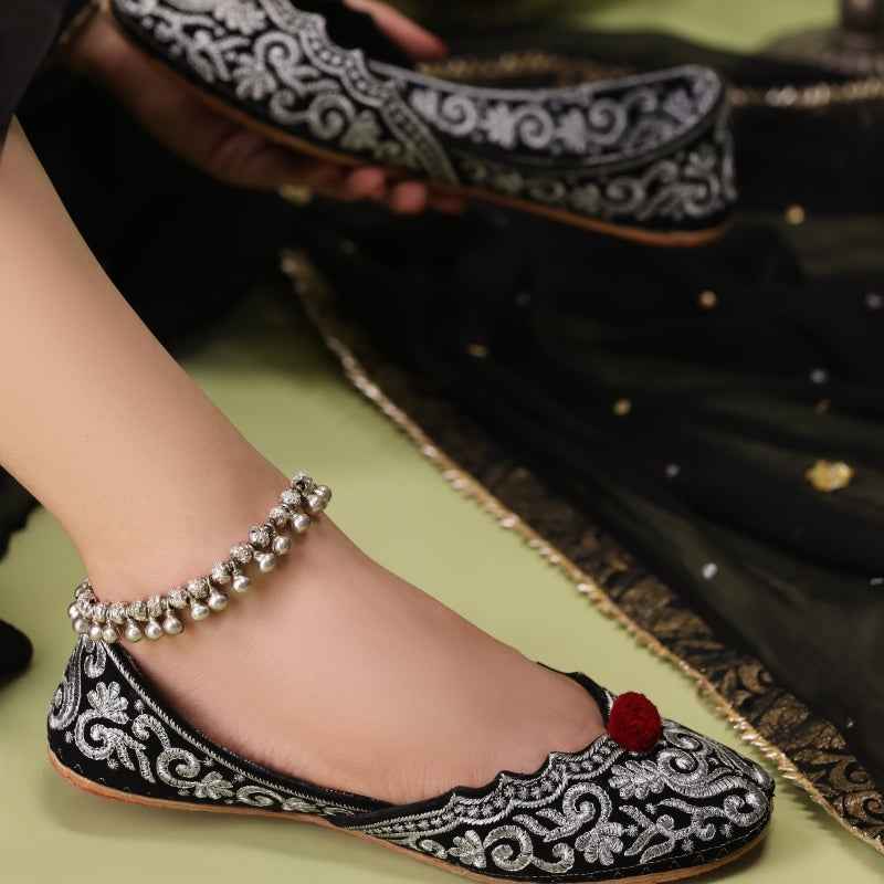 Our Naqsh-e-Chandi khussa showcases intricate metallic-silver thread lacework hand-stitched on a plush black velvet base, framed by matching velvet piping and cushioned with a soft velvet insole for all-day wear. Because each pair is crafted entirely by hand, slight variations in stitch density and pattern alignment ensure your khussas are uniquely yours. Pair them with crisp white linen trousers and sterling-finish jewelry for a fresh daytime look, or let the silver design pop against a deep navy kurta for evening sophistication. To maintain their lustrous shine, gently dust off any debris with a soft, dry cloth and store in a cool, dry place—preferably in a dust bag—away from direct sunlight.
