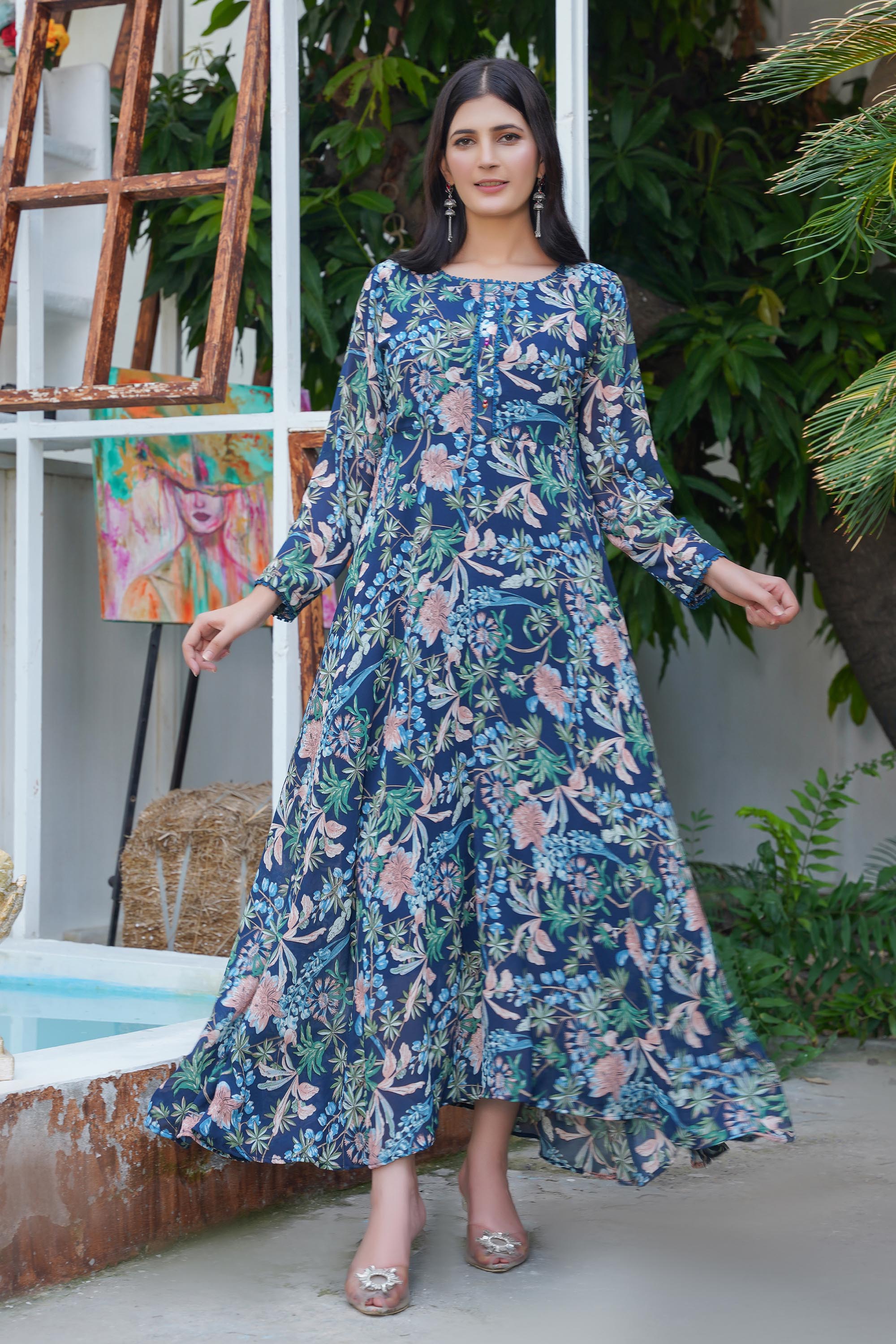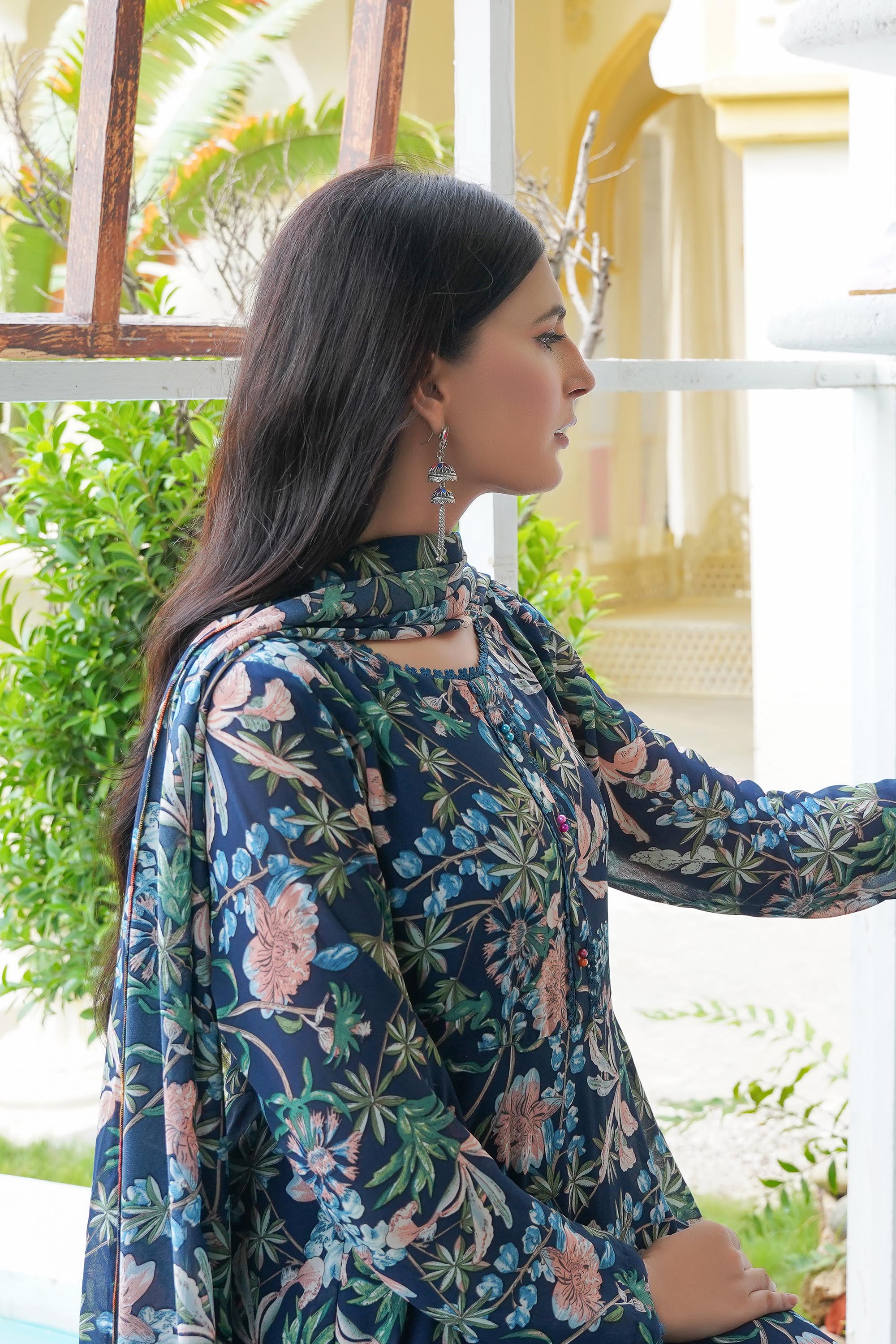 This navy blue chiffon maxi boasts a vibrant blue and green floral print, complemented by a round neck with elegant flower lace detailing. The matching dupatta adds a graceful finishing touch, ideal for a stylish and sophisticated look.