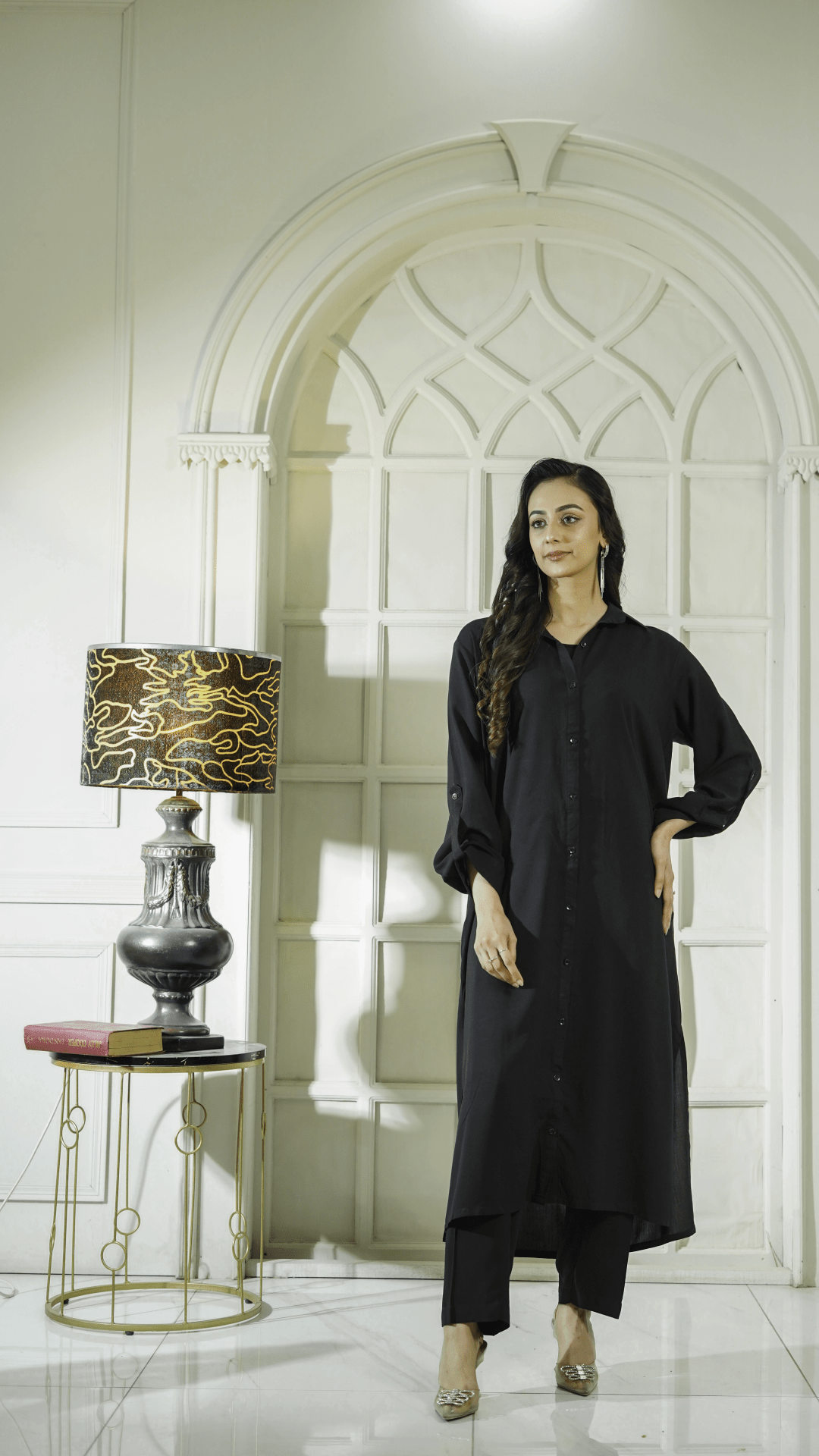 Refresh your wardrobe with the Noir Grace Co-Ord Set, a seamless fusion of elegance and modern charm. This sophisticated outfit features a long, button-up tunic with full sleeves and a refined collar, paired with sleek ankle-length trousers for a polished finish. The premium fabric ensures comfort and durability, making it a perfect choice for both formal gatherings and casual outings