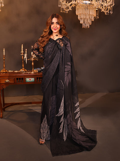 This enchanting printed chiffon saree cascades effortlessly, its feather-light fabric creating a dreamy, fluid drape. The delicate prints enhance its ethereal charm, adding a touch of sophistication to its airy silhouette. Paired with a heavily embroidered blouse, rich in intricate craftsmanship, it strikes a perfect balance between subtle grace and statement luxury
