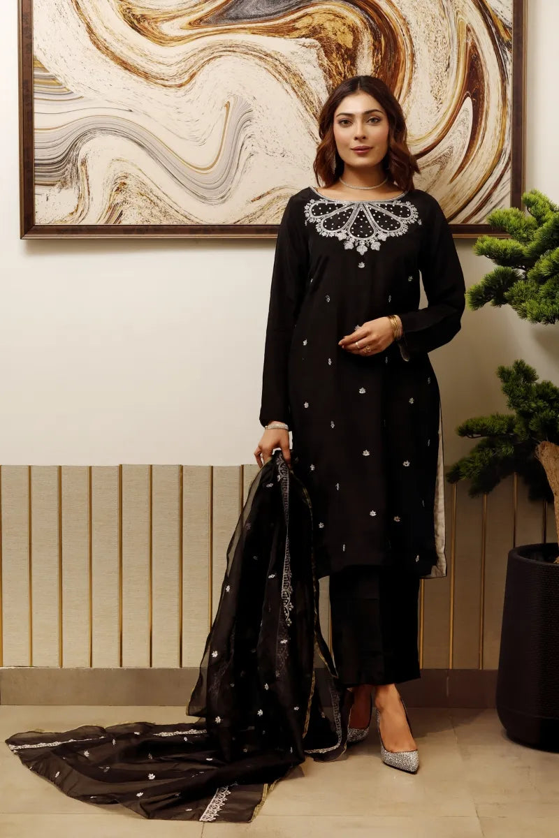 3 Pc – Noire Embroidered Raw Silk Shirt paired with Raw Silk Trouser and Embroidered tilla & Sequins Dupatta.