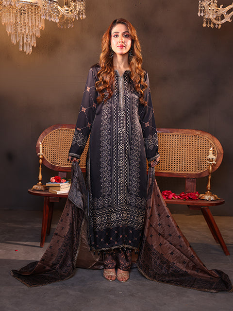 It is a striking three-piece black silk outfit featuring an elegant brown and copper print. The tunic is adorned with heavy lace on the neckline and sides, adding richness and depth to the design. Paired with matching trousers and a beautifully printed dupatta, this ensemble exudes sophistication with a bold, timeless appeal.