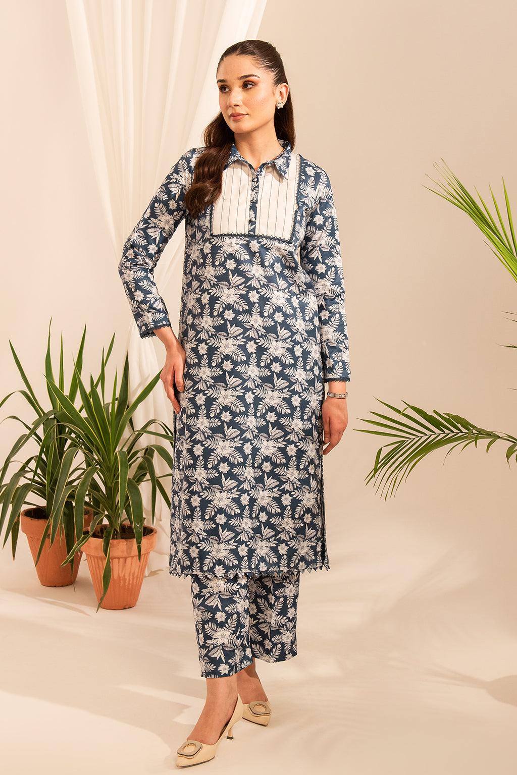 The blue base with white floral print and intricate neckline work creates a uniquely classy and sophisticated look. The contrast of colors and the attention to detail in the neckline design make this outfit stand out as a fashionable choice that exudes elegance and individuality.