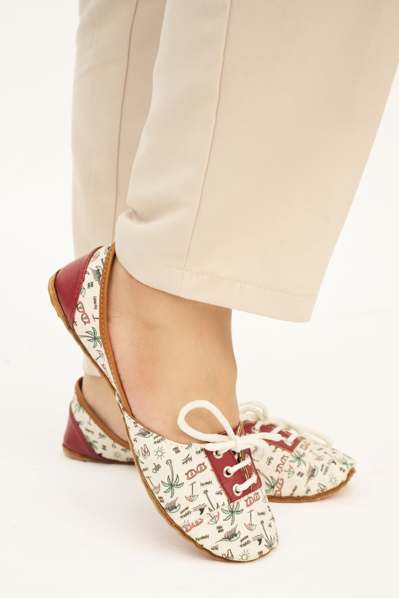 Step into comfort and style with our uniquely designed women's lace-up khussa flats. These shoes feature a charming white base adorned with playful, colorful doodles, including palm trees, sunglasses, and other whimsical motifs. The maroon lace panel adds a pop of color and sophistication, perfectly complemented by the white laces. Crafted for both fashion and function, these flats are perfect for casual outings or adding a touch of fun to your everyday wardrobe. The soft, cushioned insole ensures all-day comfort, while the durable leather sole provides excellent traction. Elevate your shoe collection with these delightful and versatile flats.