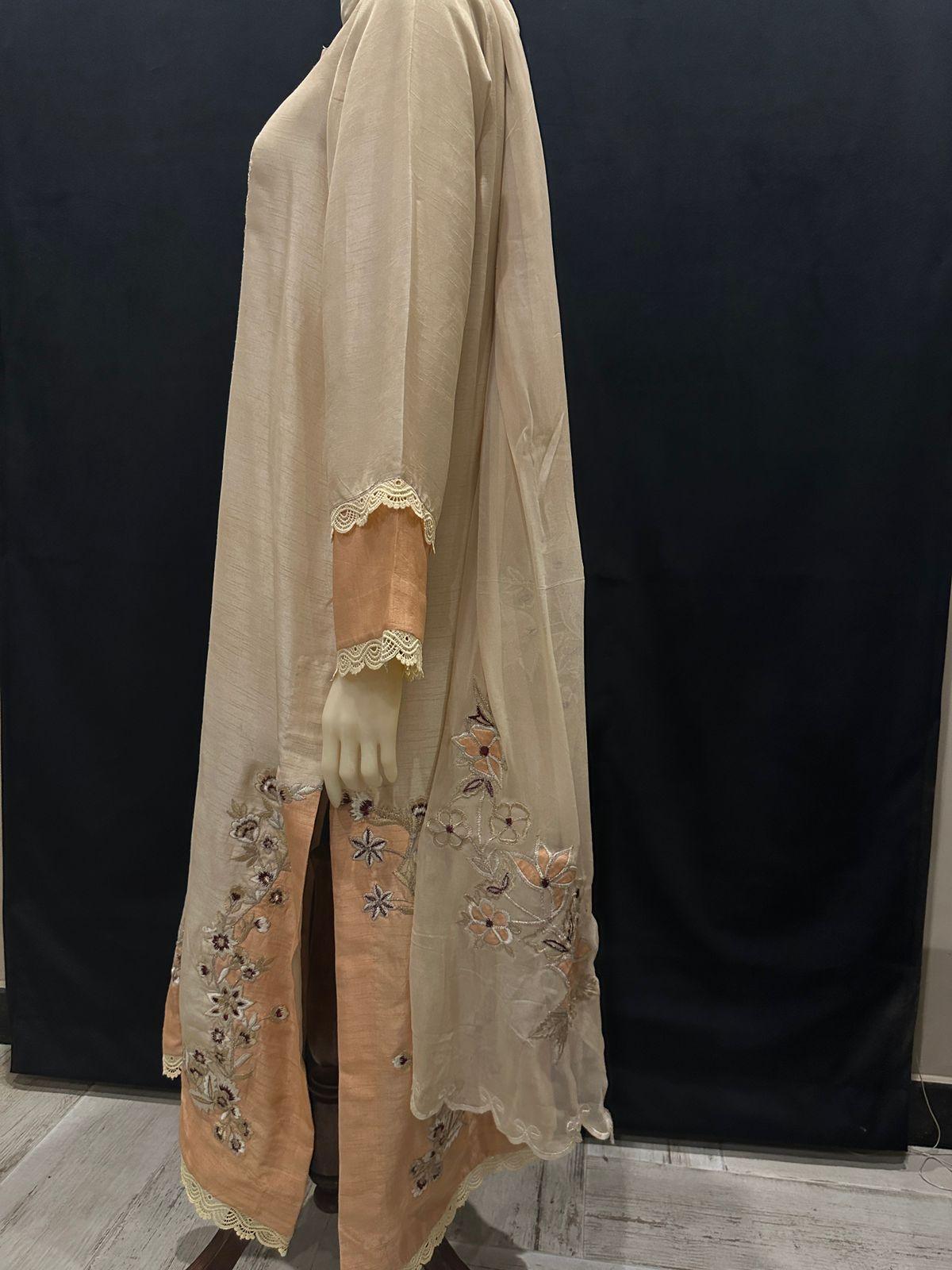 Rendered in opulent ivory, showcases exquisite embroideries employing intricate threadwork accented with Golden tilla work.The scalloped dupatta and ethereal floral motifs cascading over the diaphanous korean canvas with peach hue imbue a sense of feminine elegance into this sophisticated ensemble