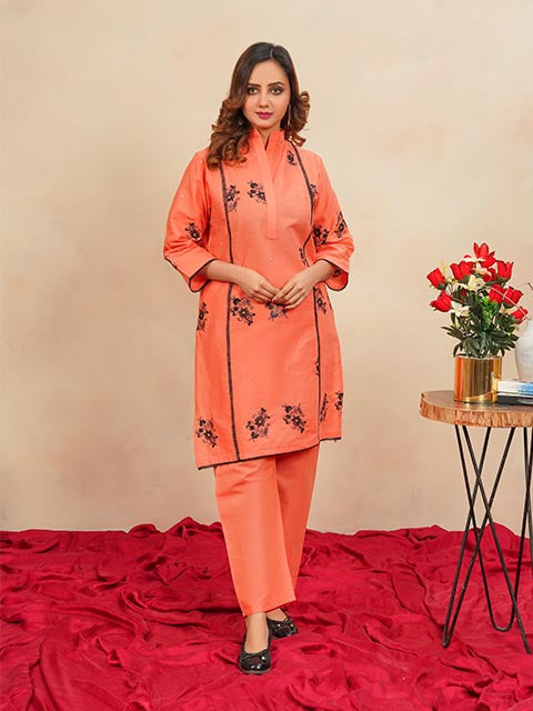 Radiate elegance with this peach embroidered 2-piece cotton suit, adorned with delicate detailing for a soft and graceful look.