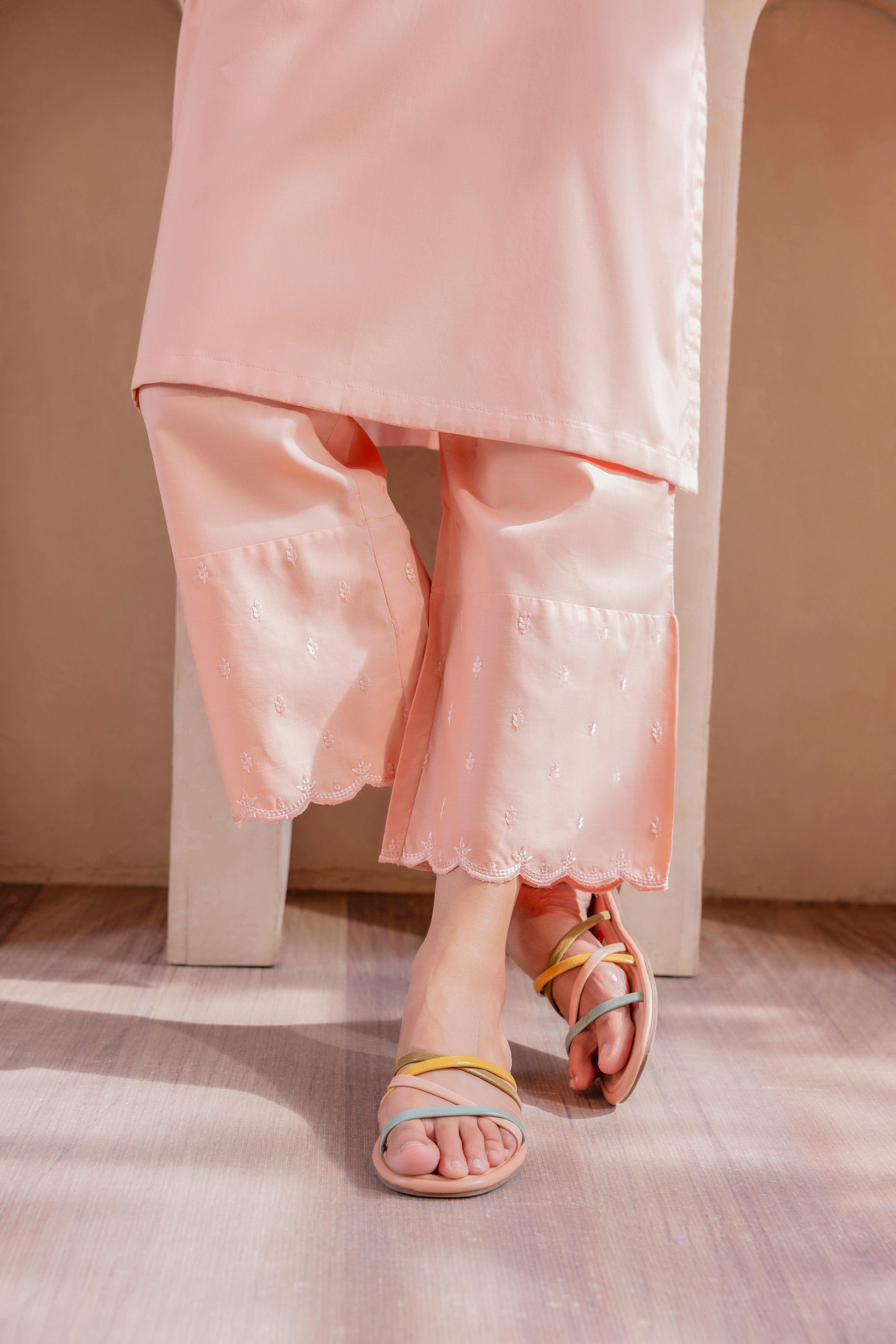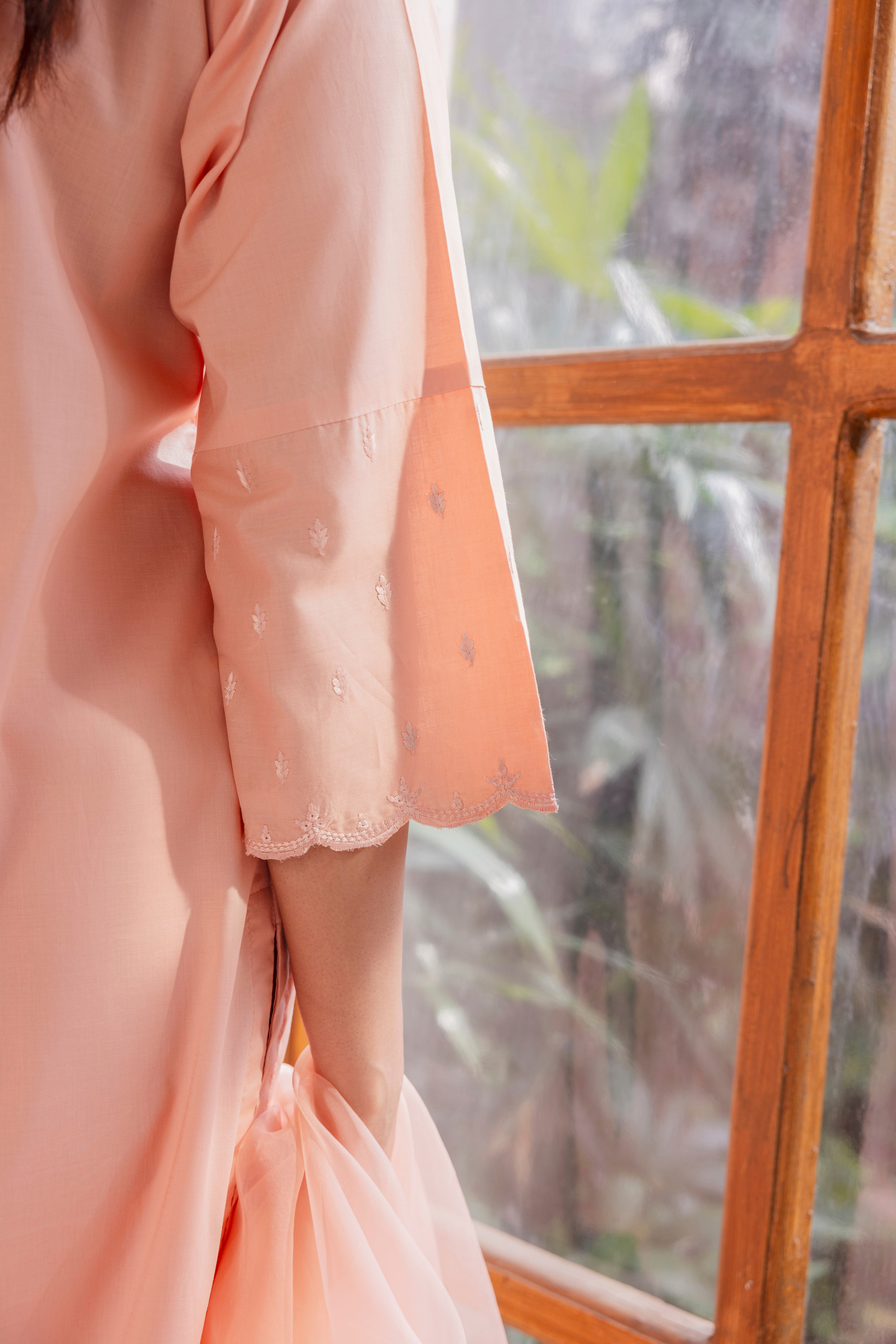 Peach matching set that features a beautiful scalloped border and a scattered spray on both sleeves and trousers. It’s paired with straight pants and a four sided scalloped organza dupatta, perfect for infusing charm and vibrancy into your summer looks.