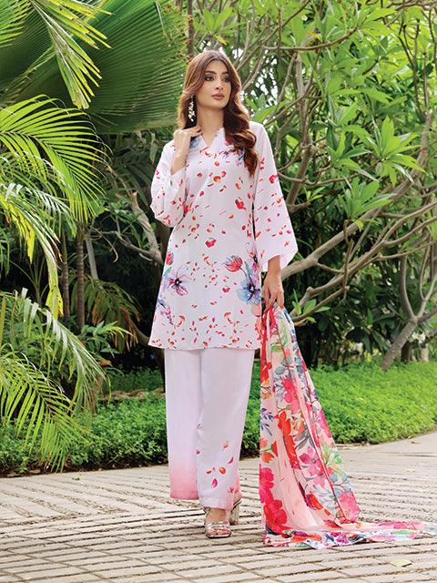 Experience Petrichor. Swiss Lawn with a white base, scattered petals, and flowers. Paired with a soft silk dupatta with multi-colored floral prints on the border. Perfect for a refreshing summer look!