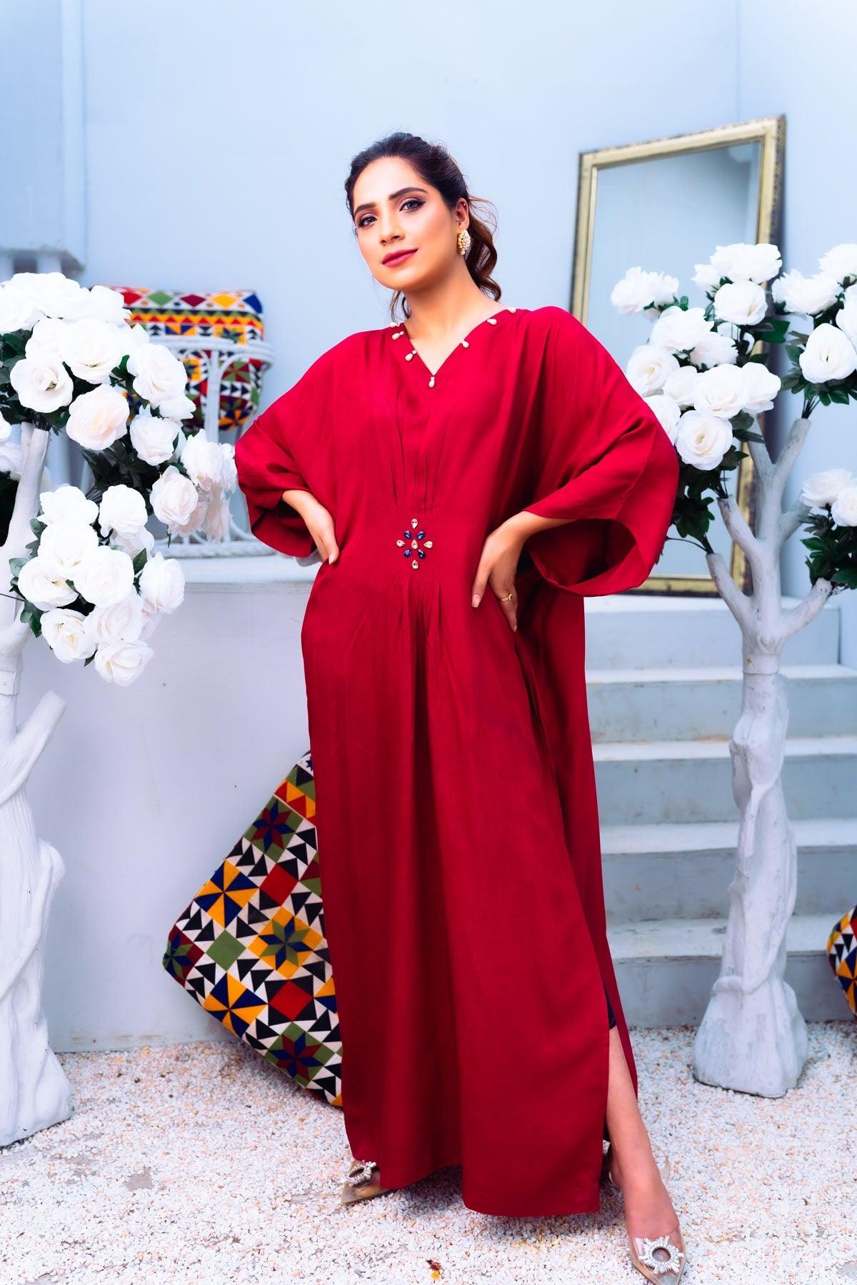 The dress is perfect for both formal and casual occasions, with its versatile design and effortless style. The loose, flowing silhouette of the kaftan ensures maximum comfort, while the full sleeves and boat neckline add a touch of classic elegance.