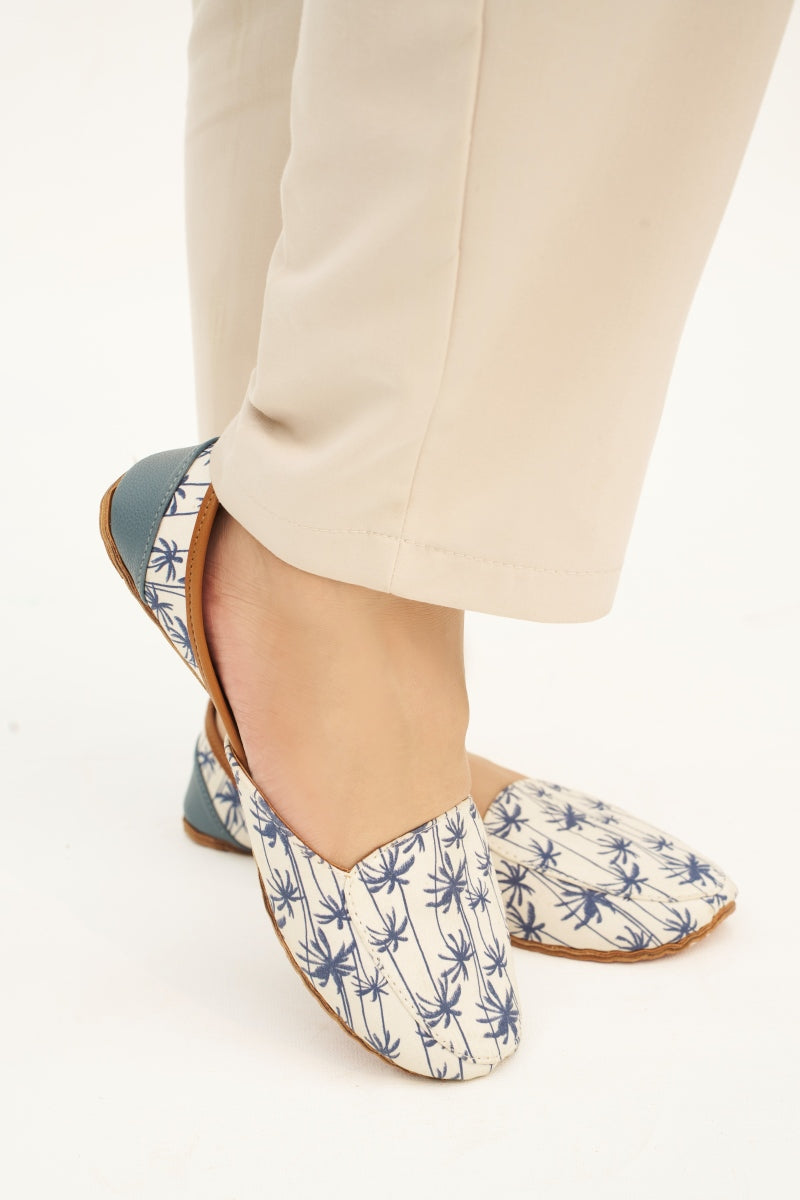 Step into comfort and style with our elegant palm tree print khussa loafers. These chic shoes feature a soft, cushioned insole and a durable sole, perfect for all-day wear. The upper is adorned with a delicate blue palm tree pattern on a white background, adding a touch of tropical flair to your outfit. Ideal for casual outings or a relaxed day at work, these loafers are a versatile addition to your wardrobe. The slip-on design ensures ease of wear, while the high-quality materials promise longevity and comfort. Elevate your footwear collection with these stylish and comfortable loafers.