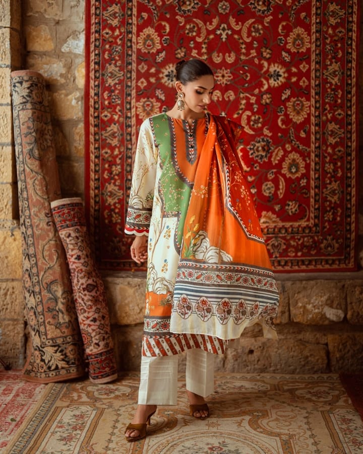Create a decent look with this printed three-piece from the latest unstitched summer collection.