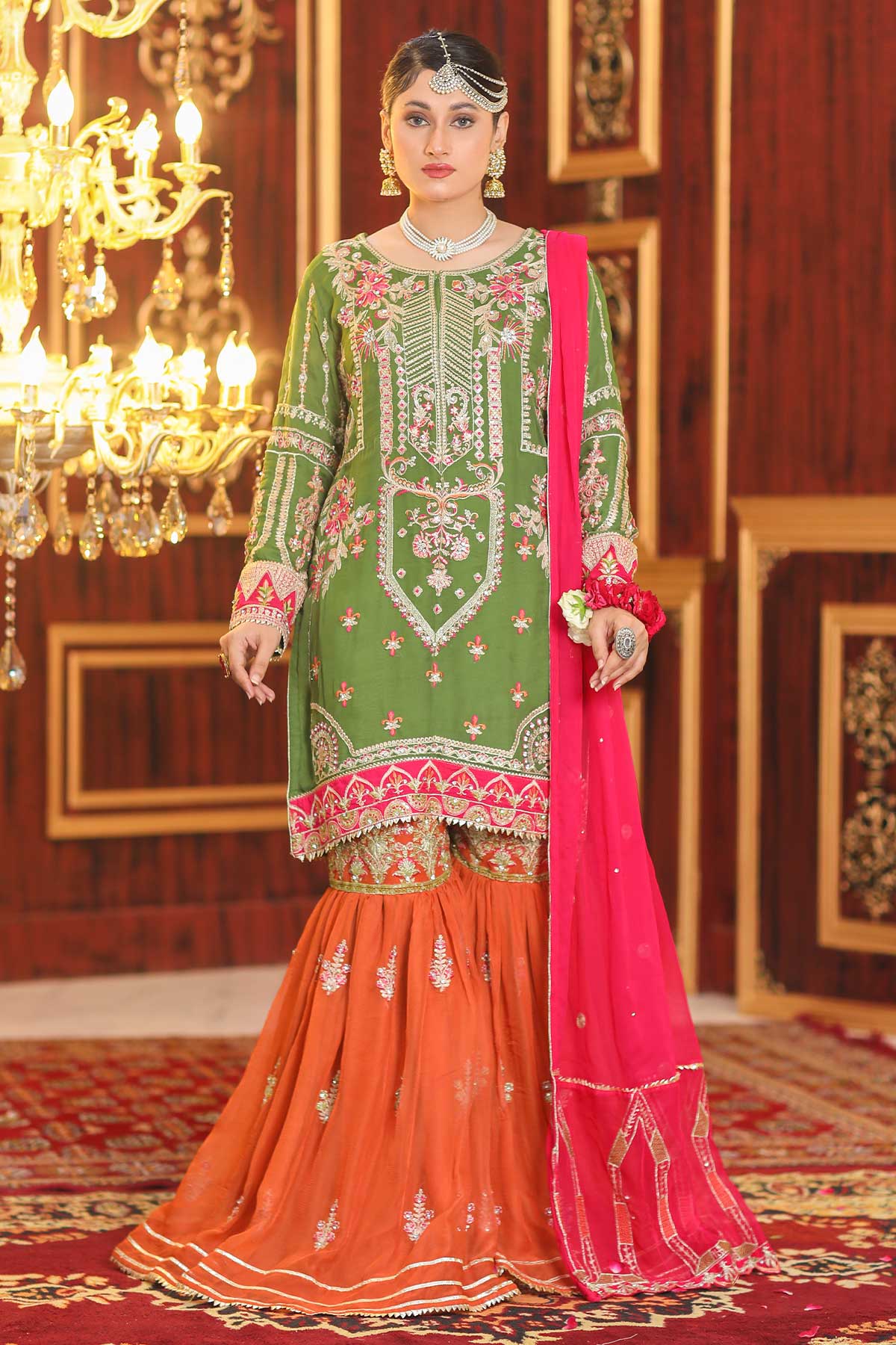 Embroidery garara on chiffon finished with stone work and goti lace and stitching element