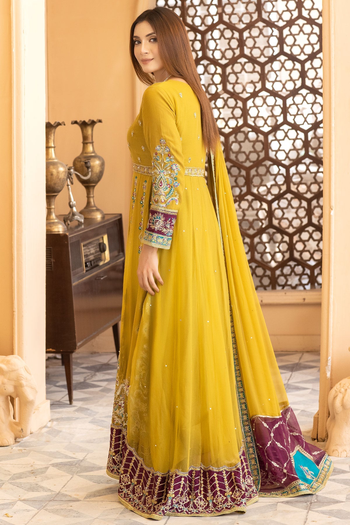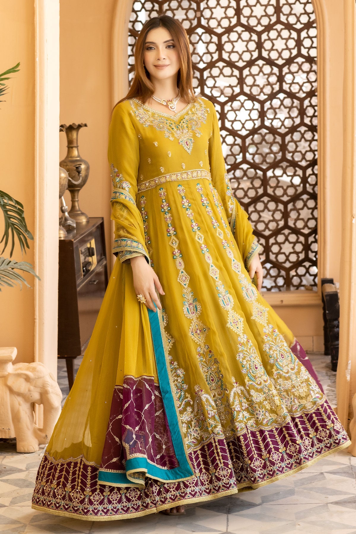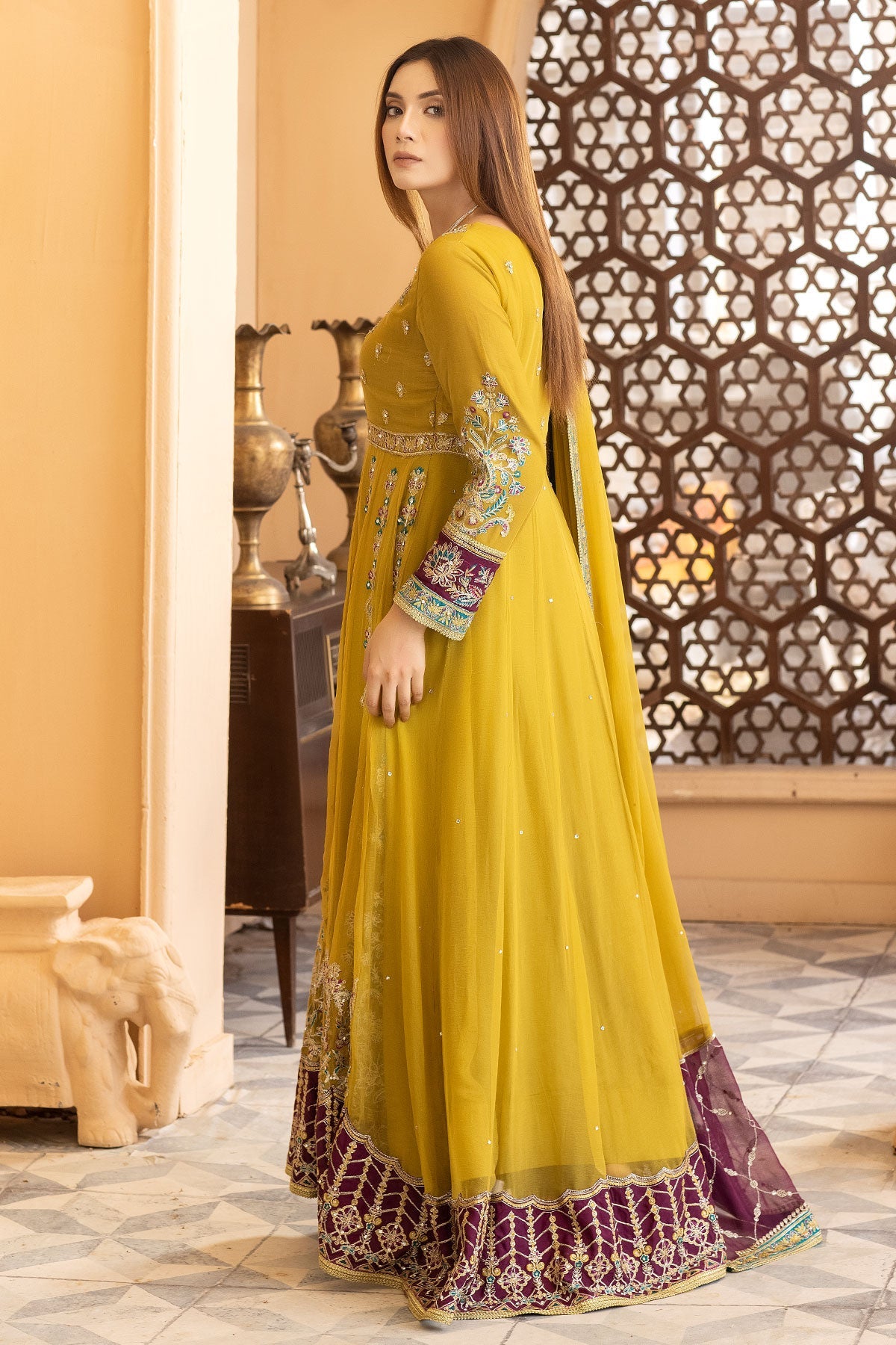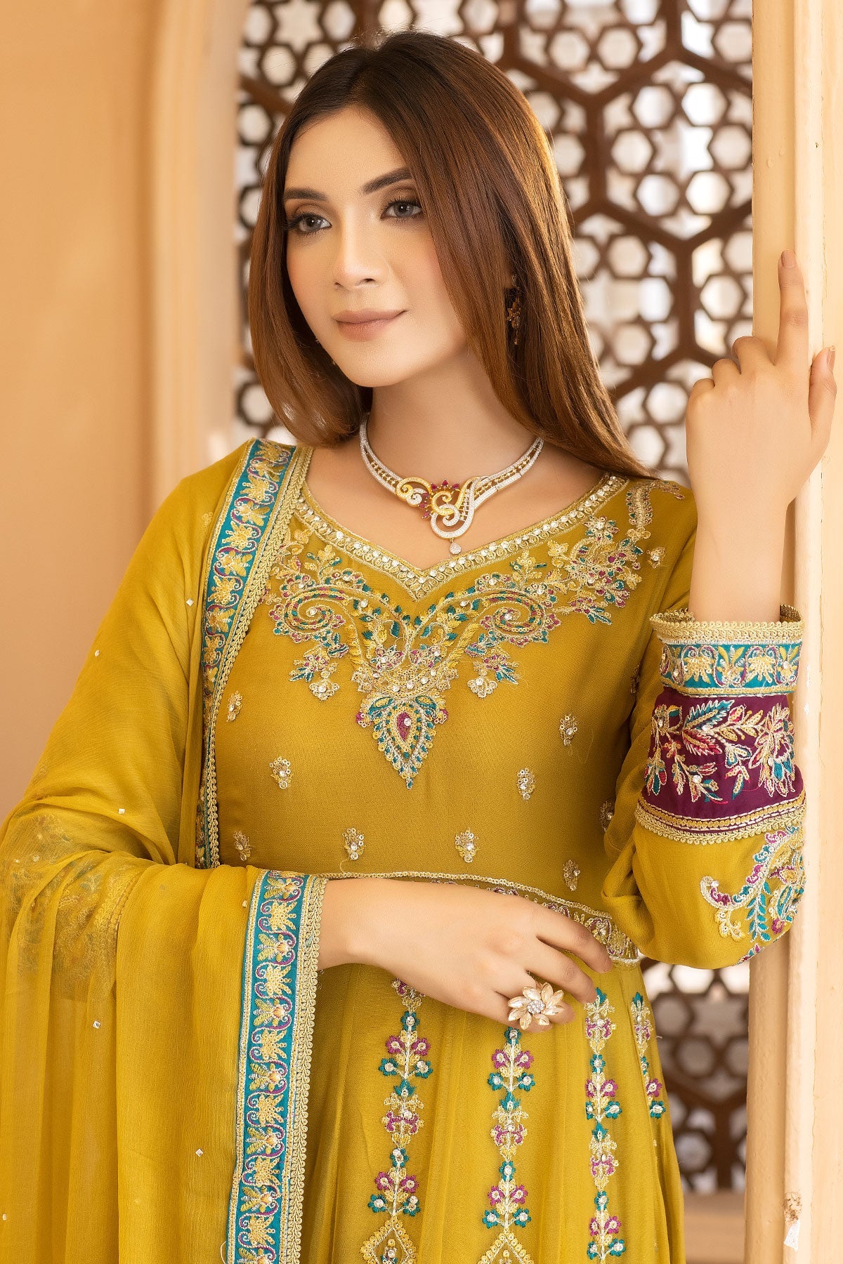 Make a statement in our beautiful maxi style dress. Expertly embroidered on chiffon and finished with intricate stone work and fancy lace, this wedding wear is truly special. The embroidered section dupatta adds a unique touch to the look. Complete with plain viscose trousers, this outfit is chic and timeless!