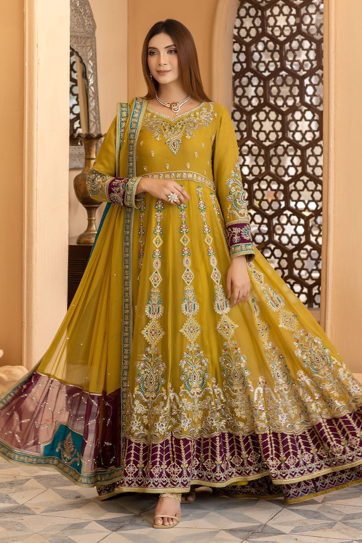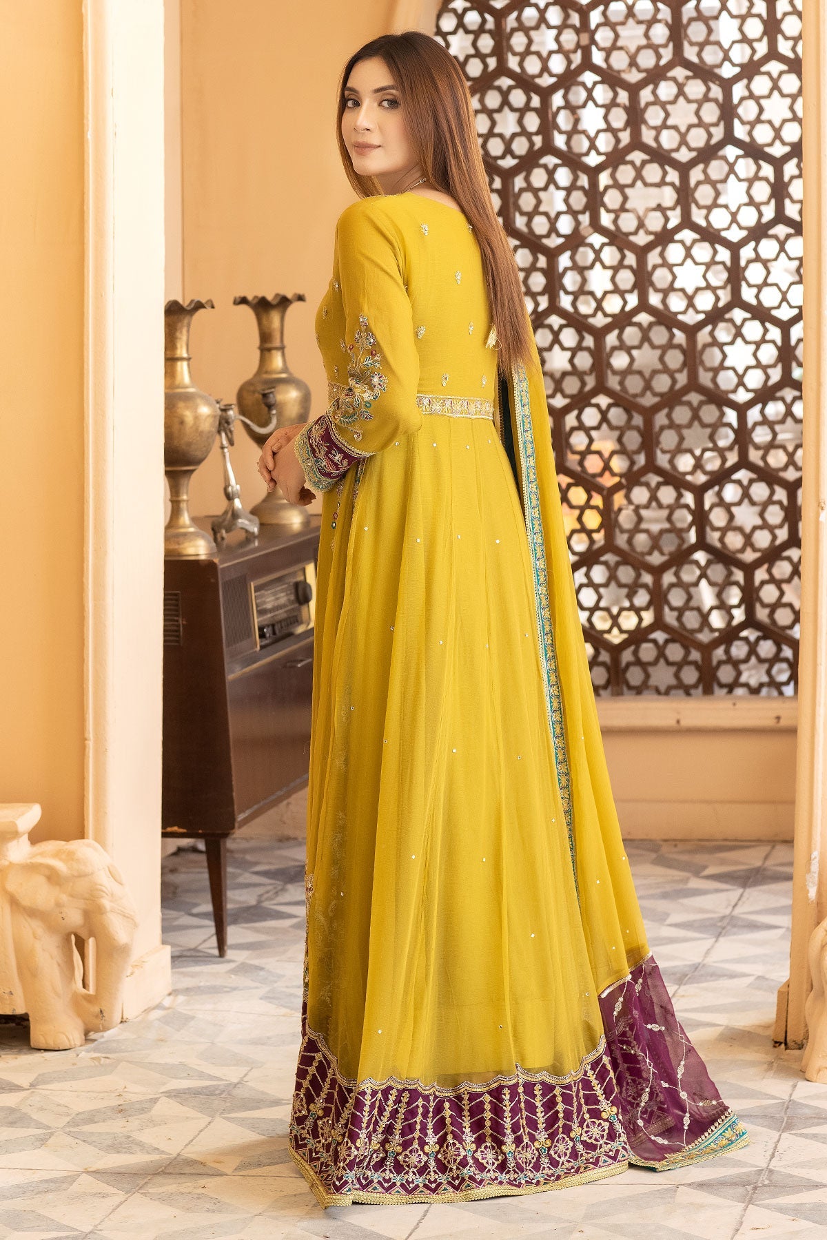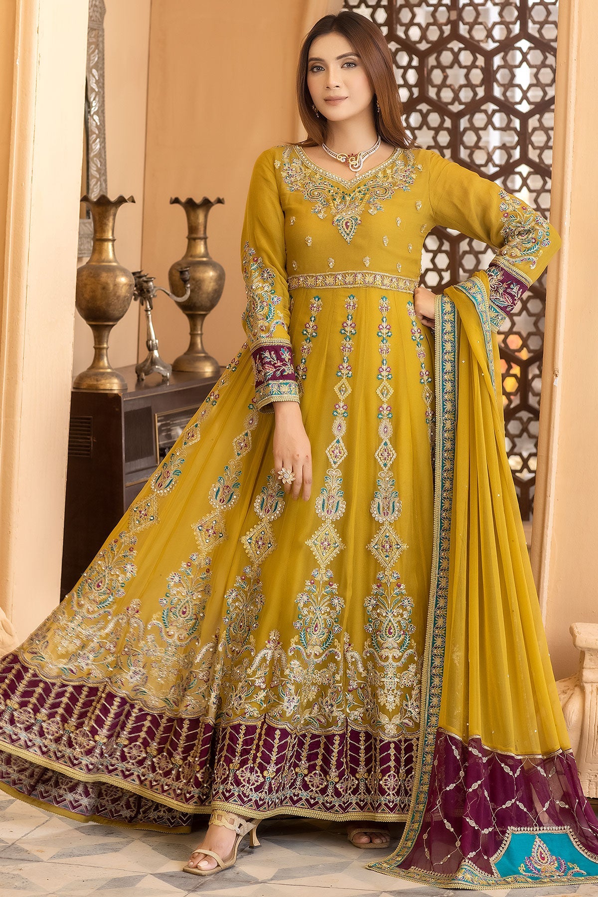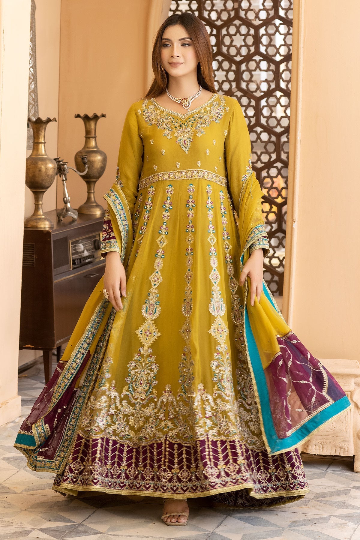 Make a statement in our beautiful maxi style dress. Expertly embroidered on chiffon and finished with intricate stone work and fancy lace, this wedding wear is truly special. The embroidered section dupatta adds a unique touch to the look. Complete with plain viscose trousers, this outfit is chic and timeless!