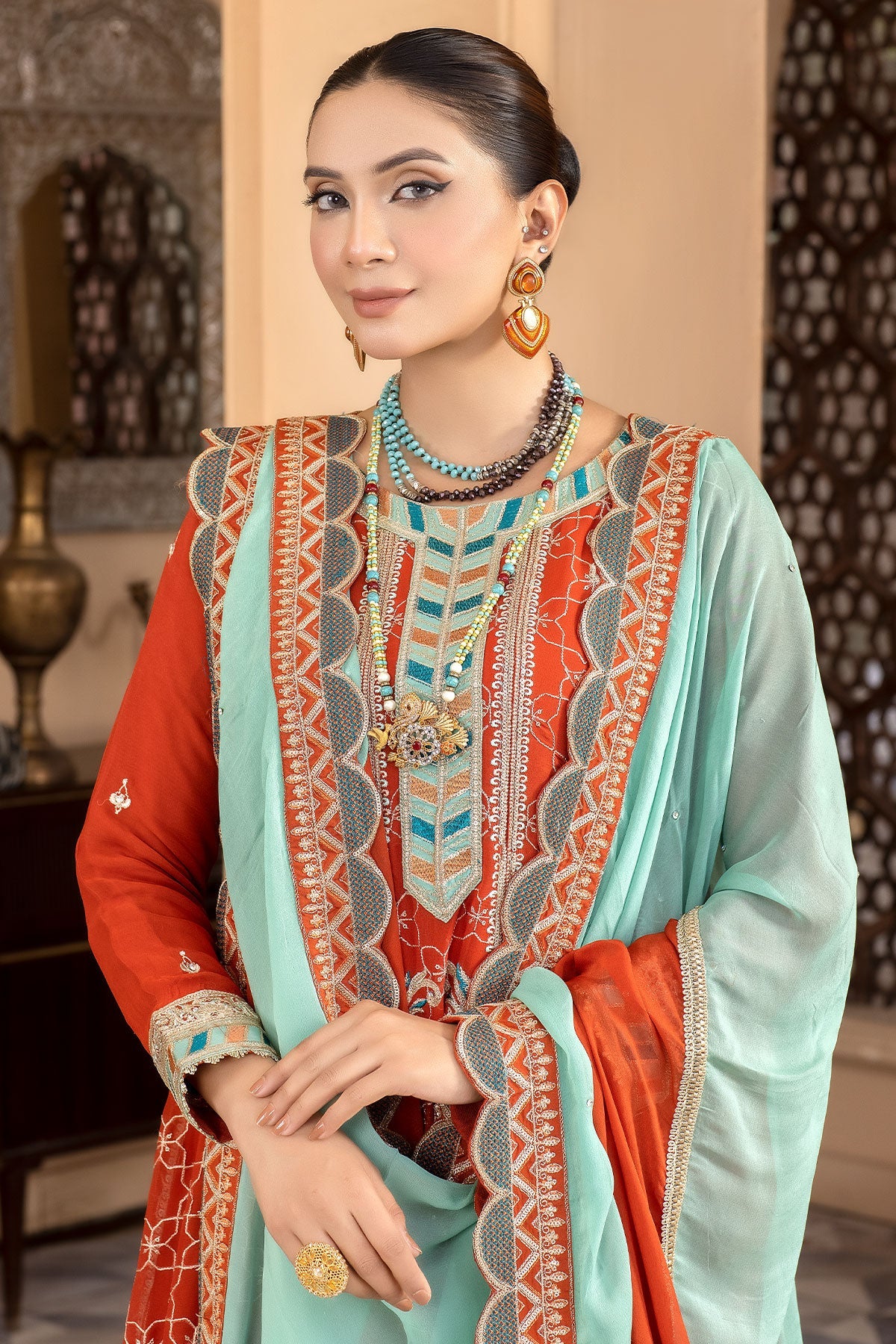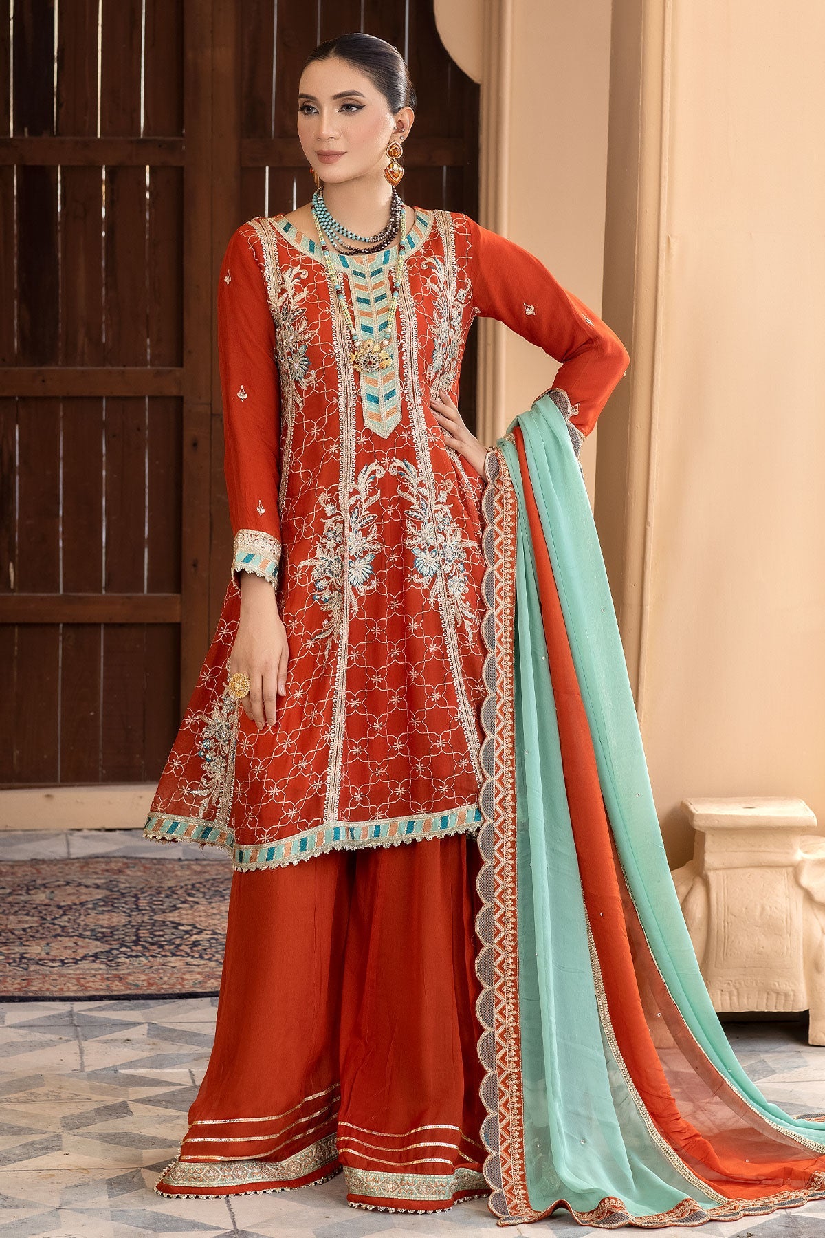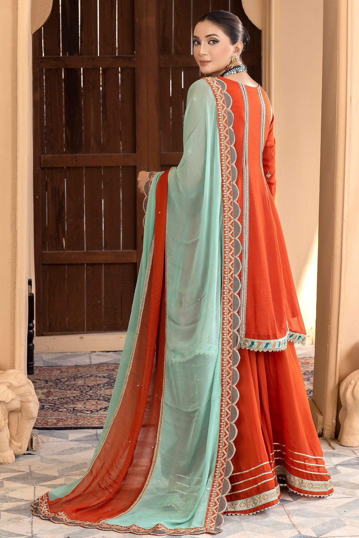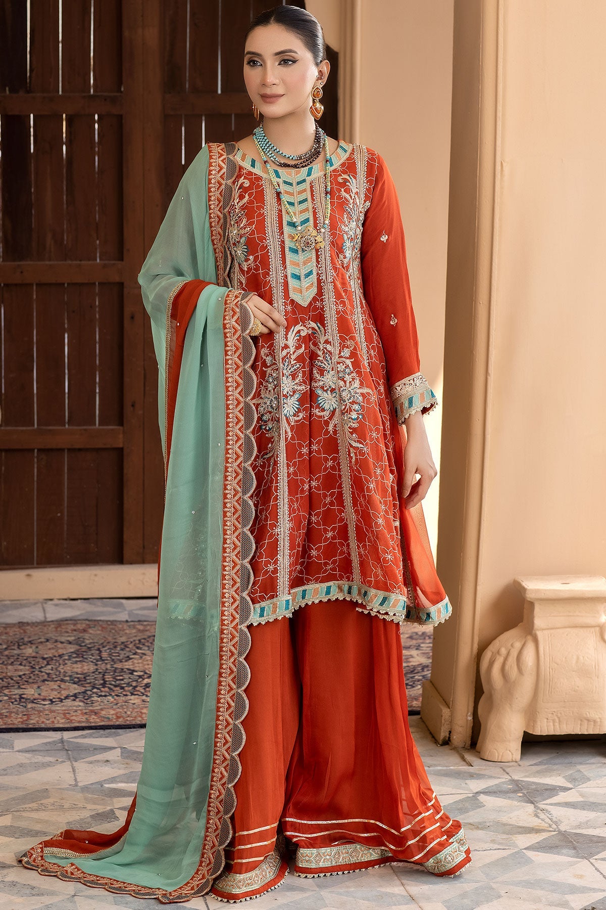 This features a stunning aline peplum wedding wear, embroidered on chiffon, and an embellished chiffon sharara set with goti lace and section dupatta with lace. Look your best for your special day with this stylish and elegant ensemble.