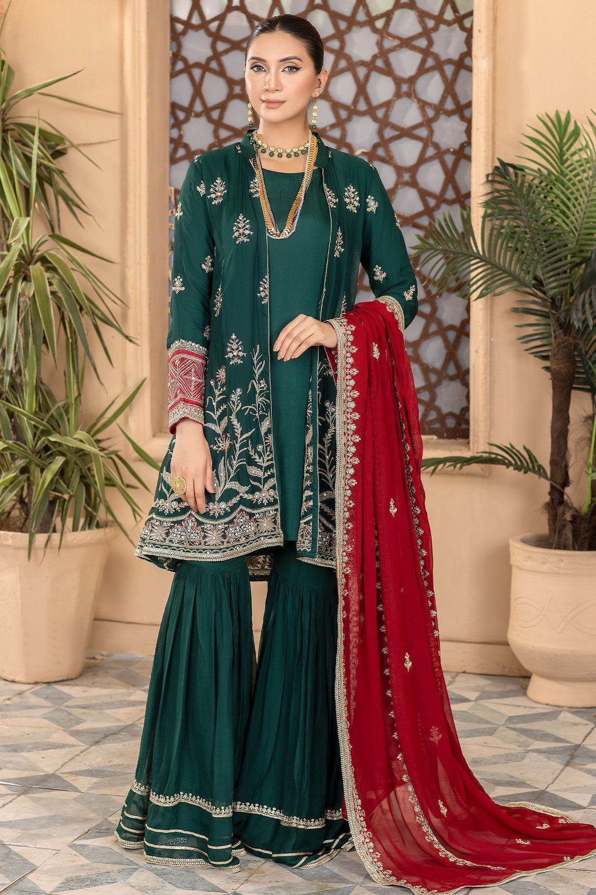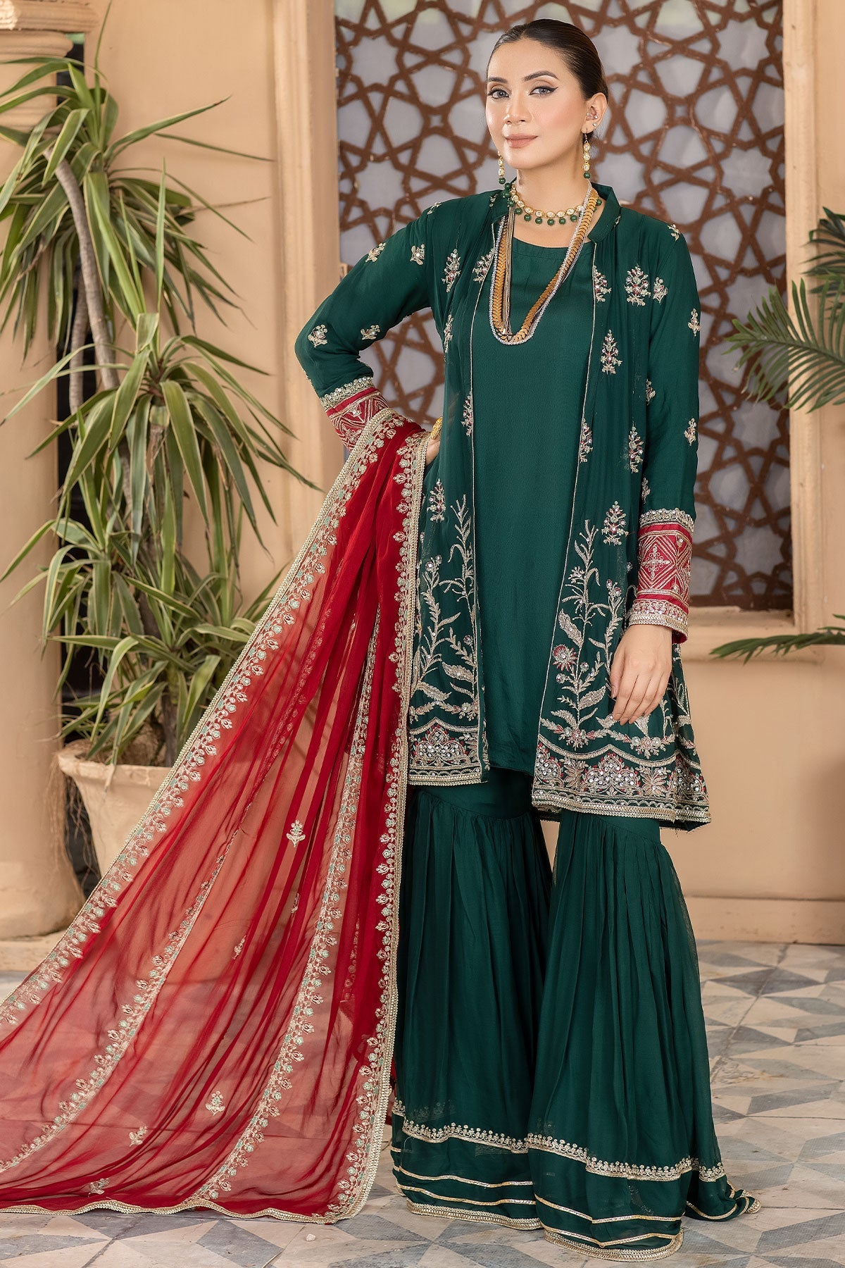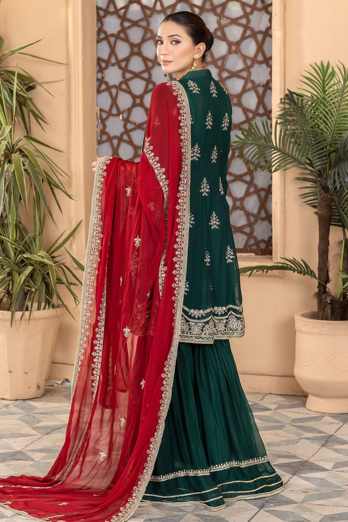 Look your best in this elegant outfit that features a stunningly embroidered chiffon short peplum style and stone work. Exuding sophistication, this classy ensemble includes a chiffon embroidered gharara, fancy laces, and a contrast chiffon dupatta. Look beautiful and feel confident!