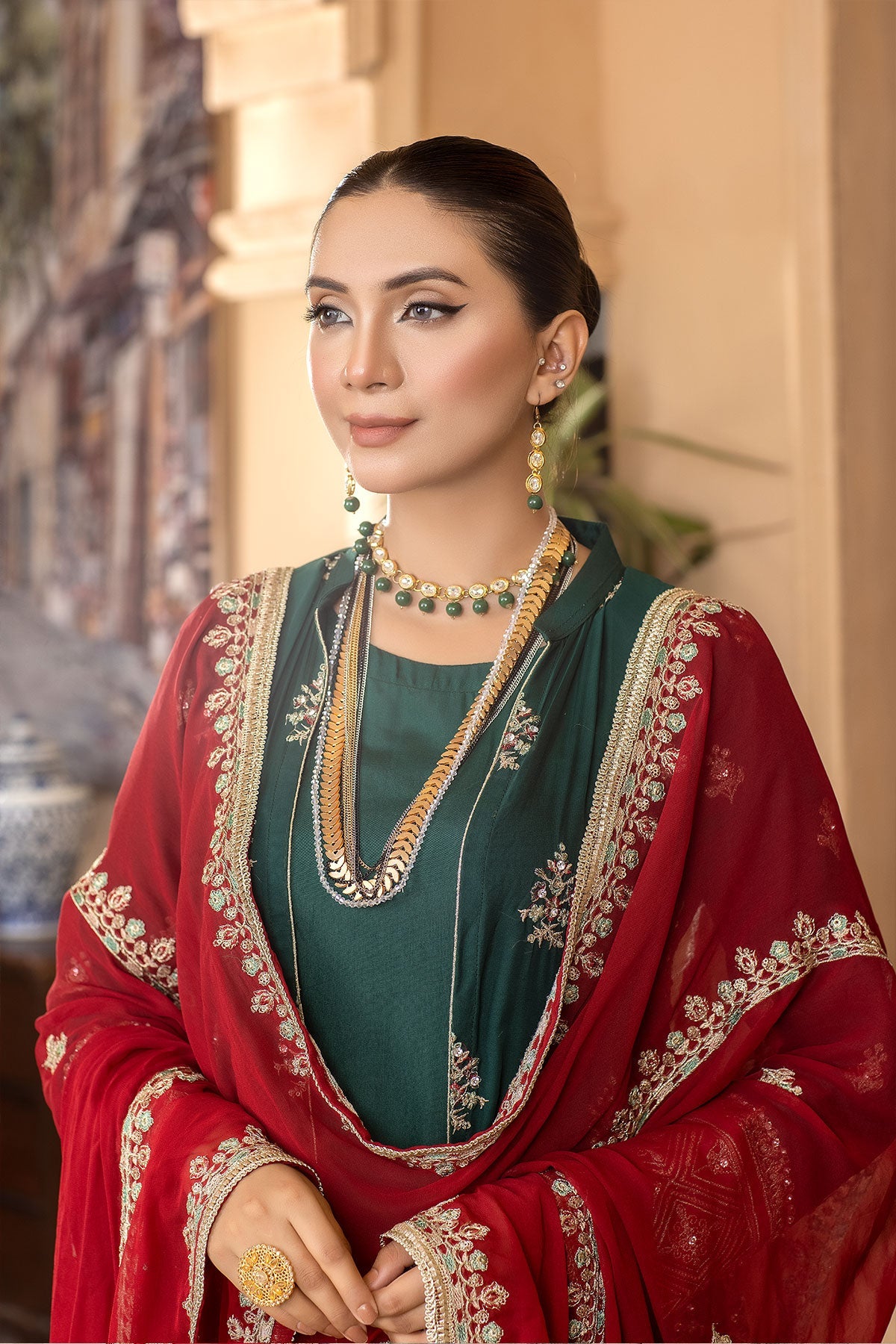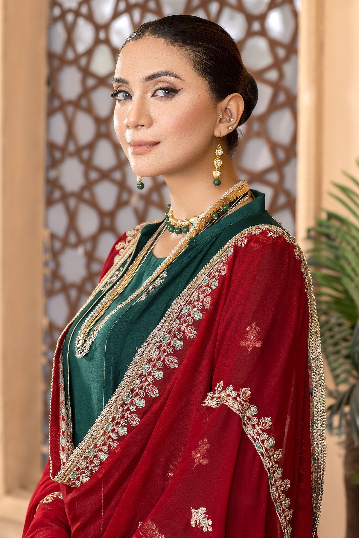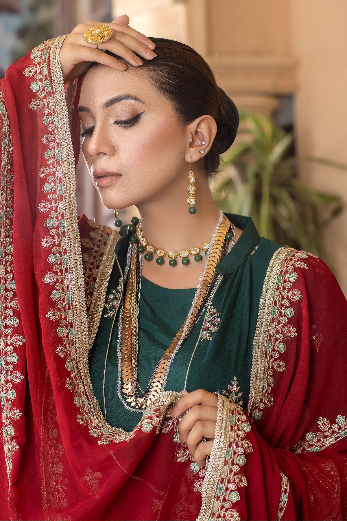 Look your best in this elegant outfit that features a stunningly embroidered chiffon short peplum style and stone work. Exuding sophistication, this classy ensemble includes a chiffon embroidered gharara, fancy laces, and a contrast chiffon dupatta. Look beautiful and feel confident!