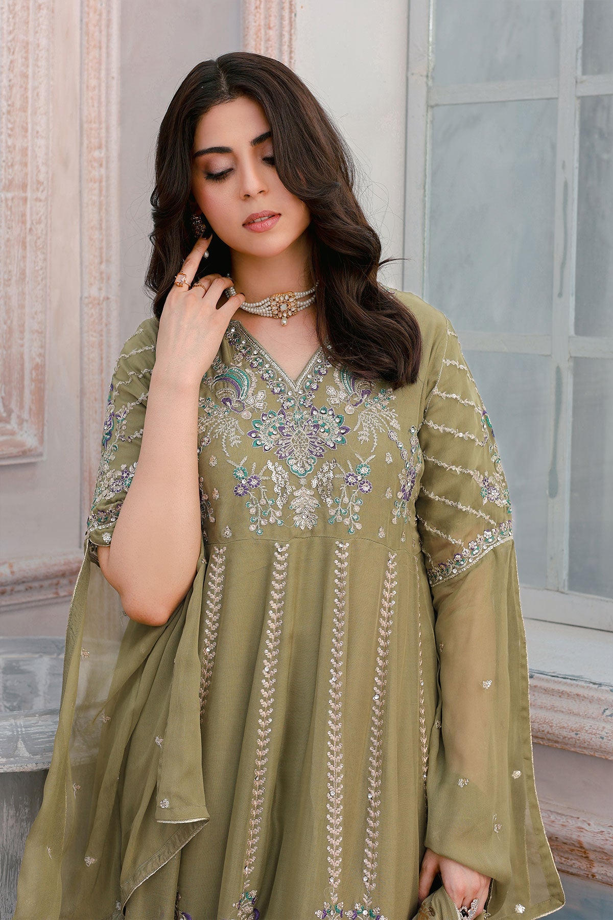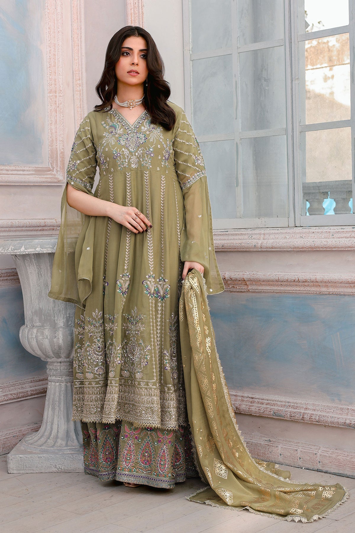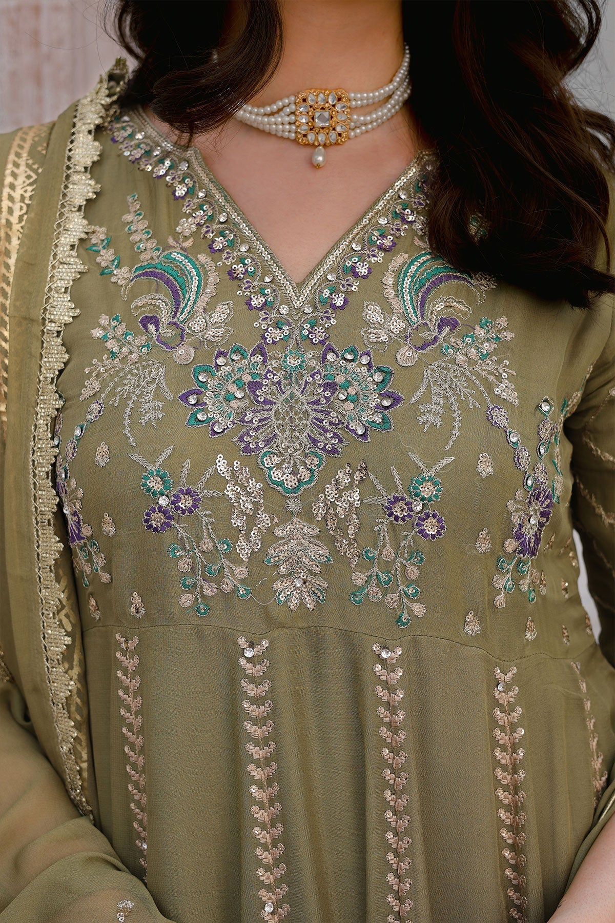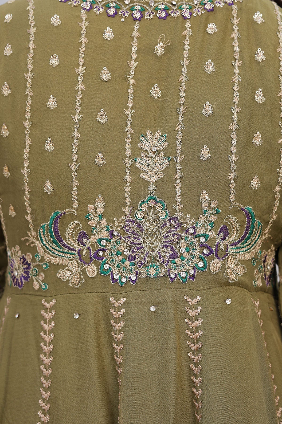 Get ready to turn heads. This chiffon wedding wear features stunning embroidery on both the front and back. Complete with stylish kaftan sleeves, a plain chiffon dupatta, and a comfortable viscose trouser, this outfit is perfect for any special occasion. Bonus: the pani print chiffon dupatta adds an extra touch of elegance.