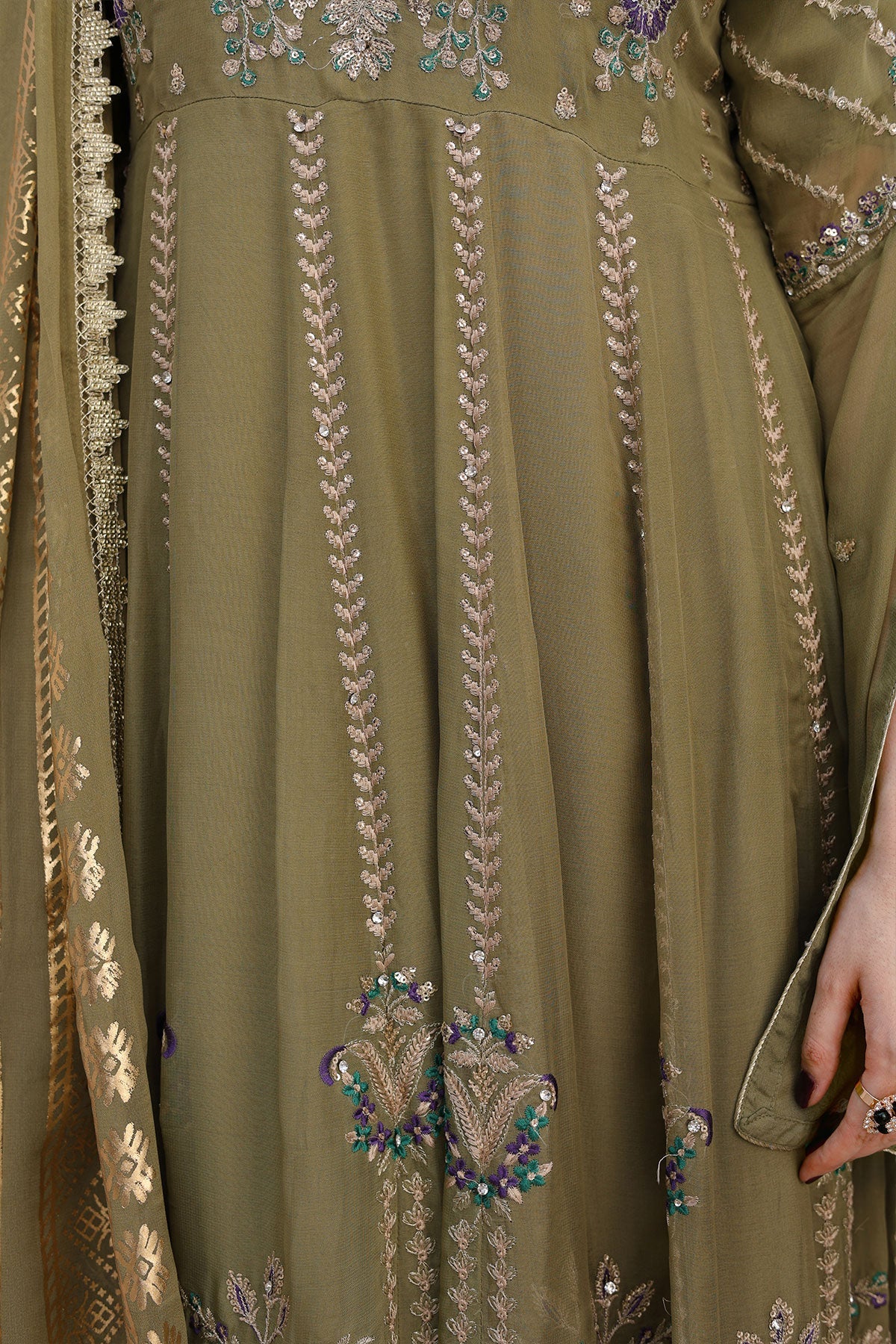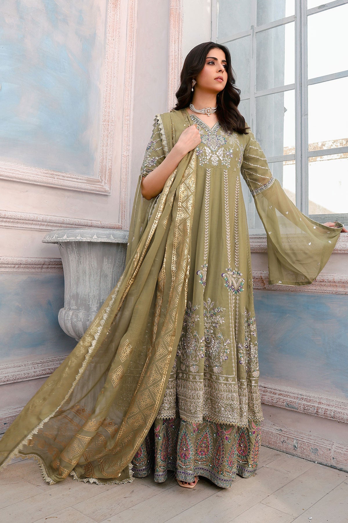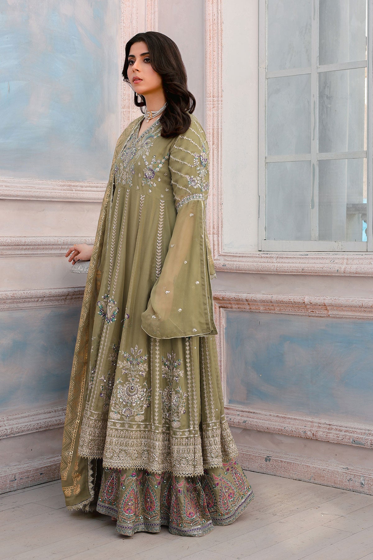 Get ready to turn heads. This chiffon wedding wear features stunning embroidery on both the front and back. Complete with stylish kaftan sleeves, a plain chiffon dupatta, and a comfortable viscose trouser, this outfit is perfect for any special occasion. Bonus: the pani print chiffon dupatta adds an extra touch of elegance.