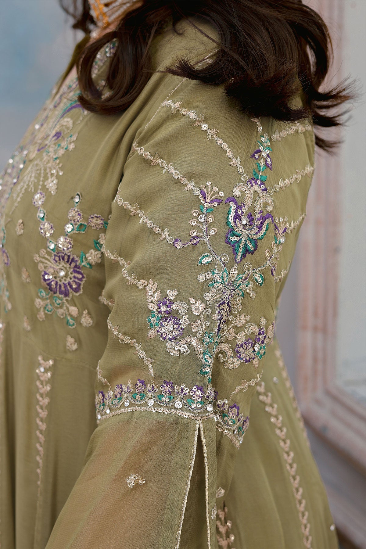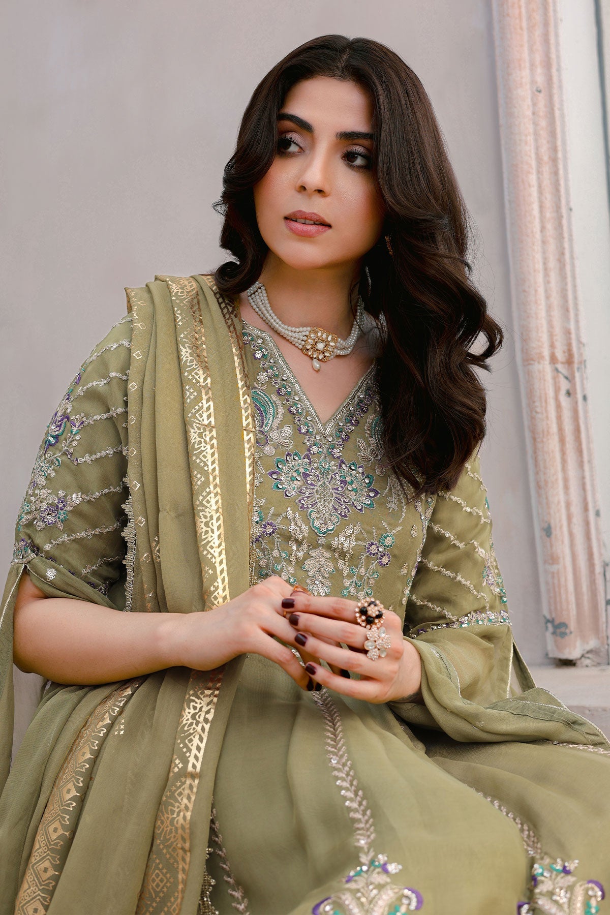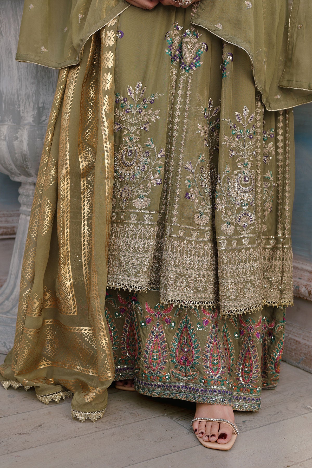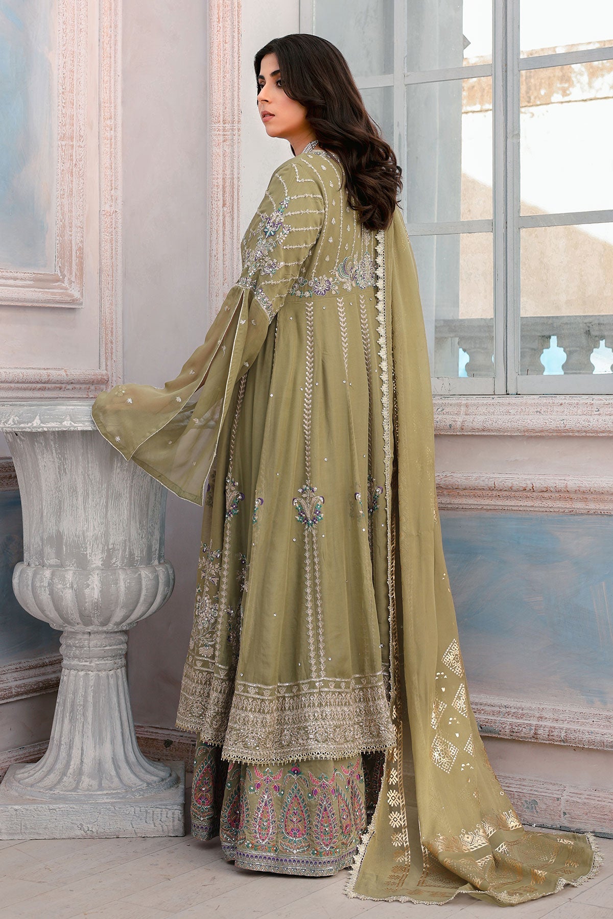 Get ready to turn heads. This chiffon wedding wear features stunning embroidery on both the front and back. Complete with stylish kaftan sleeves, a plain chiffon dupatta, and a comfortable viscose trouser, this outfit is perfect for any special occasion. Bonus: the pani print chiffon dupatta adds an extra touch of elegance.