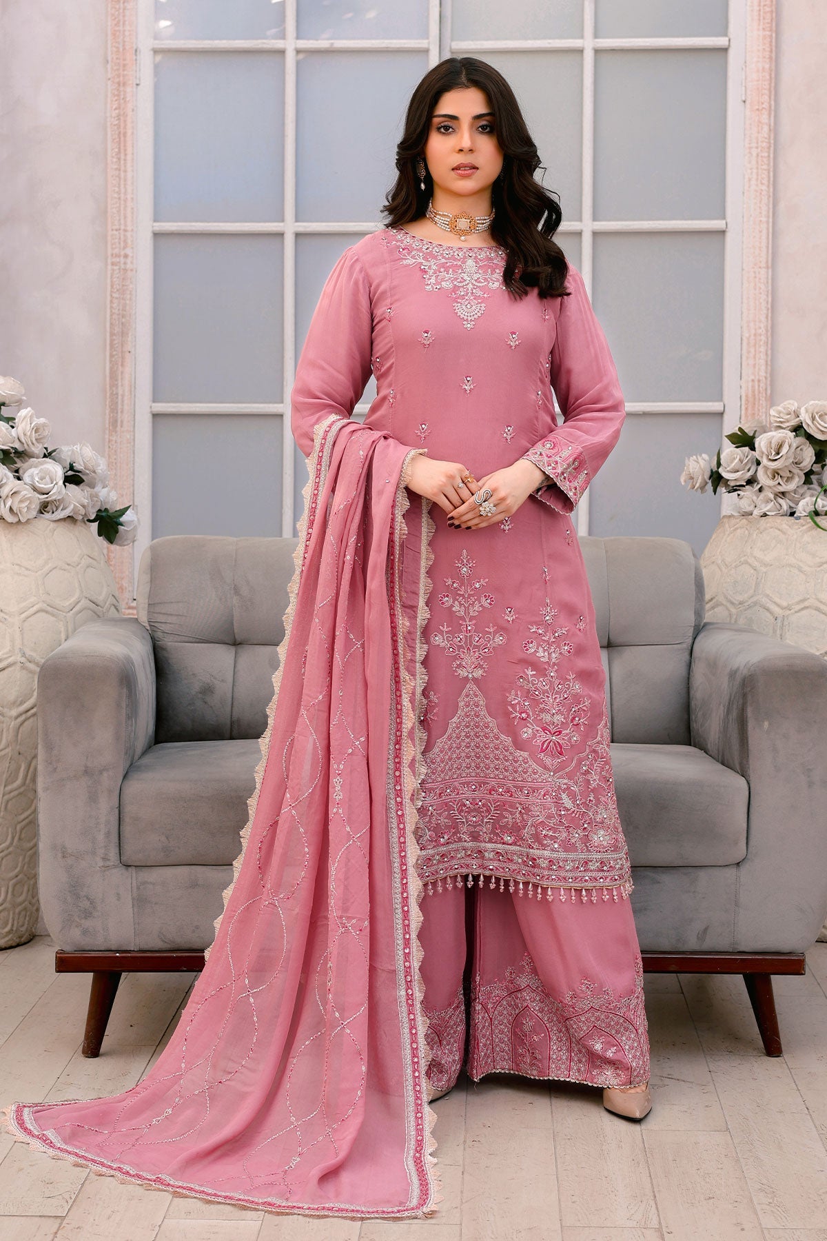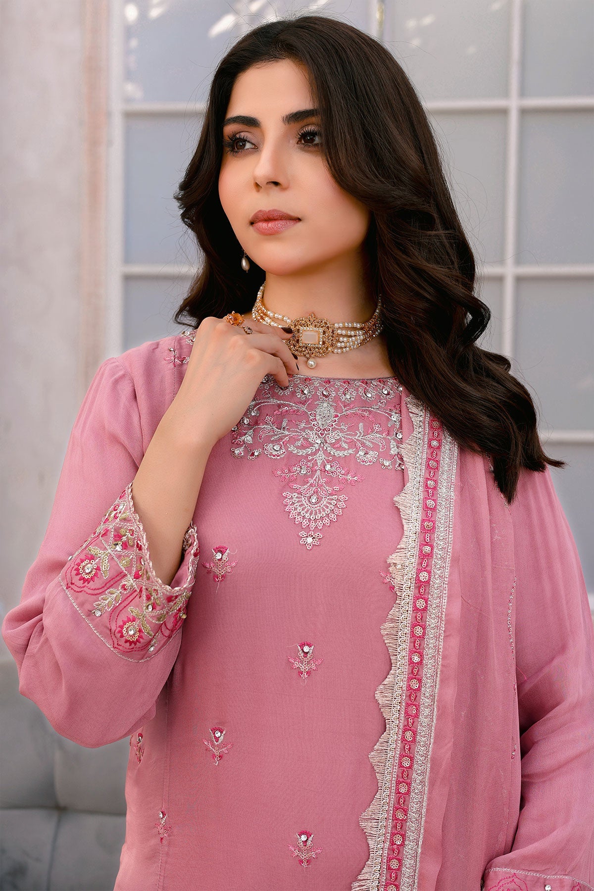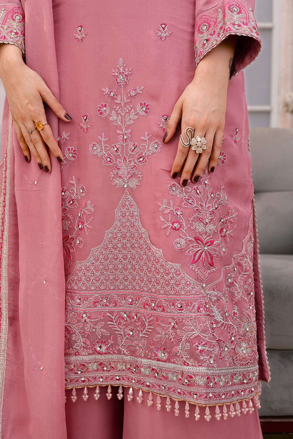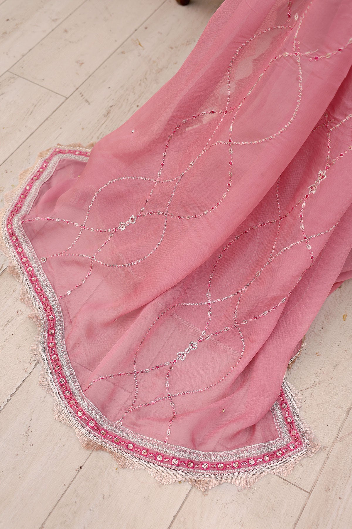 Elevate your elegance. This beautiful attire is adorned with intricate embroidery on chiffon, complemented by tussle lace for a touch of sophistication. The embroidered sleeves, sharara, and dupatta feature delicate stone work and lace details, elevating your overall look. Make a statement.
