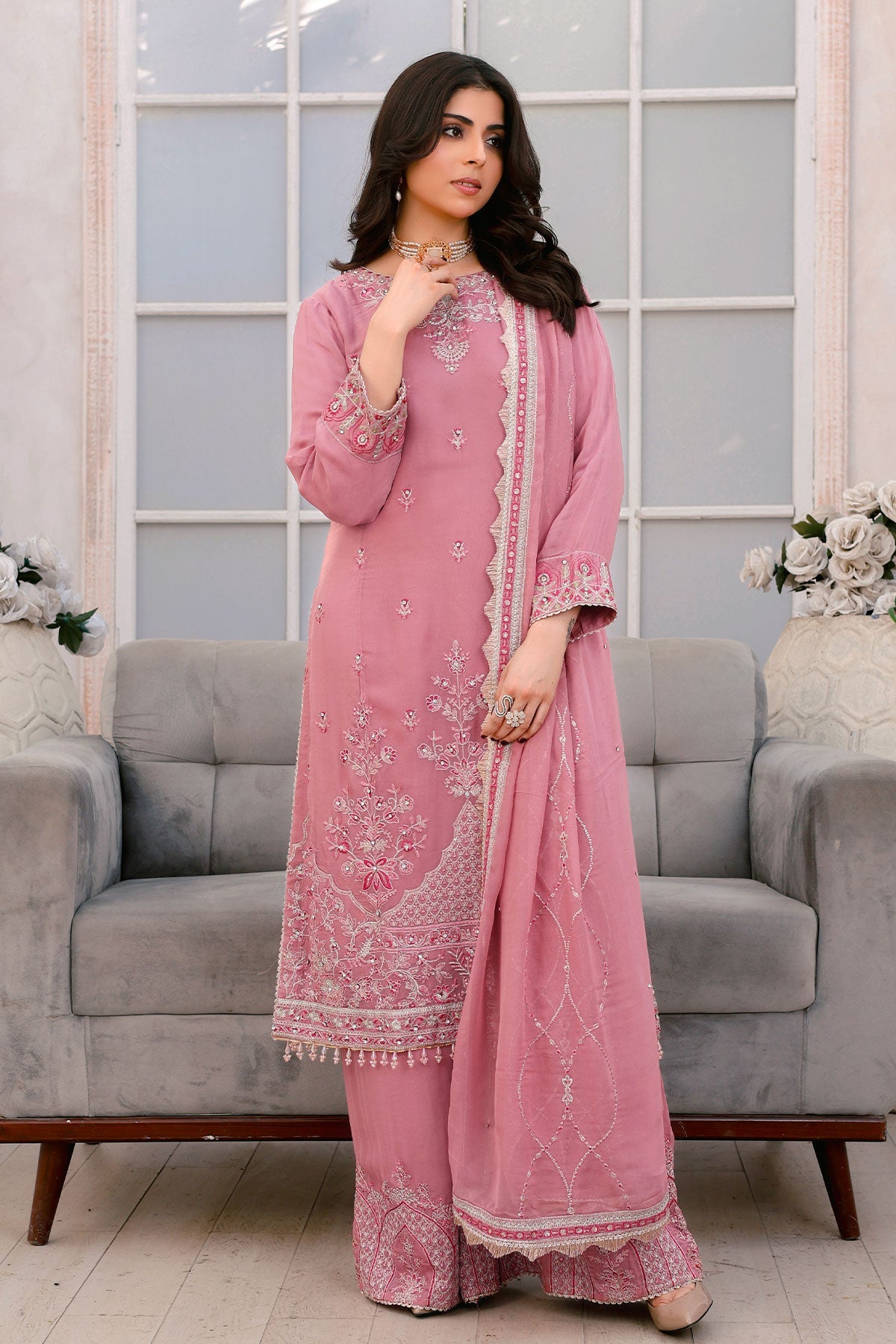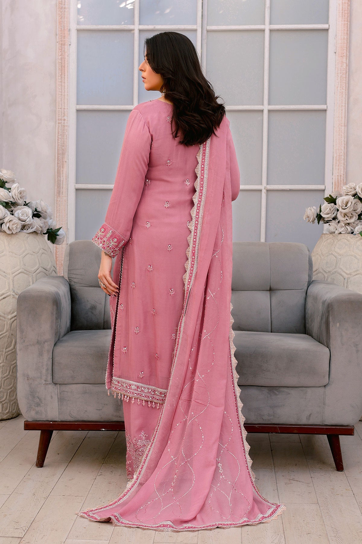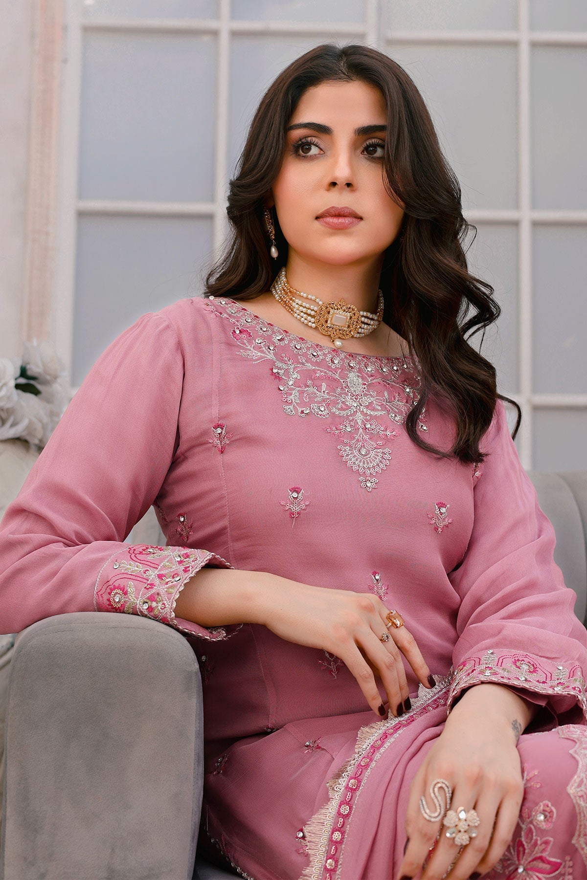 Elevate your elegance. This beautiful attire is adorned with intricate embroidery on chiffon, complemented by tussle lace for a touch of sophistication. The embroidered sleeves, sharara, and dupatta feature delicate stone work and lace details, elevating your overall look. Make a statement.