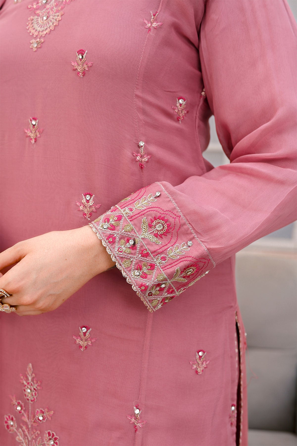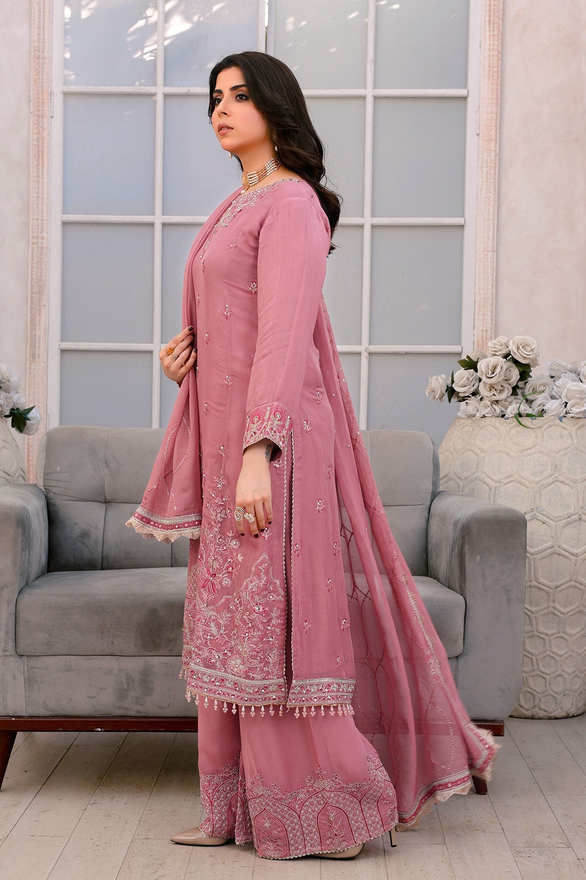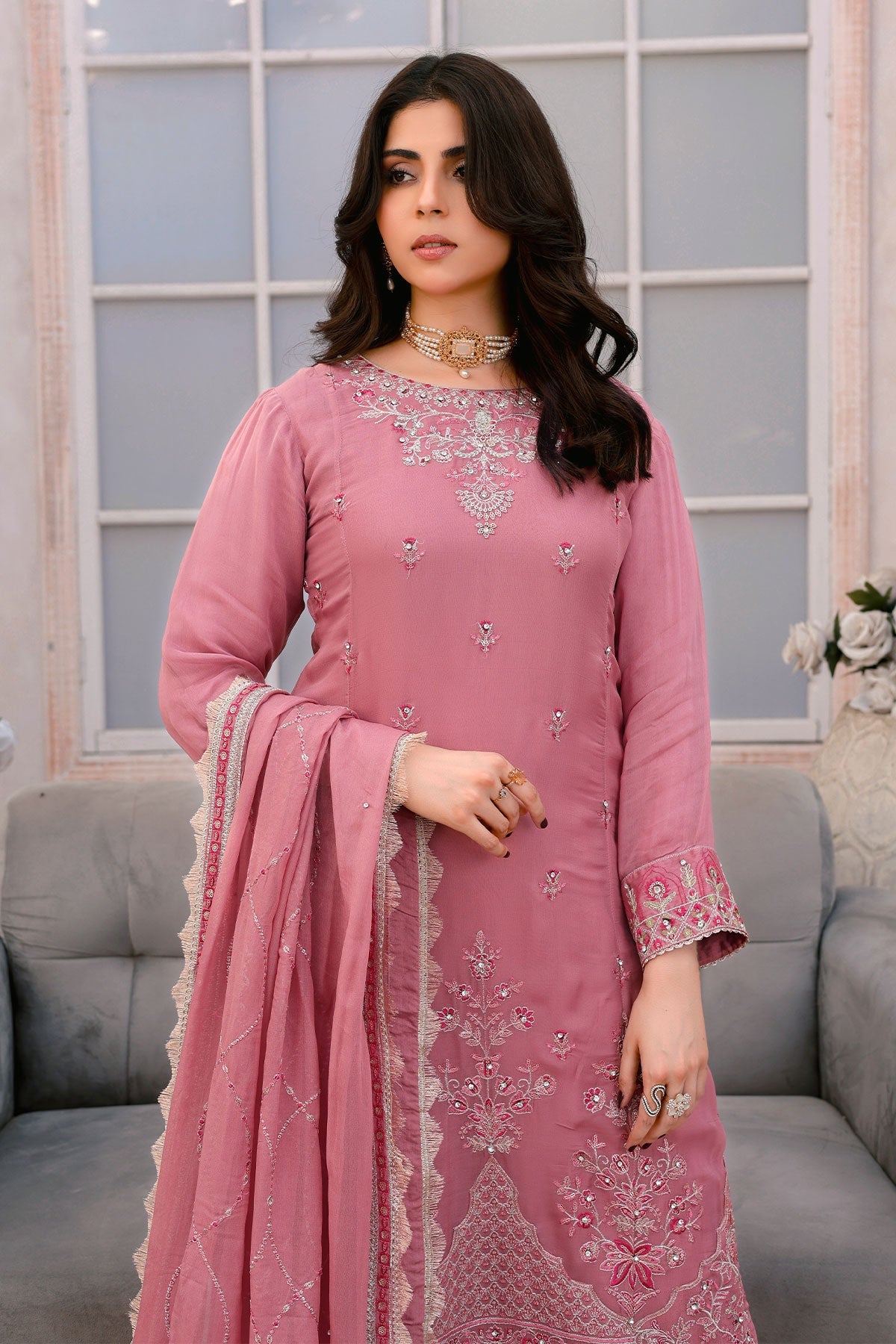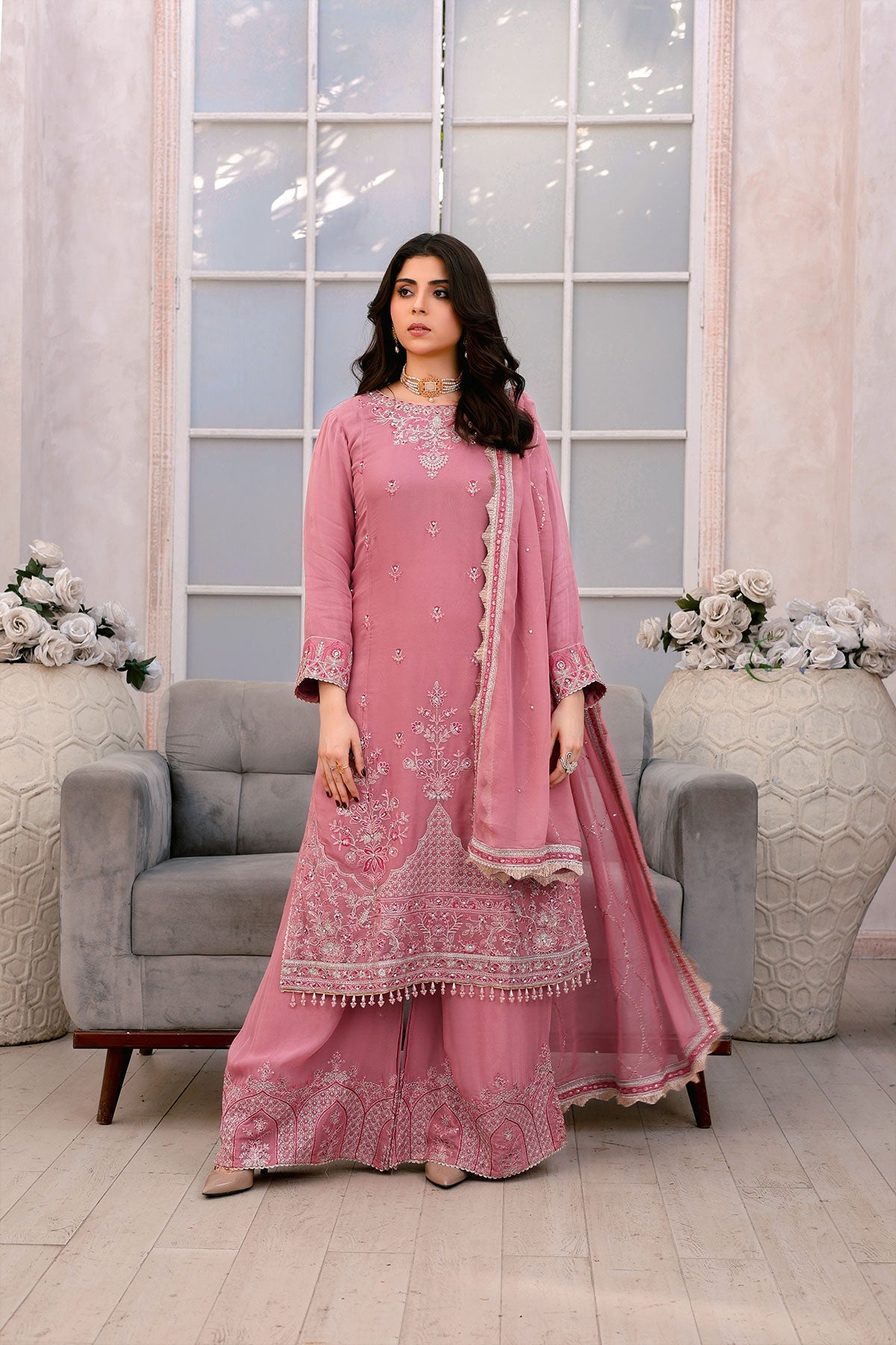 Elevate your elegance. This beautiful attire is adorned with intricate embroidery on chiffon, complemented by tussle lace for a touch of sophistication. The embroidered sleeves, sharara, and dupatta feature delicate stone work and lace details, elevating your overall look. Make a statement.
