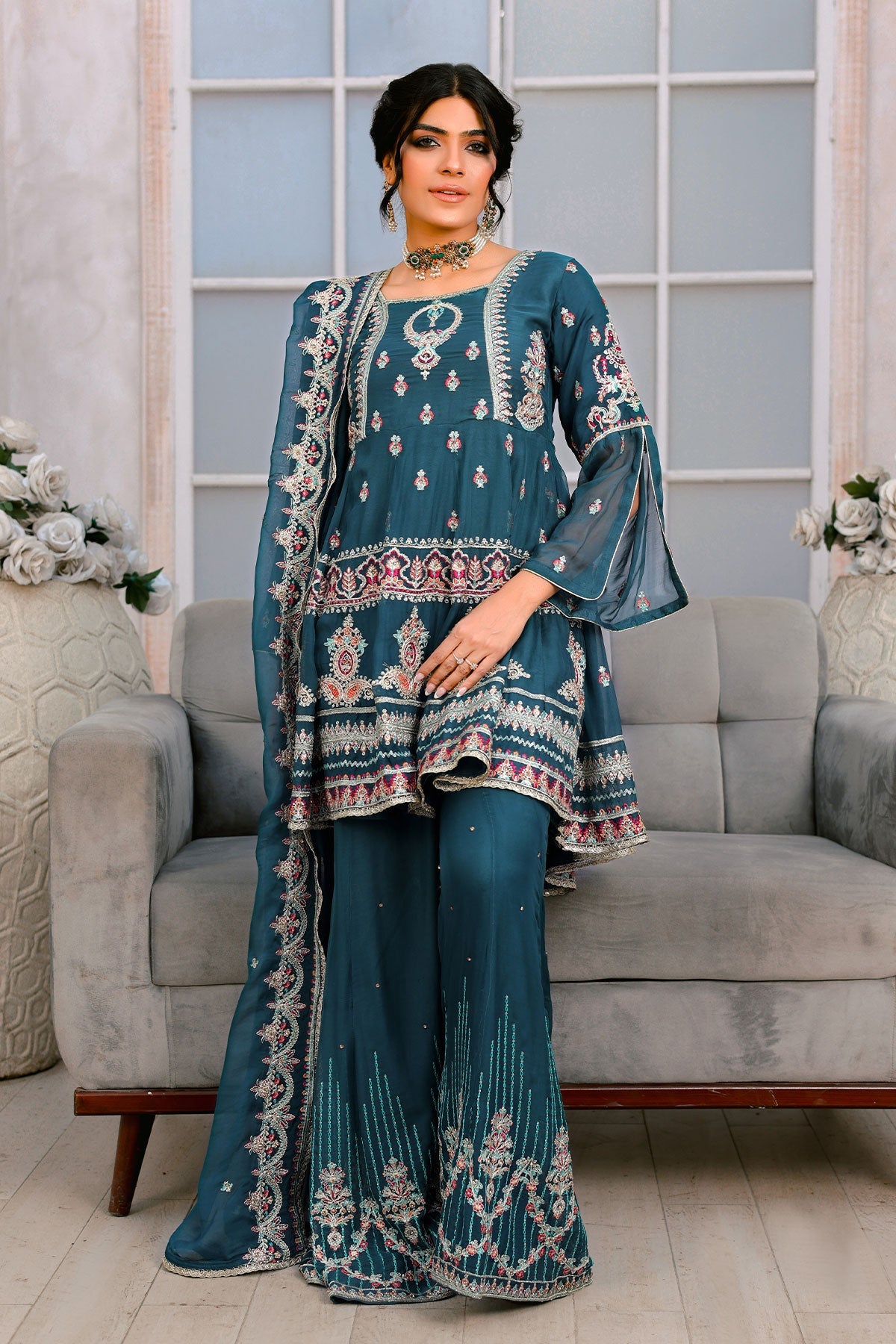 This features embroidered peplum on chiffon, completed with stone and lace work, as well as embroidered sleeves. The elegant chiffon sharara and dupatta are also embroidered with stone and lace work, giving off an air of sophistication.