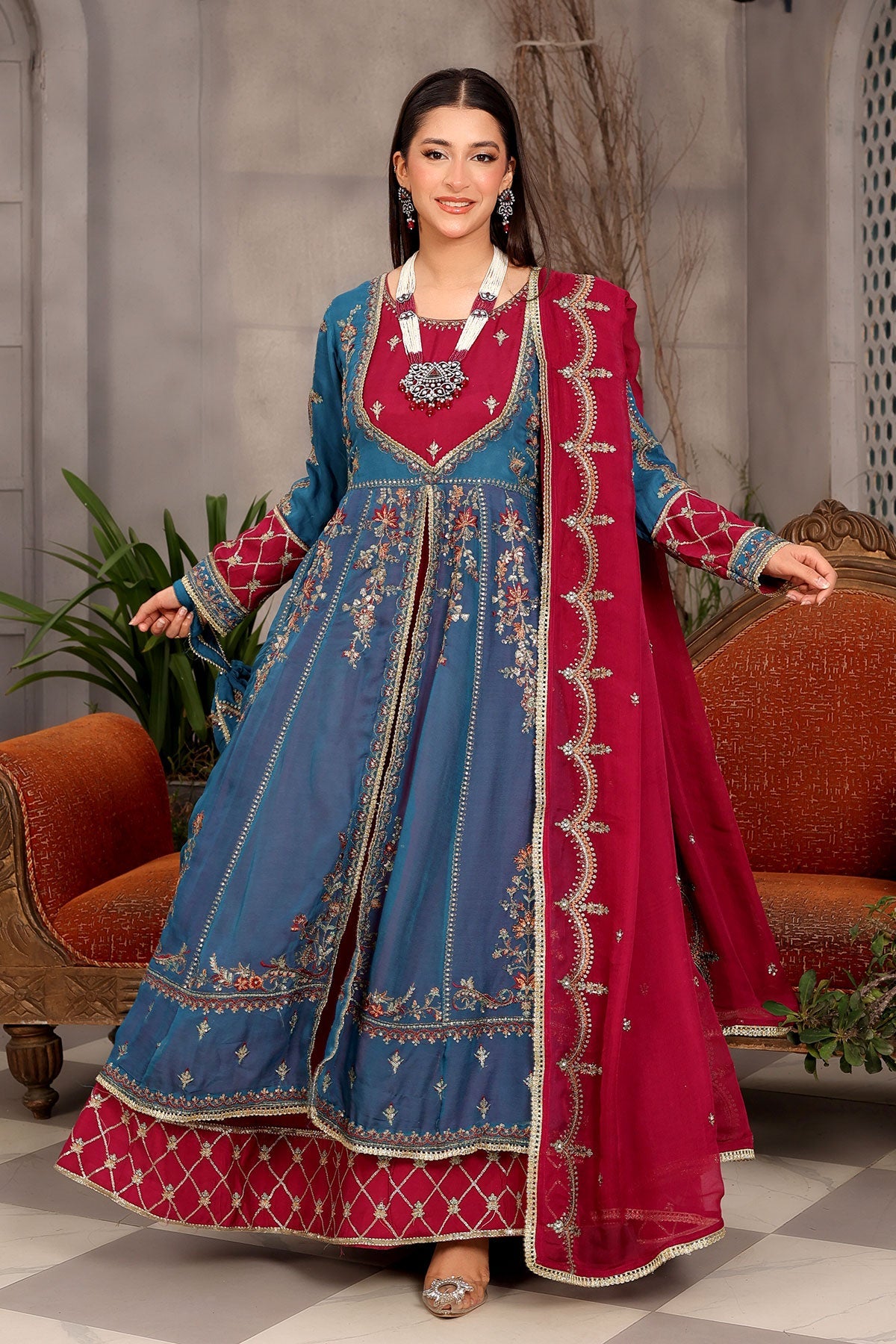 Your perfect wedding wear! This long maxi style dress features a stunning embroidered front and back on chiffon finished lace with intricate stone work. The inner is made of soft and comfortable plain viscose, and comes with a matching plain viscose trouser. Complete the look with the beautifully embroidered chiffon dupatta finished with lace. Get ready to turn heads at any wedding event.