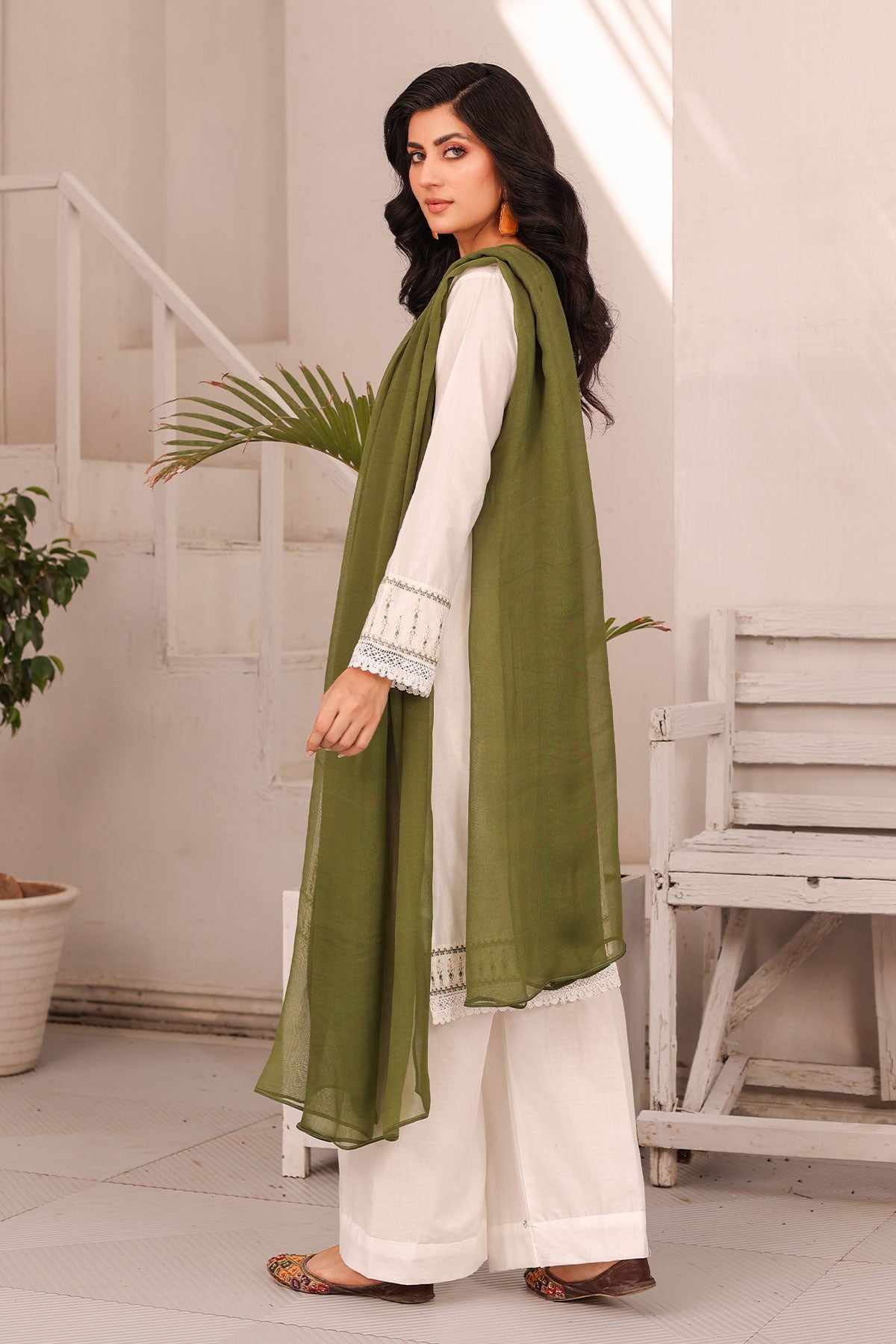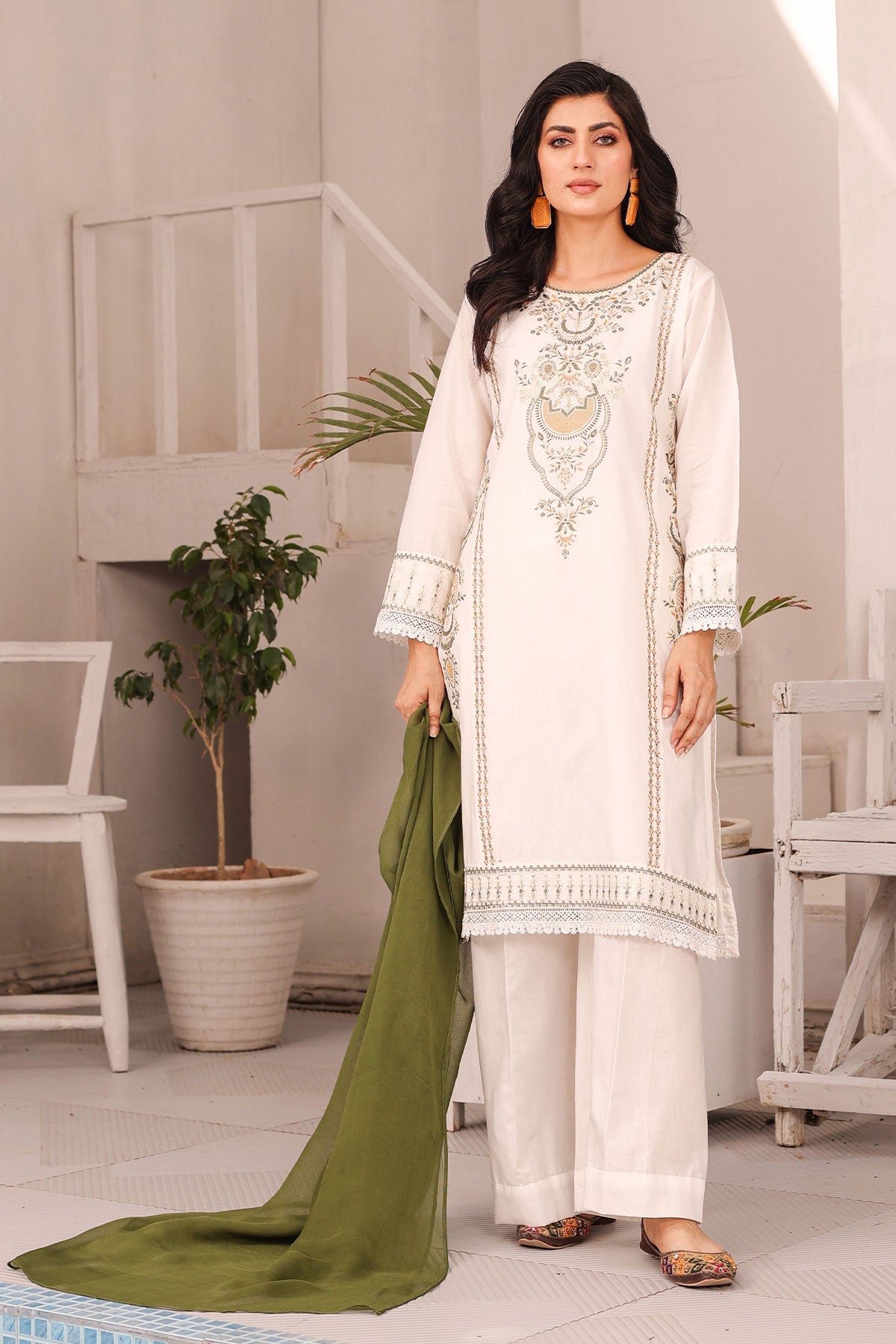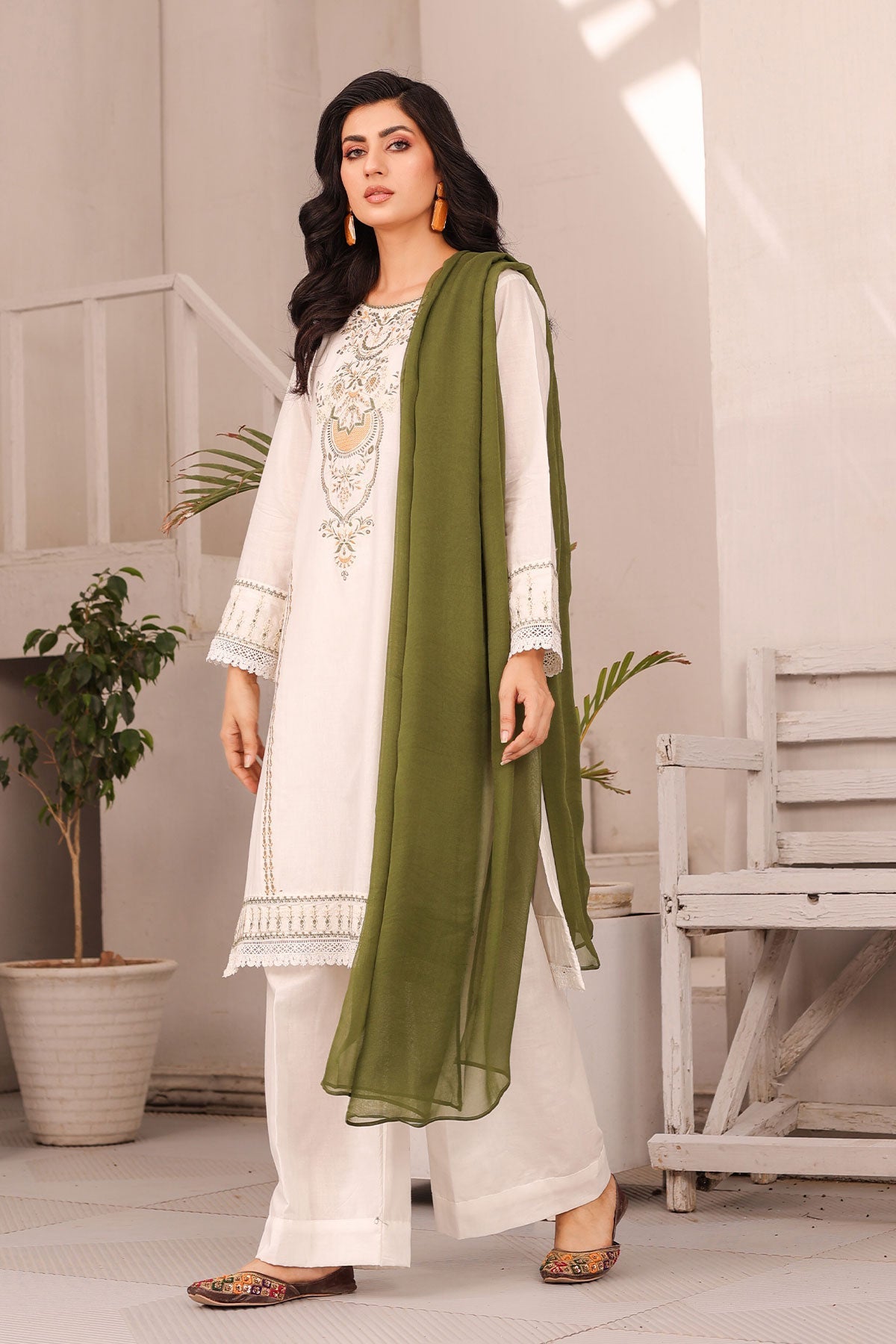 Get ready to elevate your style! The beautifully embroidered front panels on soft cotton, finished with delicate lace work, add a touch of elegance to your outfit. The plain cotton bell trouser provides comfort while the contrast chiffon dupatta completes the look. Perfect for your Eid celebration.