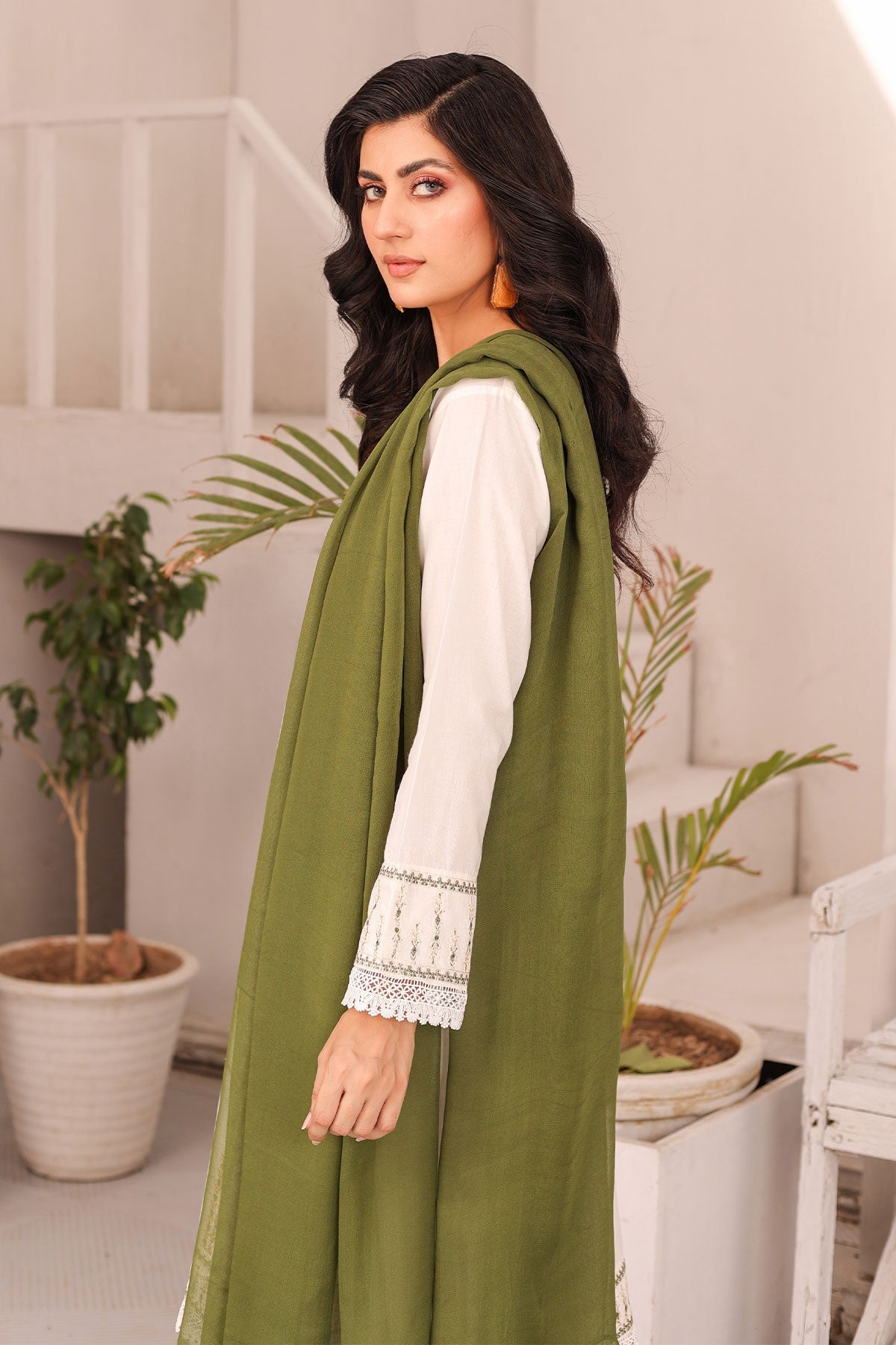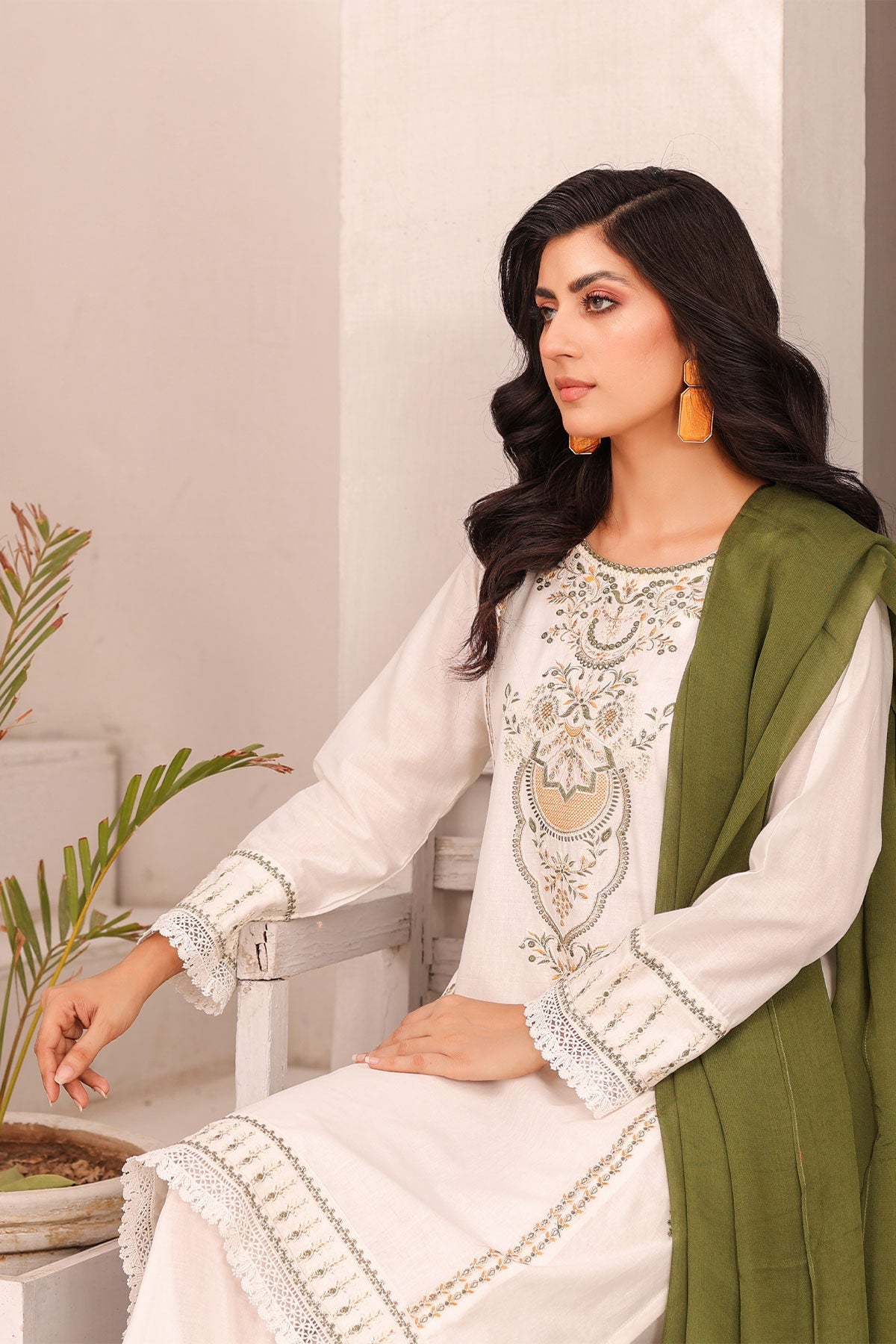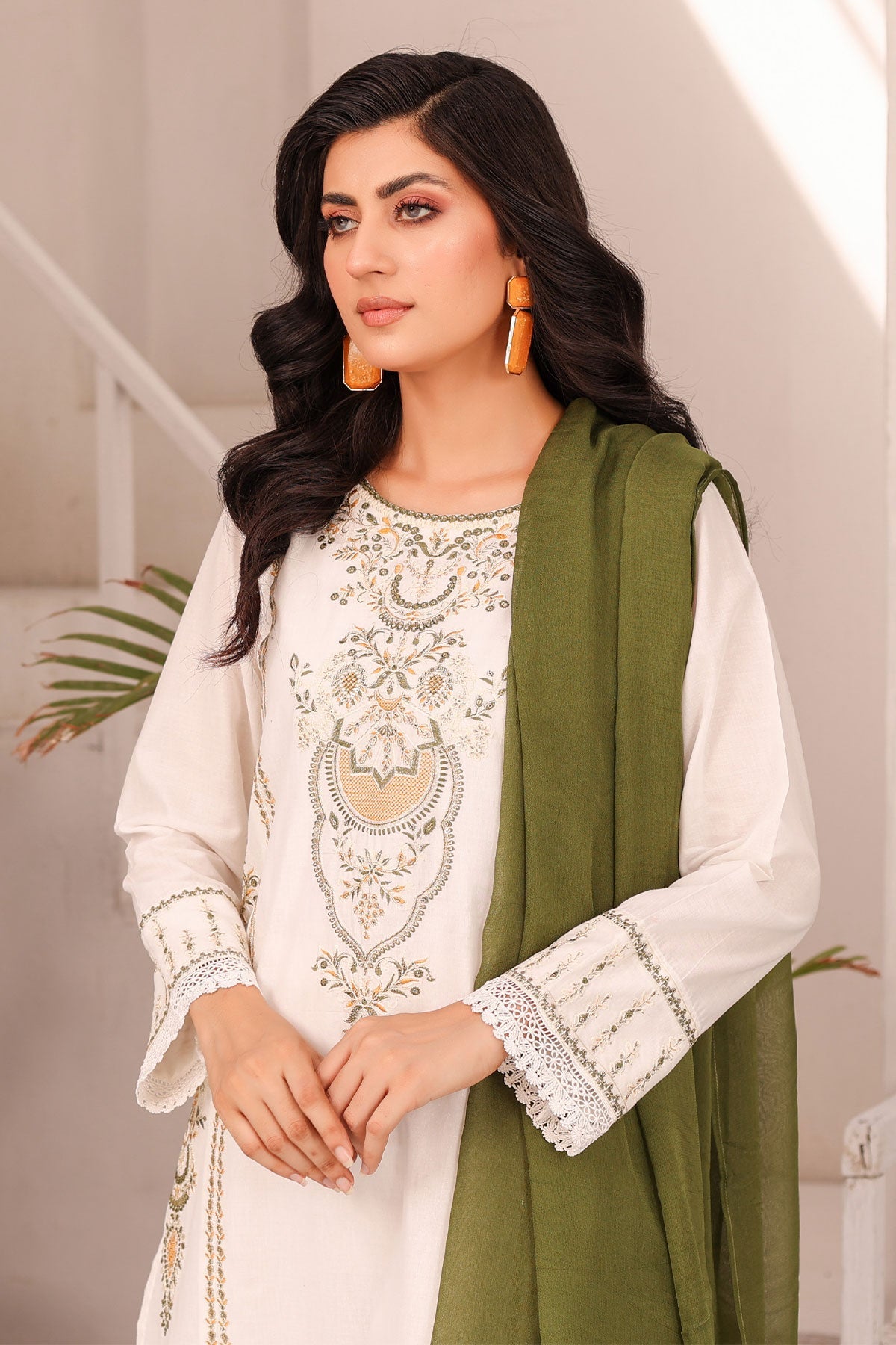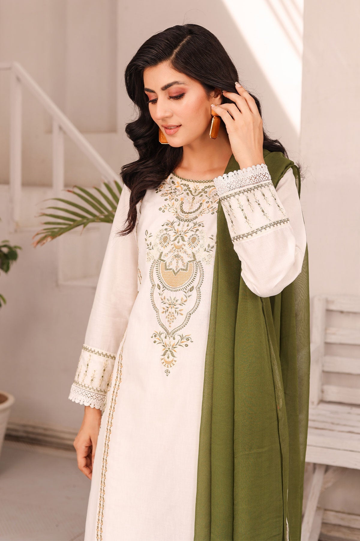 Get ready to elevate your style! The beautifully embroidered front panels on soft cotton, finished with delicate lace work, add a touch of elegance to your outfit. The plain cotton bell trouser provides comfort while the contrast chiffon dupatta completes the look. Perfect for your Eid celebration.